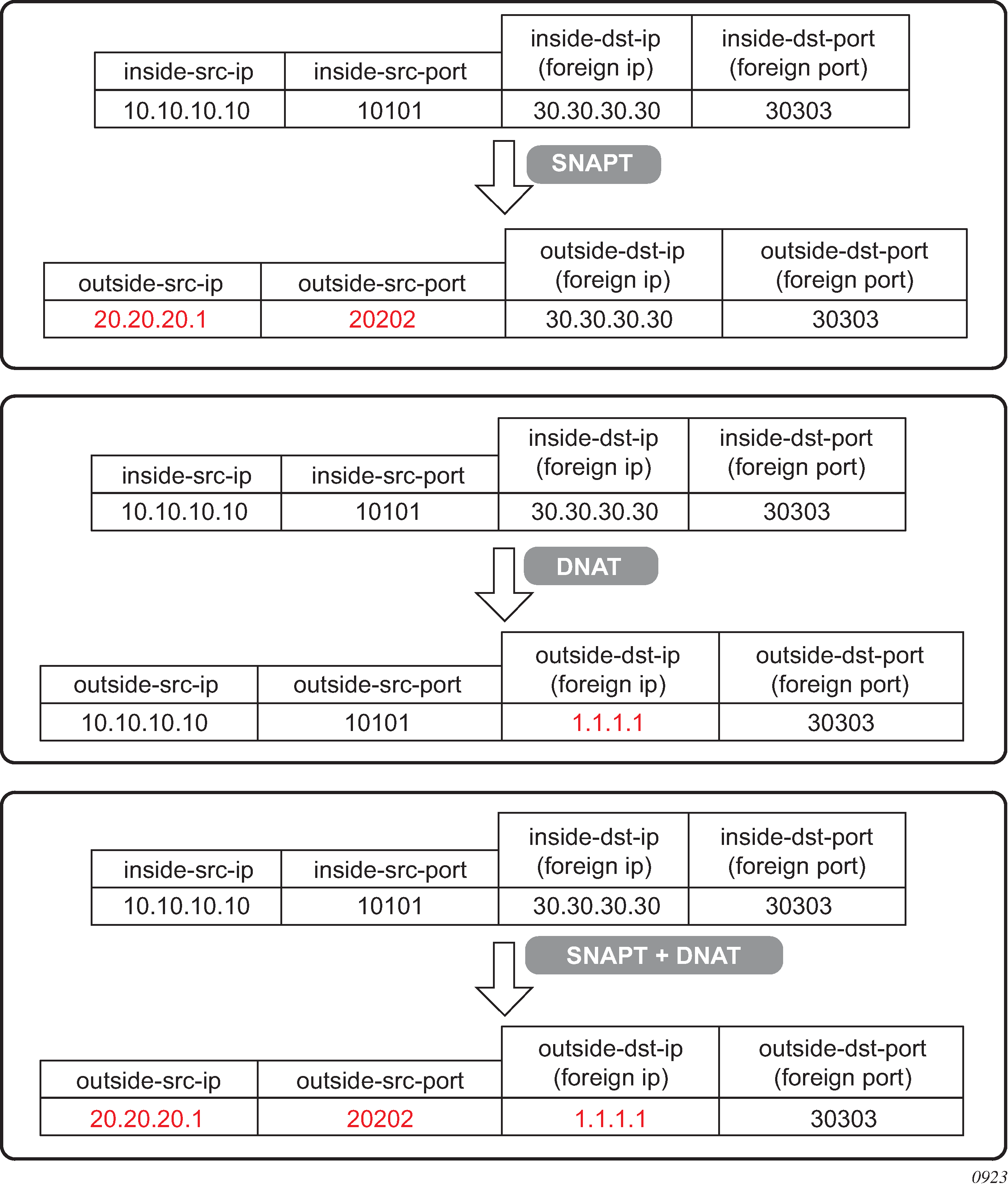 Network Address Translation devices modify the IP headers of packets between a host and server, changing some or all of the source address, destination address, source port (TCP/UDP), destination port (TCP/UDP), or ICMP query ID (for ping). The 7750 SR in both NAT modes performs Source Network Address and Port Translation (S-NAPT). S-NAPT devices are commonly deployed in residential gateways and enterprise firewalls to allow multiple hosts to share one or more public IPv4 addresses to access the Internet. The common terms of inside and outside in the context of NAT refer to devices inside the NAT (that is behind or masqueraded by the NAT) and outside the NAT, on the public Internet.