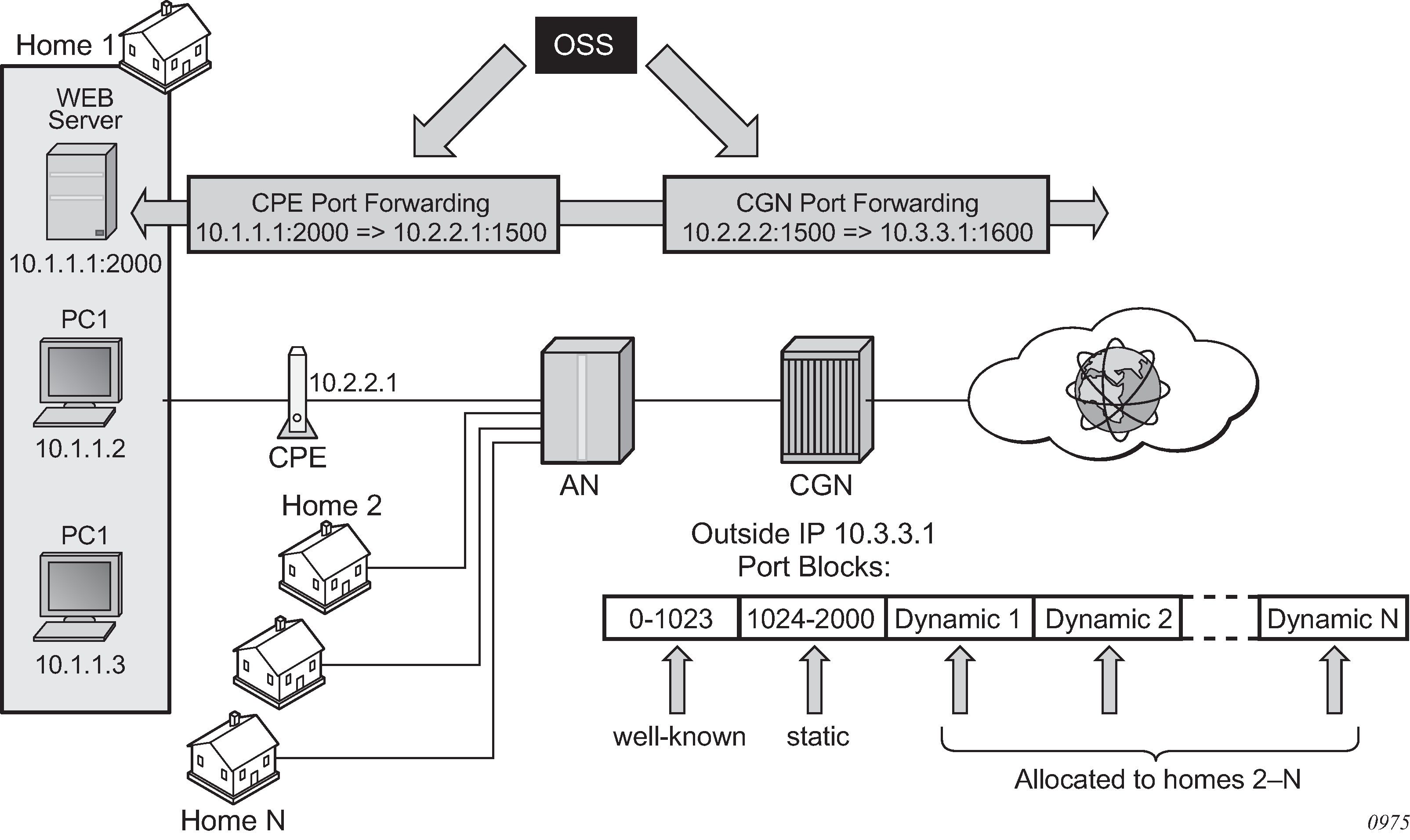 A static port forward for the WEB server in Home 1 is allocated in the CPE and the CGN. At the time of static port forward creation, no other dynamic port blocks for Home 1 exist (PCs are powered off).