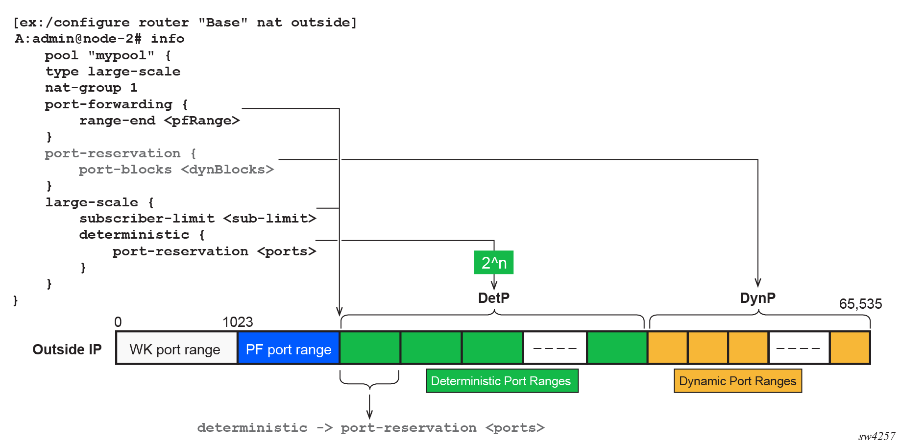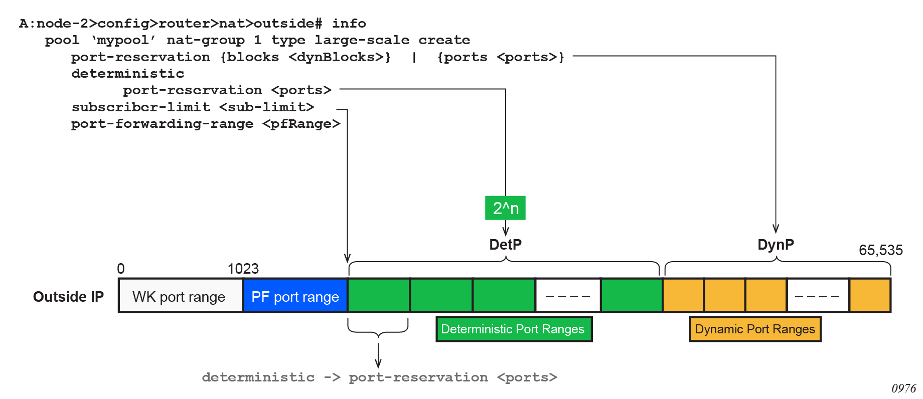 This is a mode of operation where mappings between the NAT subscriber and the outside IP address and port-range are allocated at the time of configuration. Each subscriber is permanently mapped to an outside IP and a dedicated port block. This dedicated port block is referred to as deterministic port block. Logging is not needed as the reverse mapping can be obtained using a known formula. The subscriber’s ports can be expanded by allocating a dynamic port block in case that all ports in deterministic port block are exhausted. In such case logging for the dynamic port block allocation/de-allocation is required.