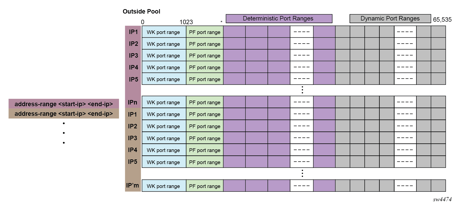 Port range blocks are configurable as part of outside pool configuration, allowing the operator to specify the number of ports allocated to each subscriber when a mapping is created. When a range is allocated to the subscriber, these ports are used for all outbound dynamic mappings and are assigned in a random manner to minimize the predictability of port allocations (draft-ietf-tsvwg-port-randomization-05).