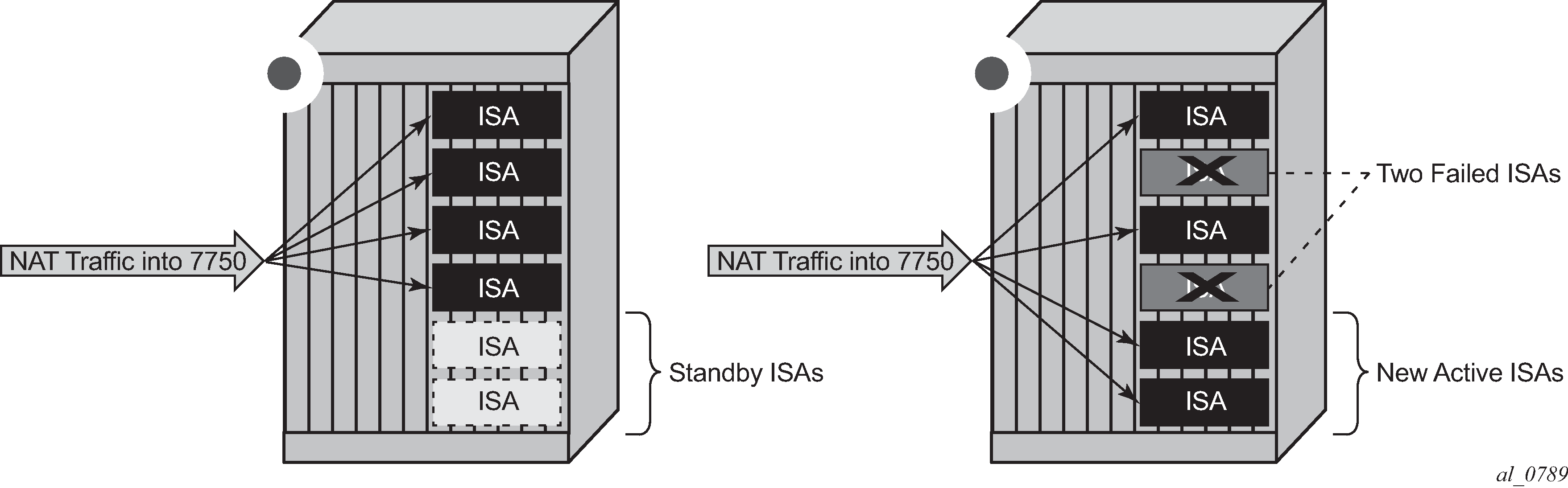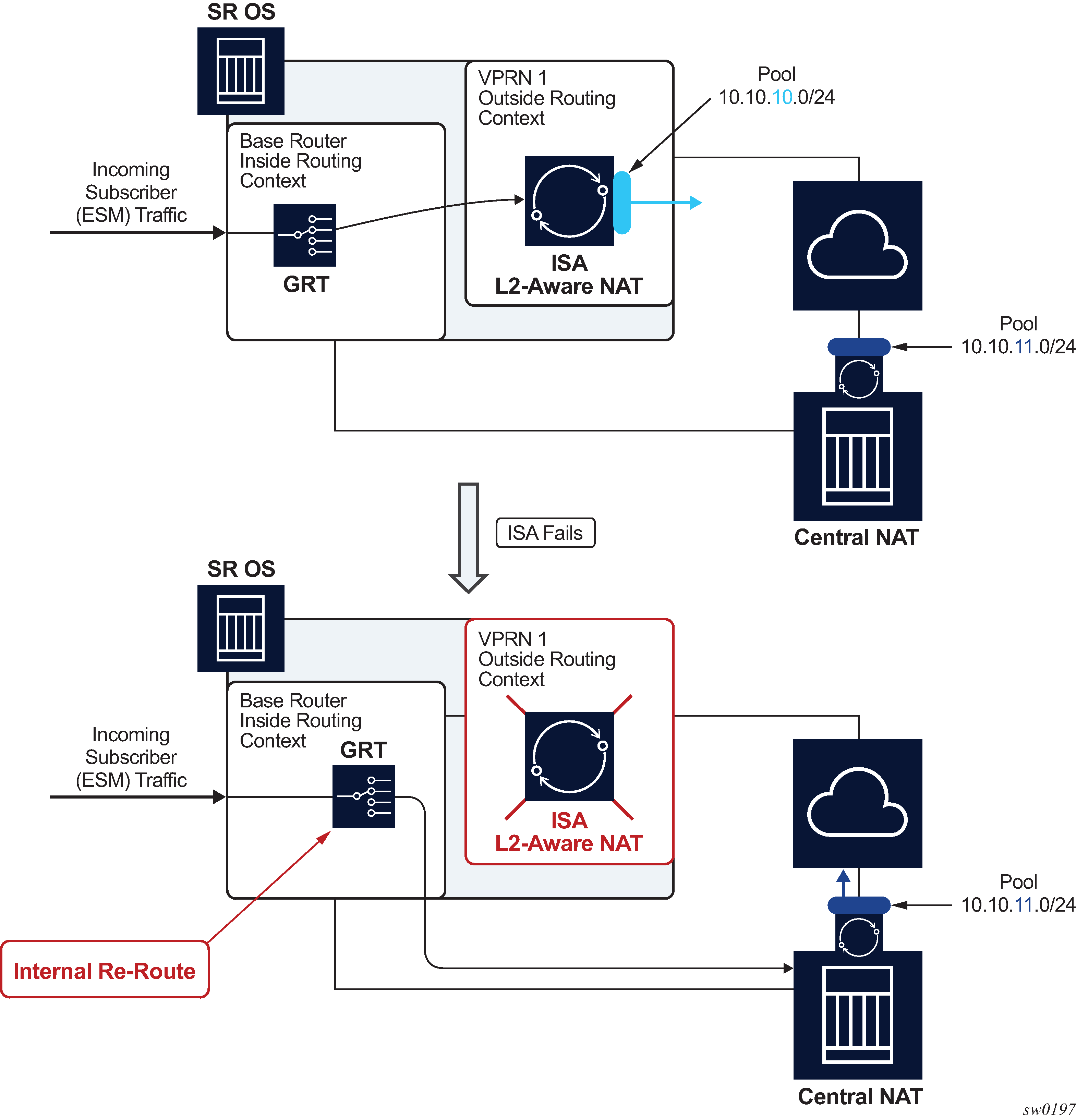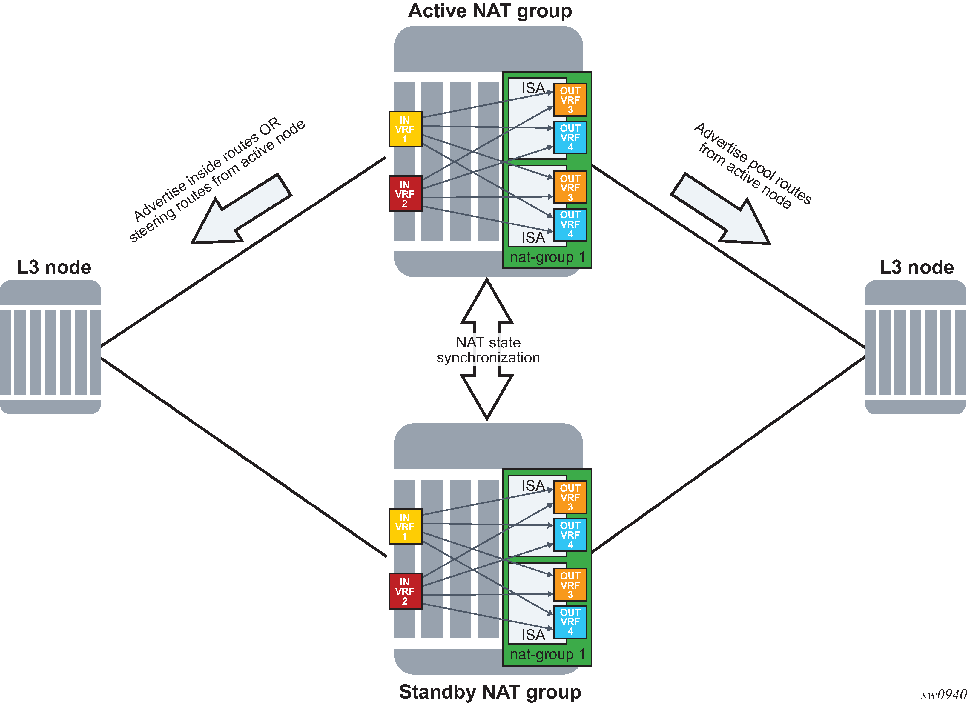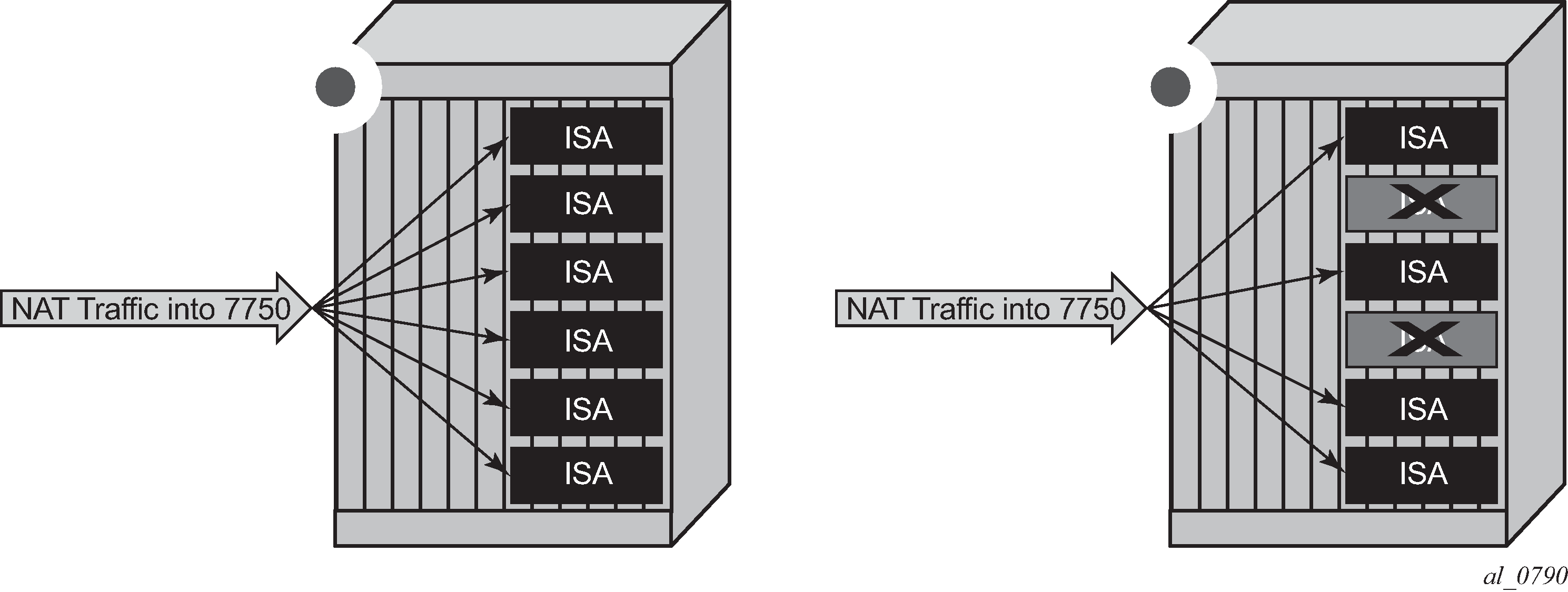 NAT traffic in SR OS is distributed over ISAs and ESAs within each NAT group. This allows NAT capacity to grow incrementally by adding more ISAs and ESAs to the system, while each ISA or ESA participates equally in load sharing.