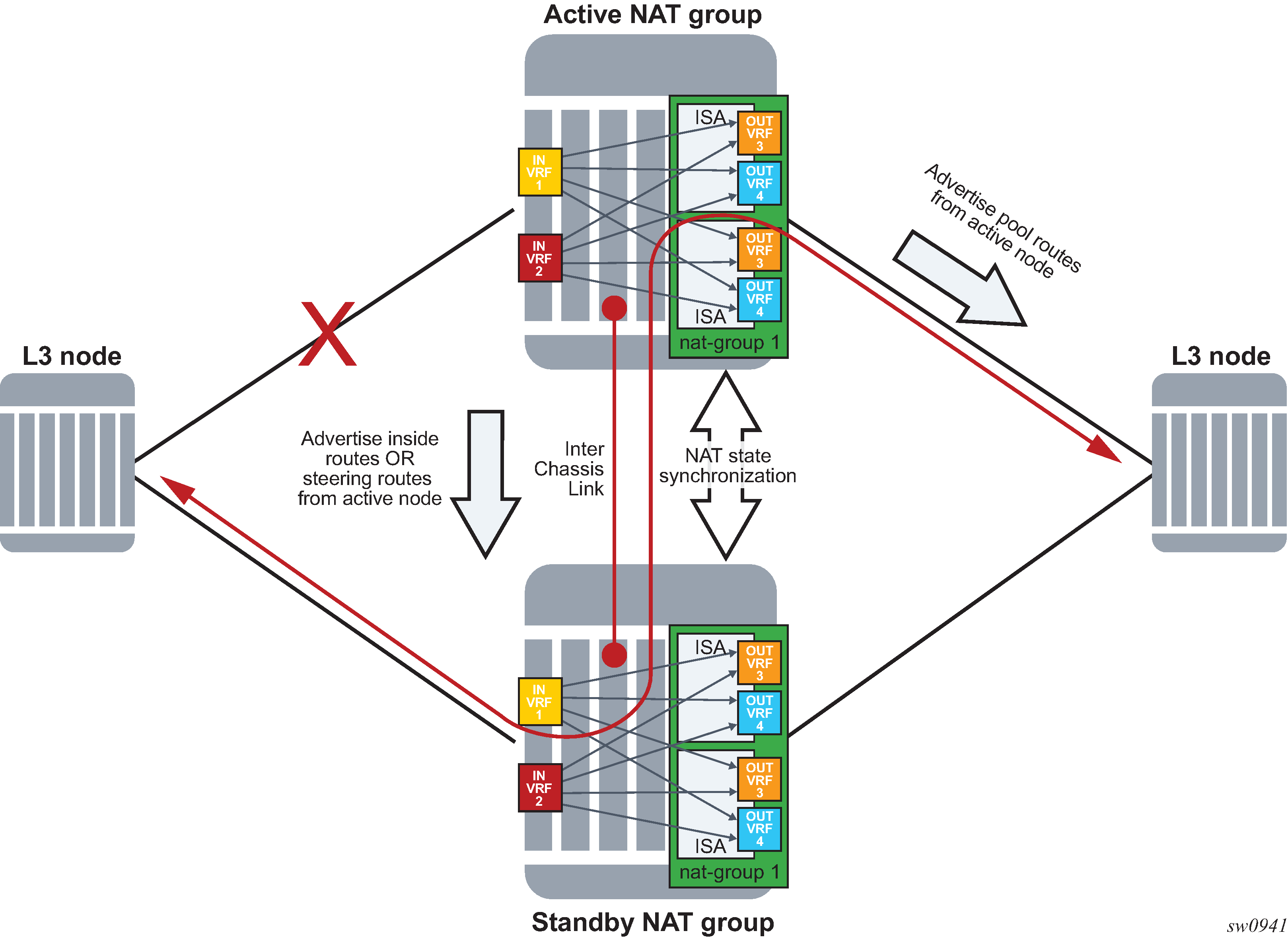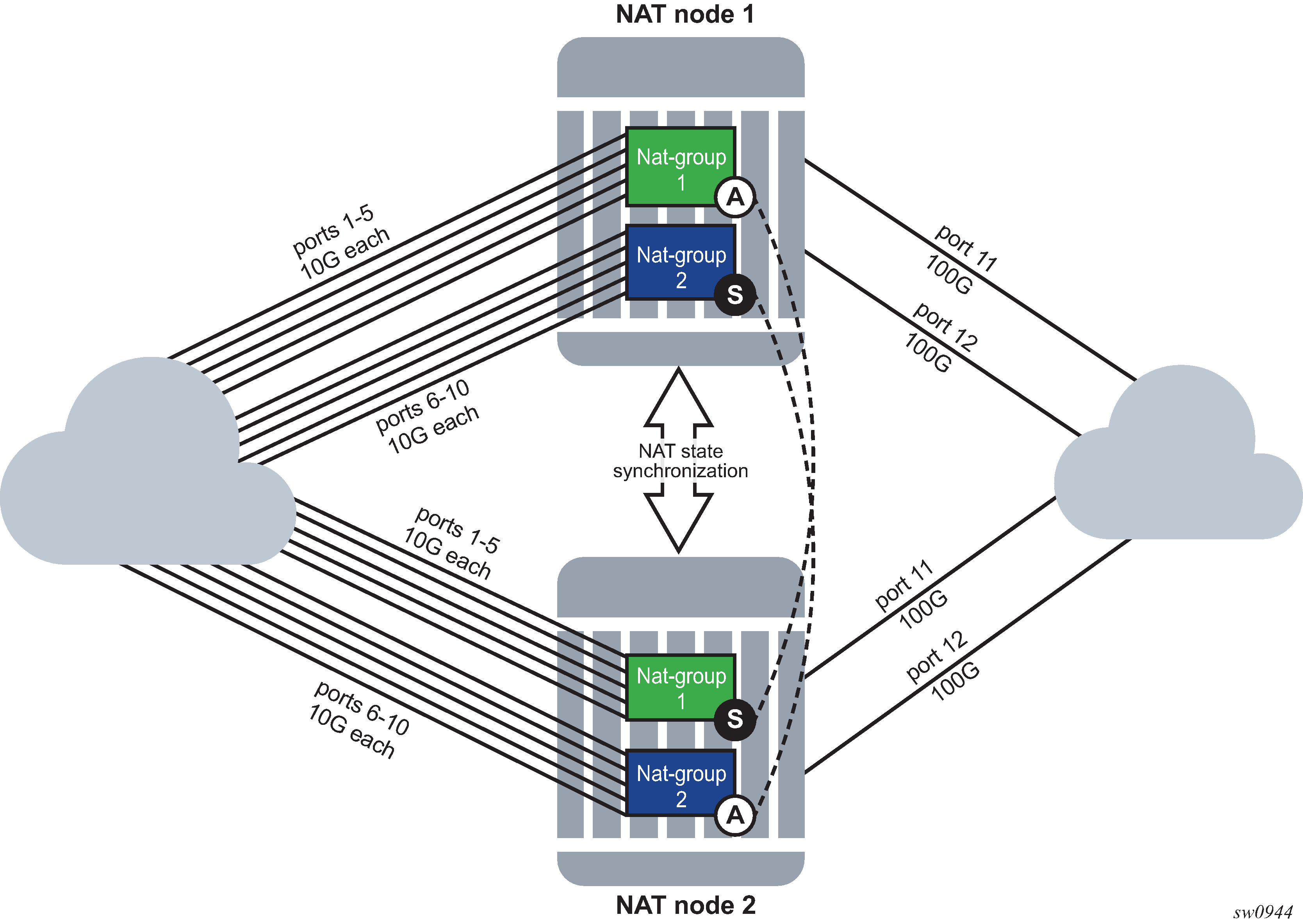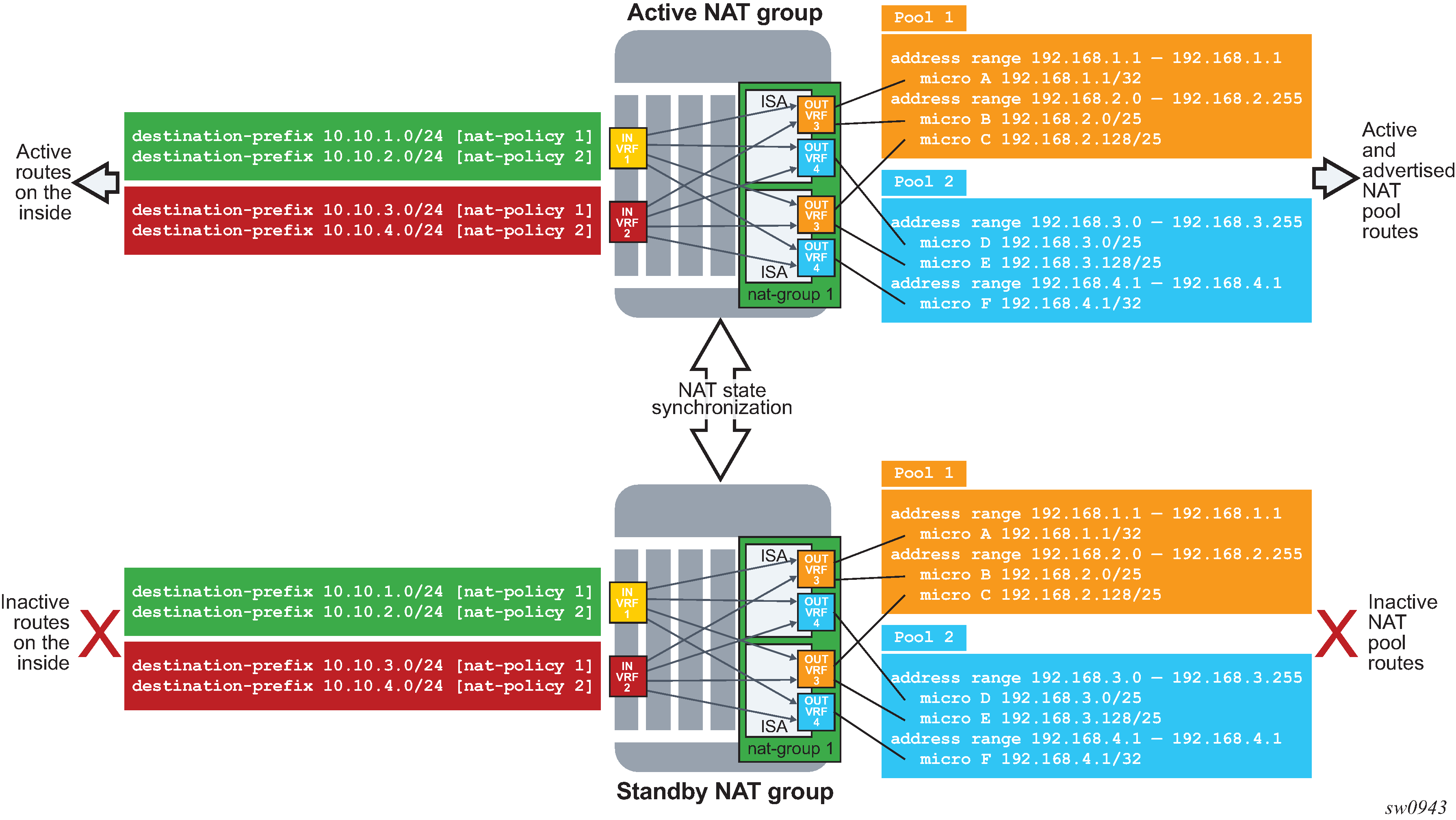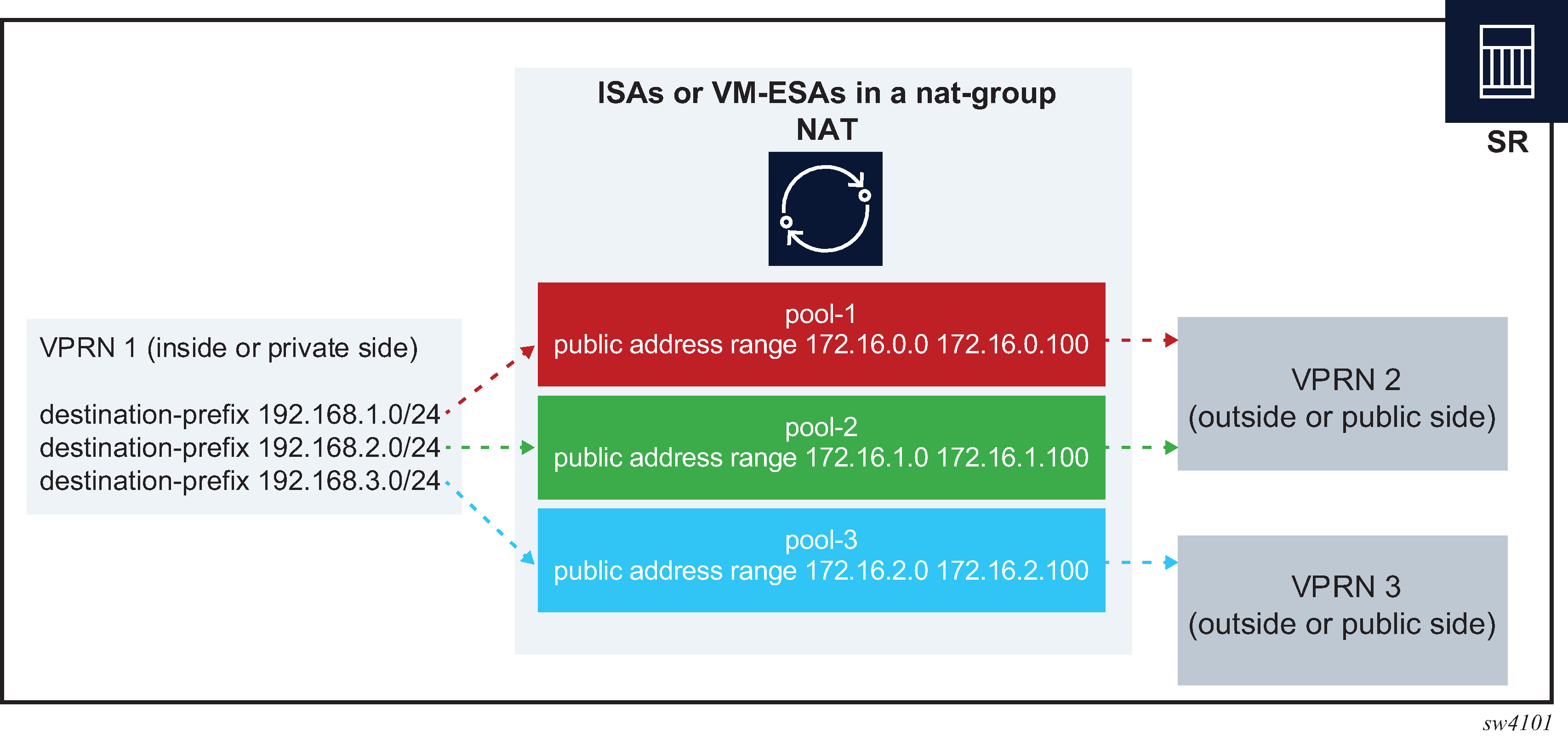 NAT traffic in SR OS is distributed over ISAs and ESAs within each NAT group. This allows NAT capacity to grow incrementally by adding more ISAs and ESAs to the system, while each ISA or ESA participates equally in load sharing.