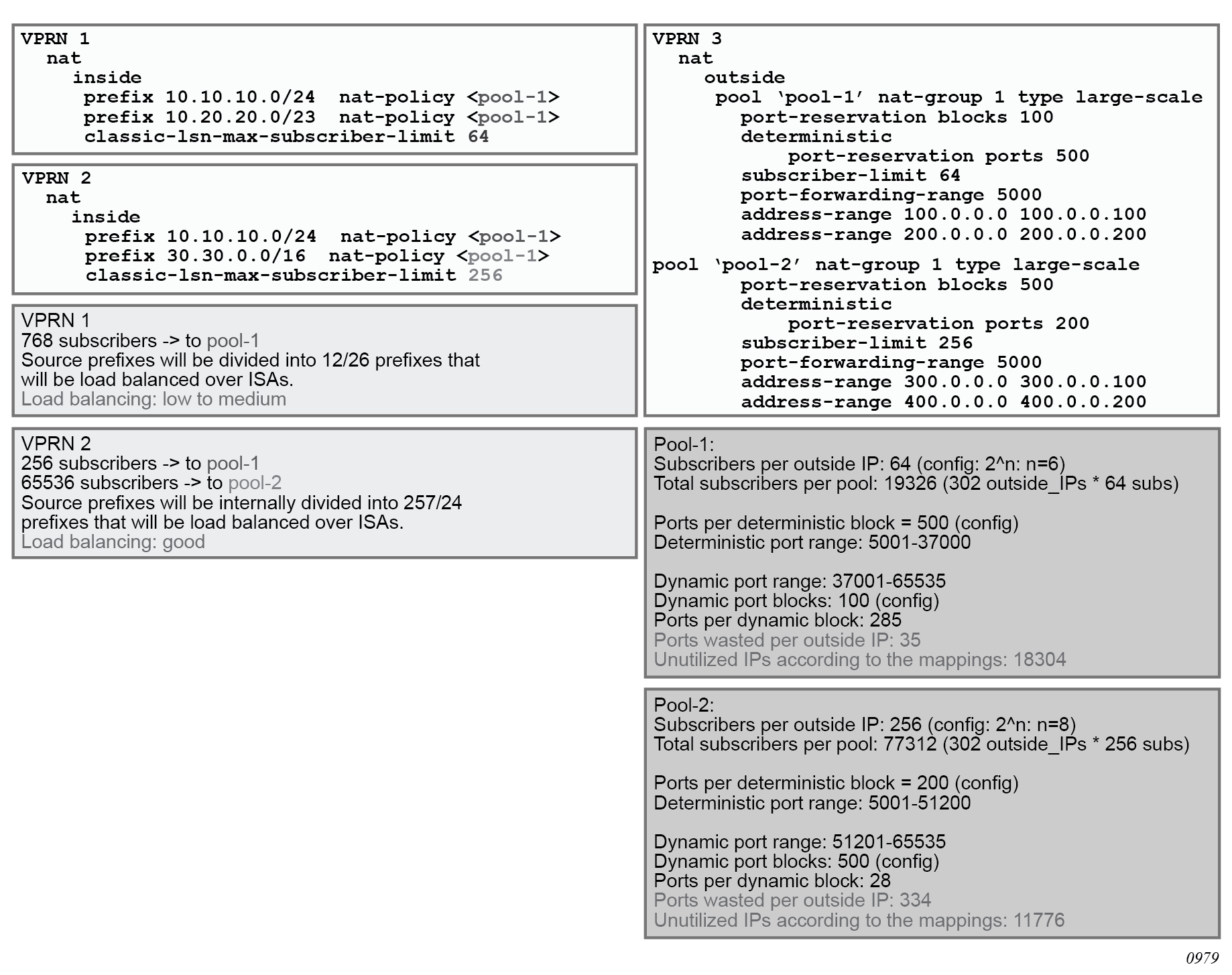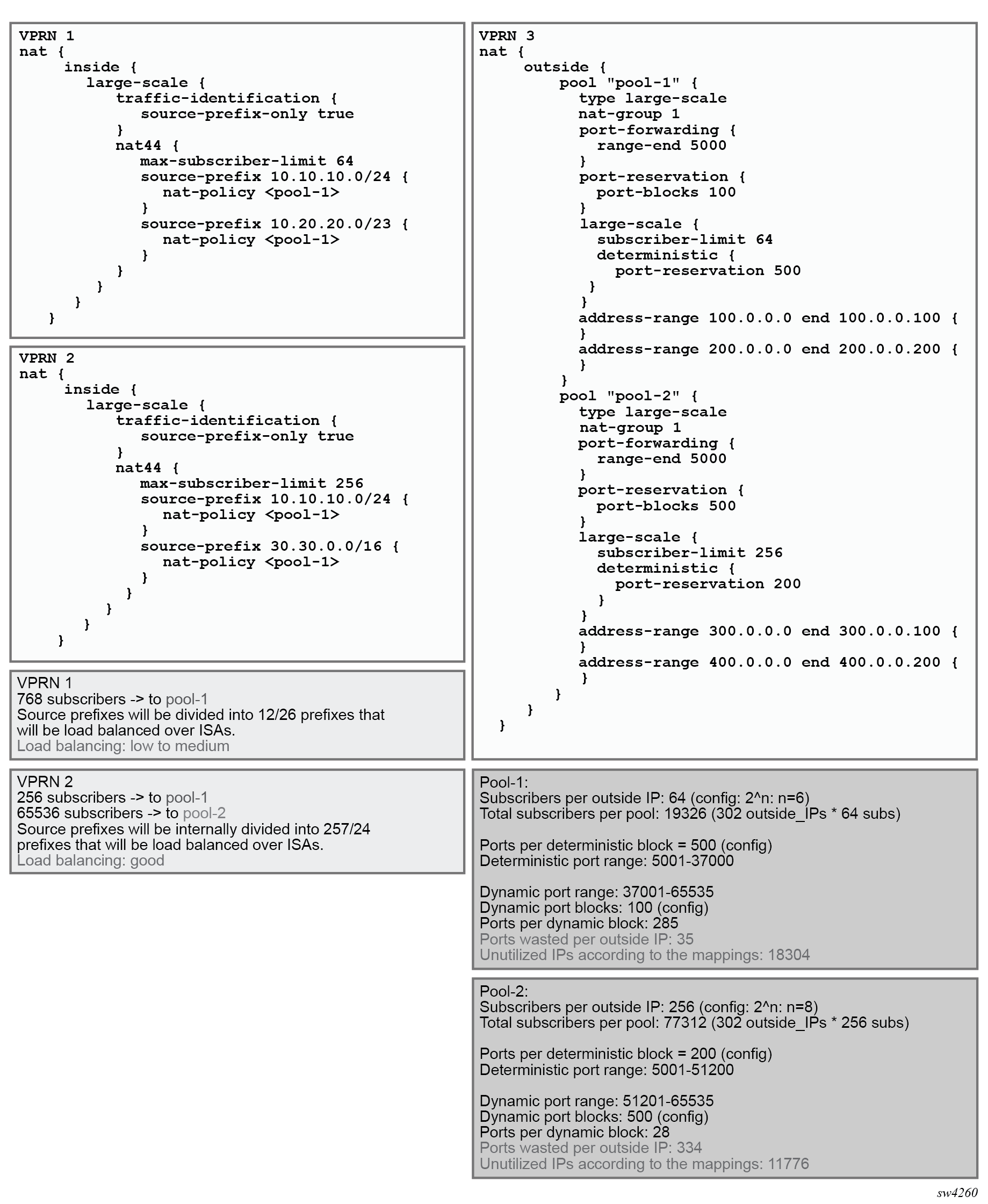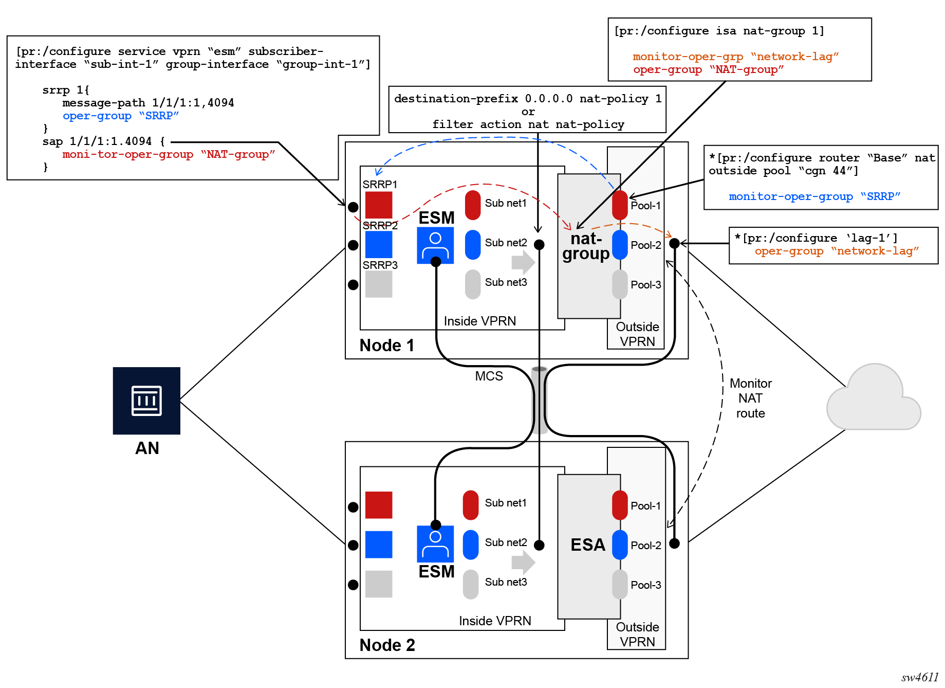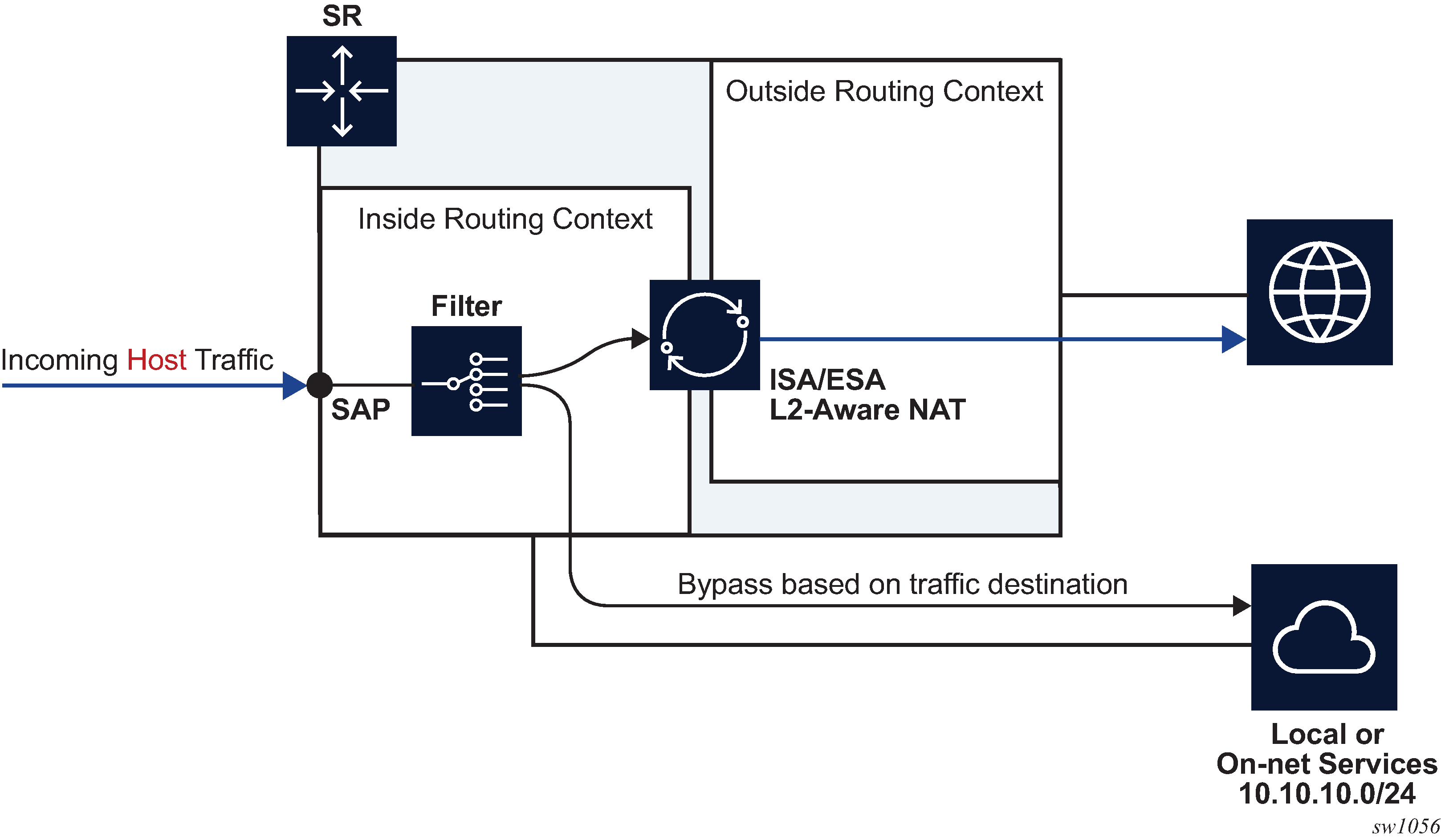 NAT traffic in SR OS is distributed over ISAs and ESAs within each NAT group. This allows NAT capacity to grow incrementally by adding more ISAs and ESAs to the system, while each ISA or ESA participates equally in load sharing.