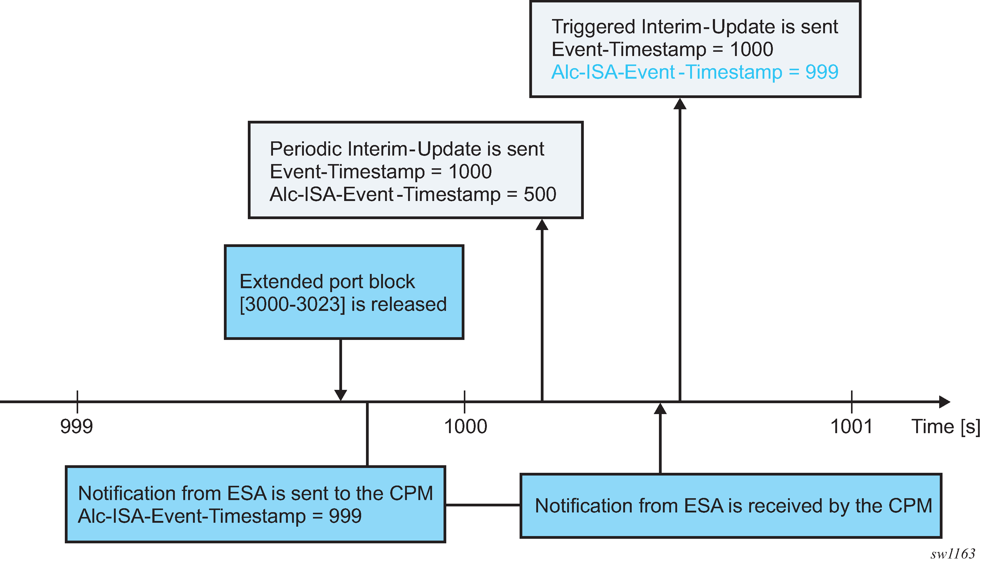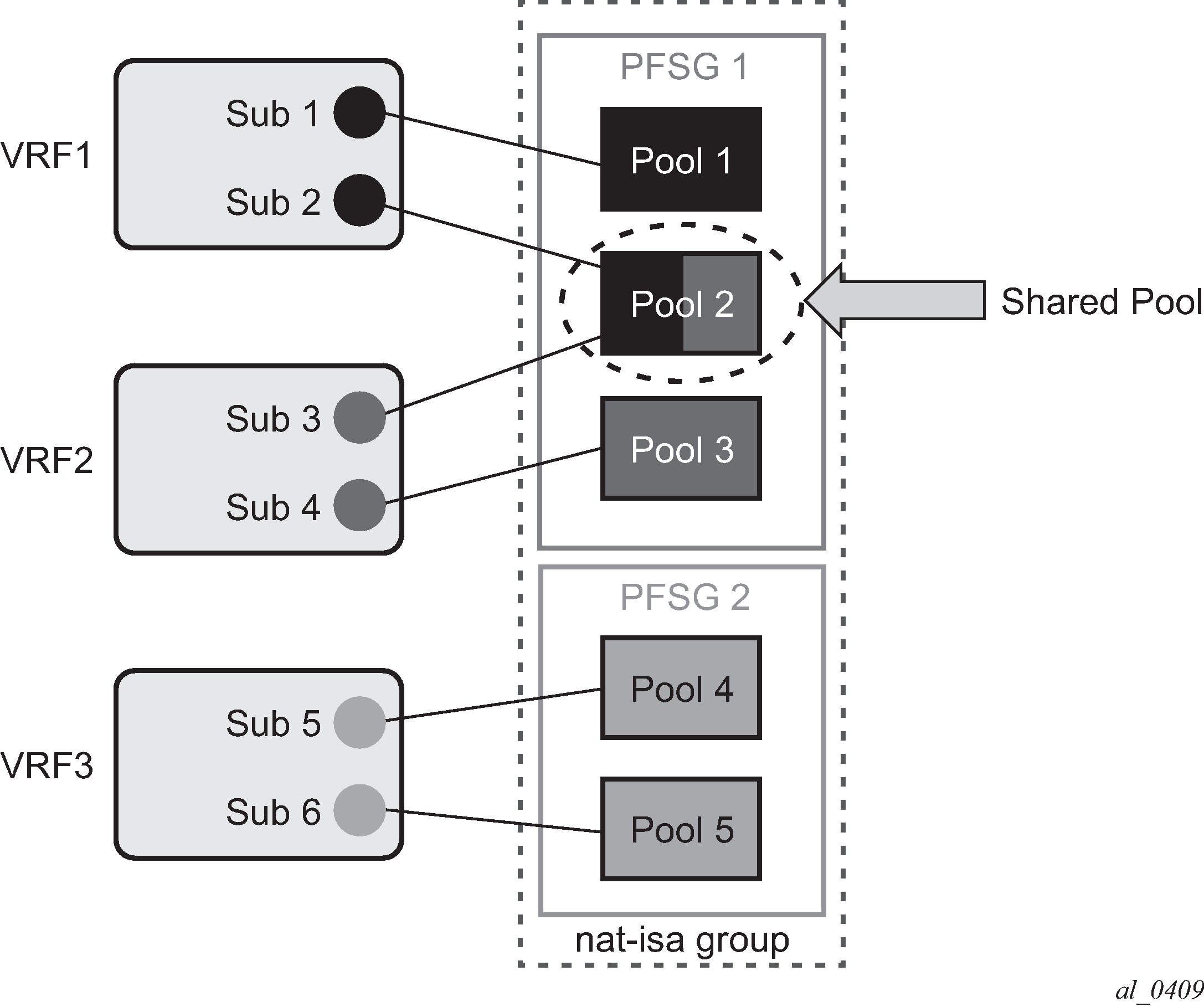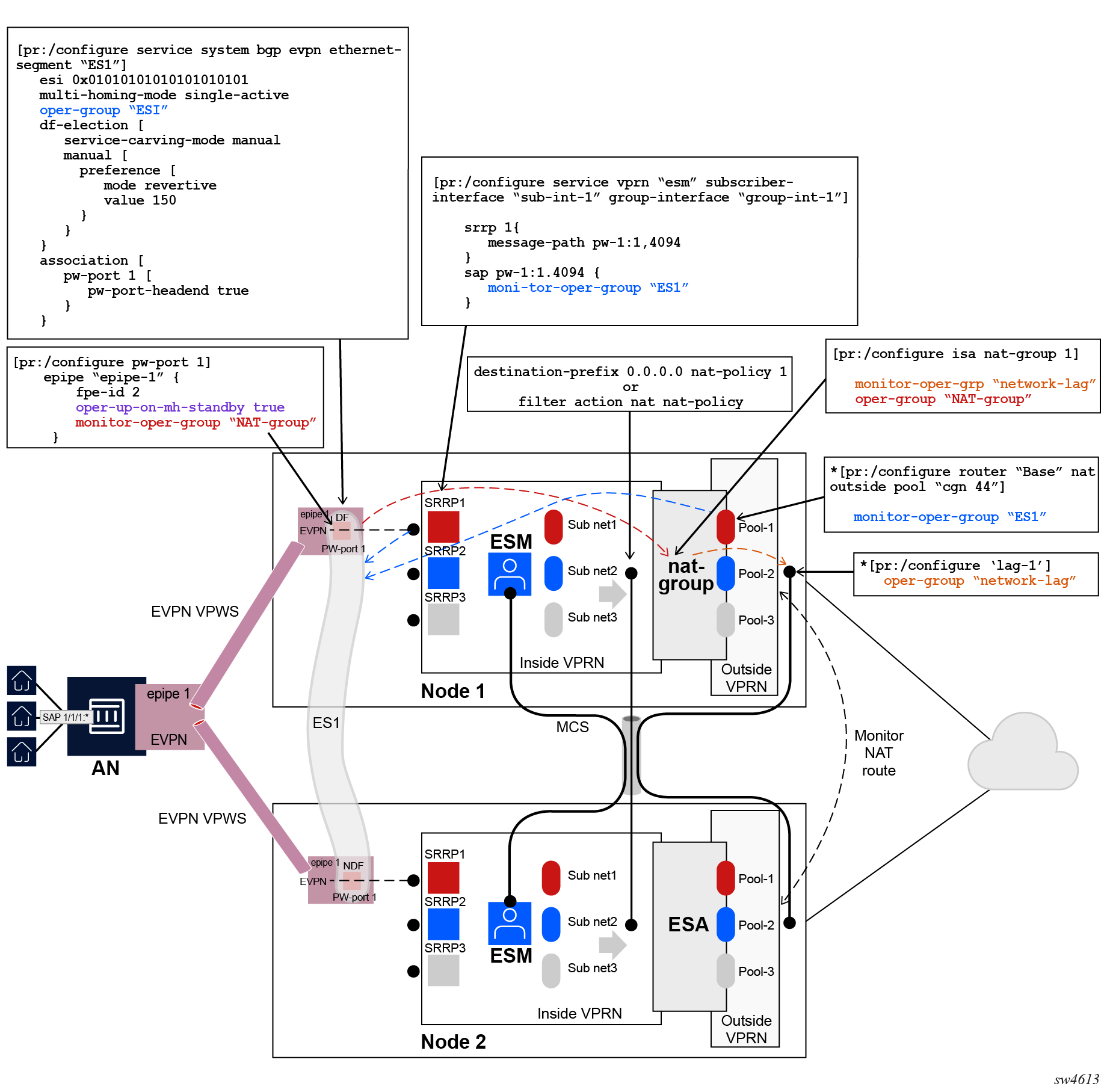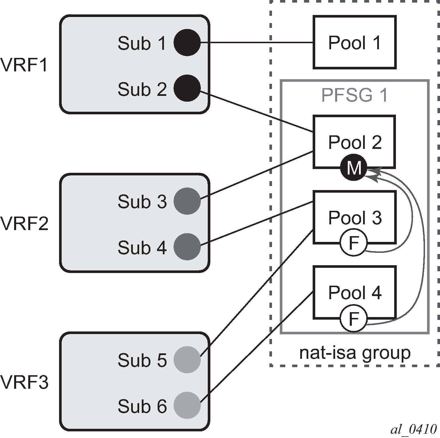 NAT traffic in SR OS is distributed over ISAs and ESAs within each NAT group. This allows NAT capacity to grow incrementally by adding more ISAs and ESAs to the system, while each ISA or ESA participates equally in load sharing.