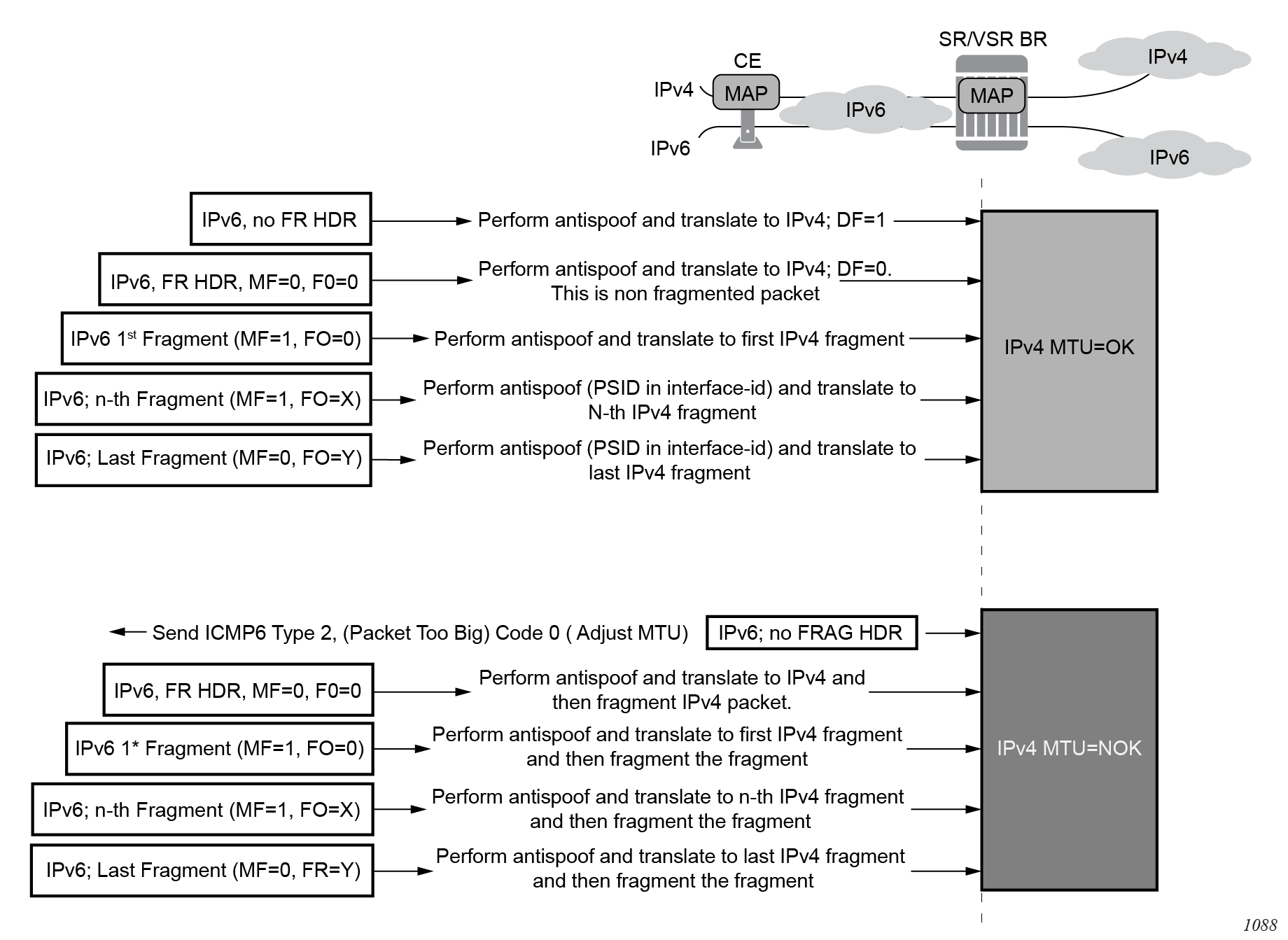 The 7750 SR supports Network Address (and port) Translation (NAPT) to provide continuity of legacy IPv4 services during the migration to native IPv6. By equipping the multiservice ISA (MS ISA) in an IOM4-e, IOM4-e-B, IOM4-e-HS, or in a 7750 SR-1e, 7750 SR-2e, or 7750 SR-3e (IOM-e), the 7750 SR can operate in two different modes, known as: