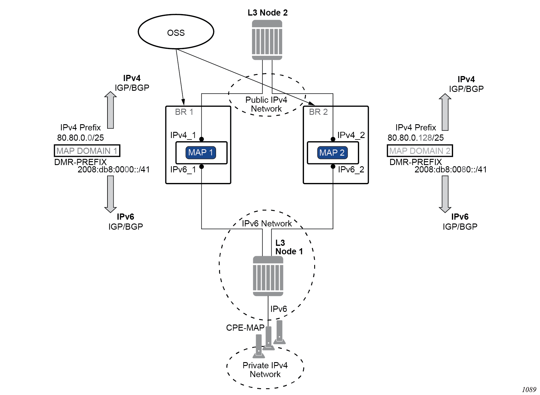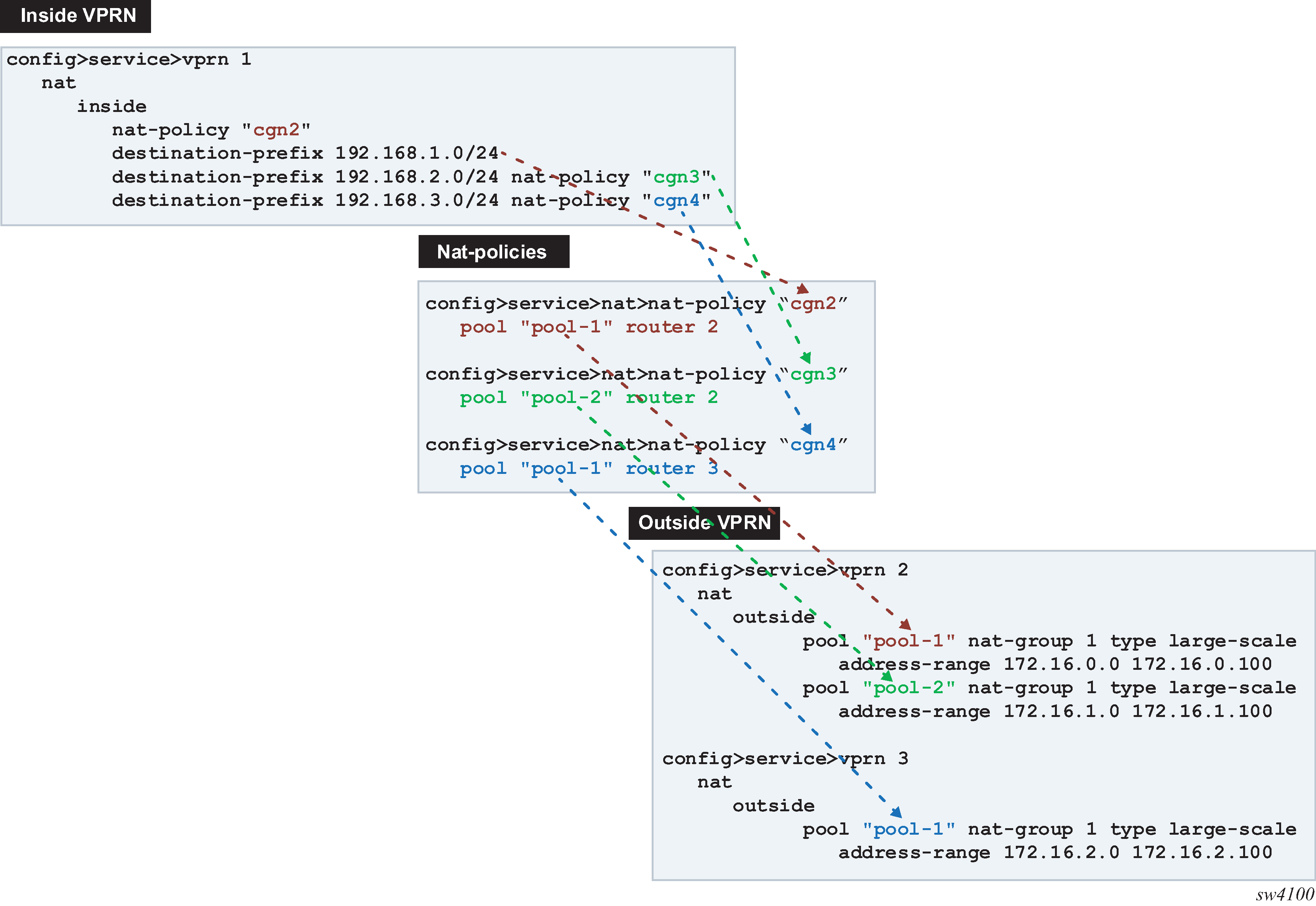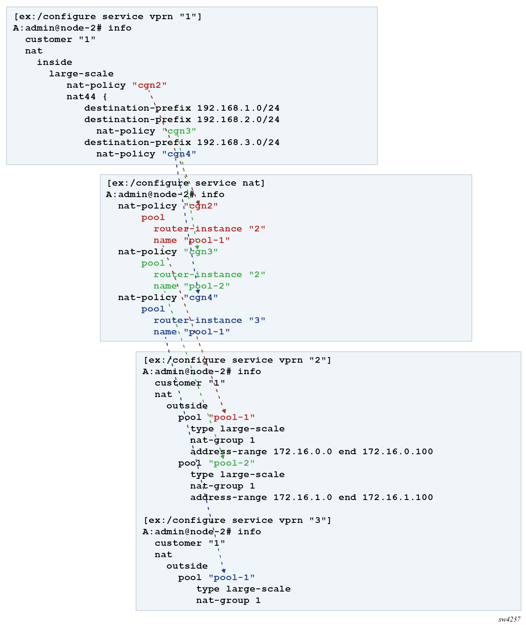 Each distinct NAT technique is referred to by its corresponding name (Large Scale NAT44 [or CGN], DS-Lite and NAT64) with the understanding that in the context of 7750 SR platform, they are all part of LSN (and not enterprise based NAT).
