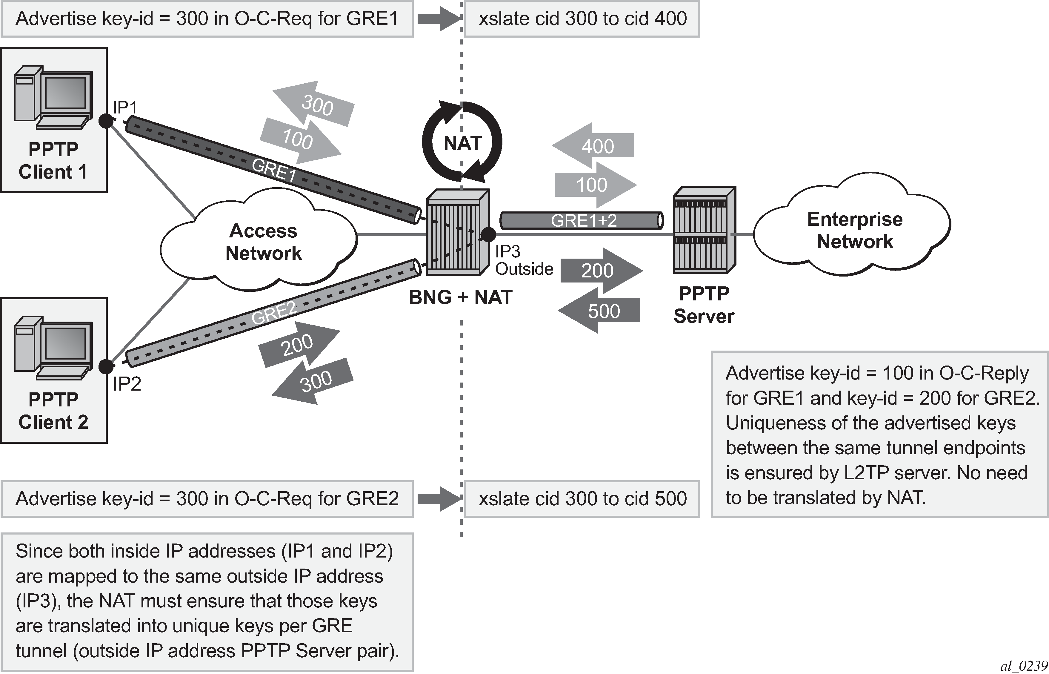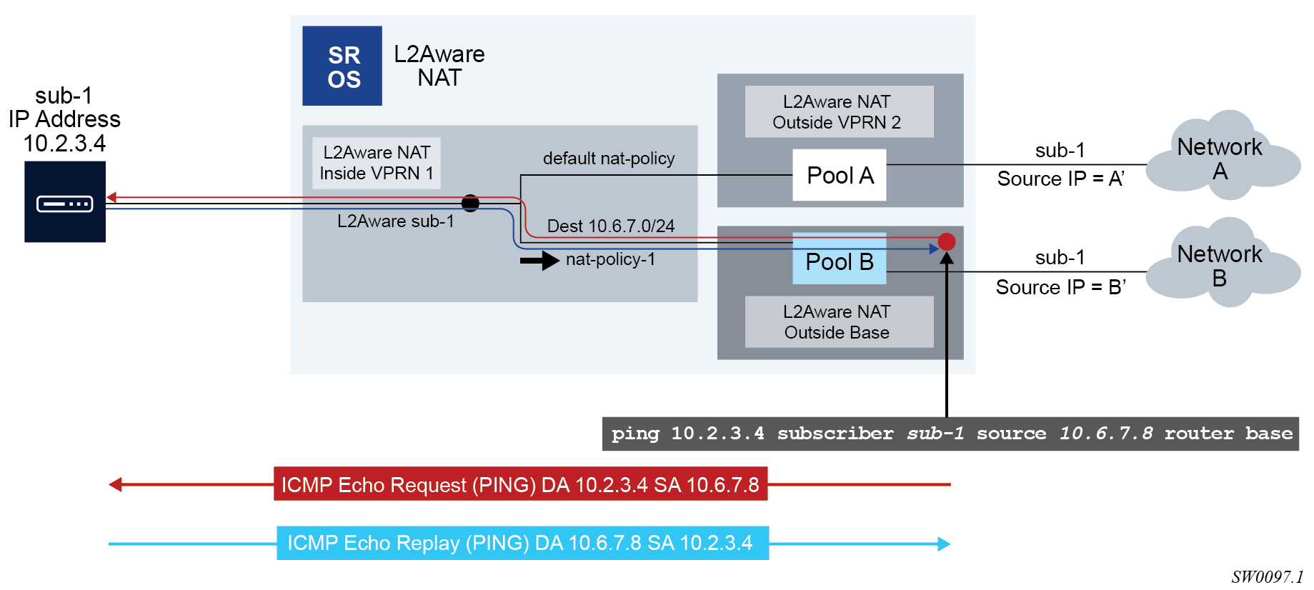 In the context of 7750 SR platform combines Enhanced Subscriber Management (ESM) subscriber-id and inside IP address to perform translation into a unique outside IP address and outside port. This is in contrast with classical NAT technique where only inside IP is considered for address translations. Because the subscriber-id alone is sufficient to make the address translation unique, Layer 2–aware NAT allows many ESM subscribers to share the same inside IP address. The scalability, performance and reliability requirements are the same as in LSN.