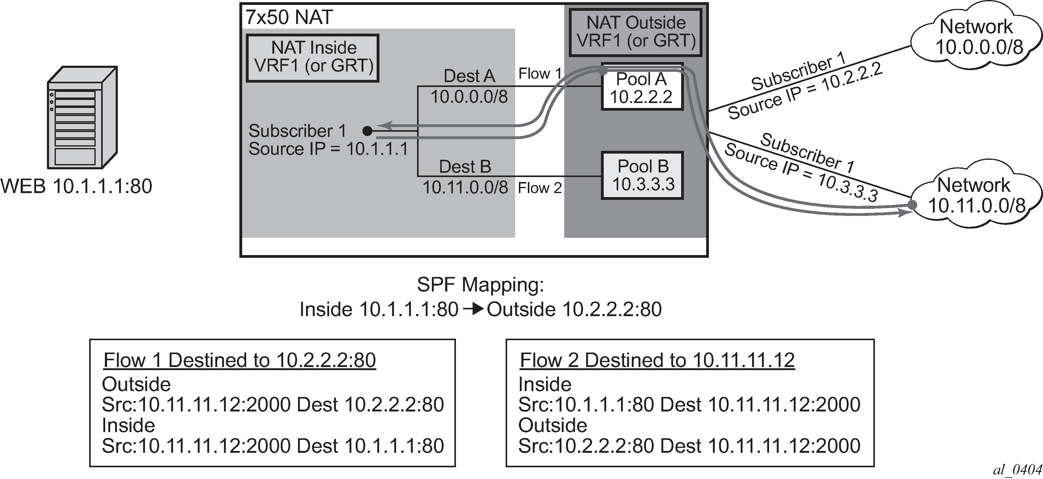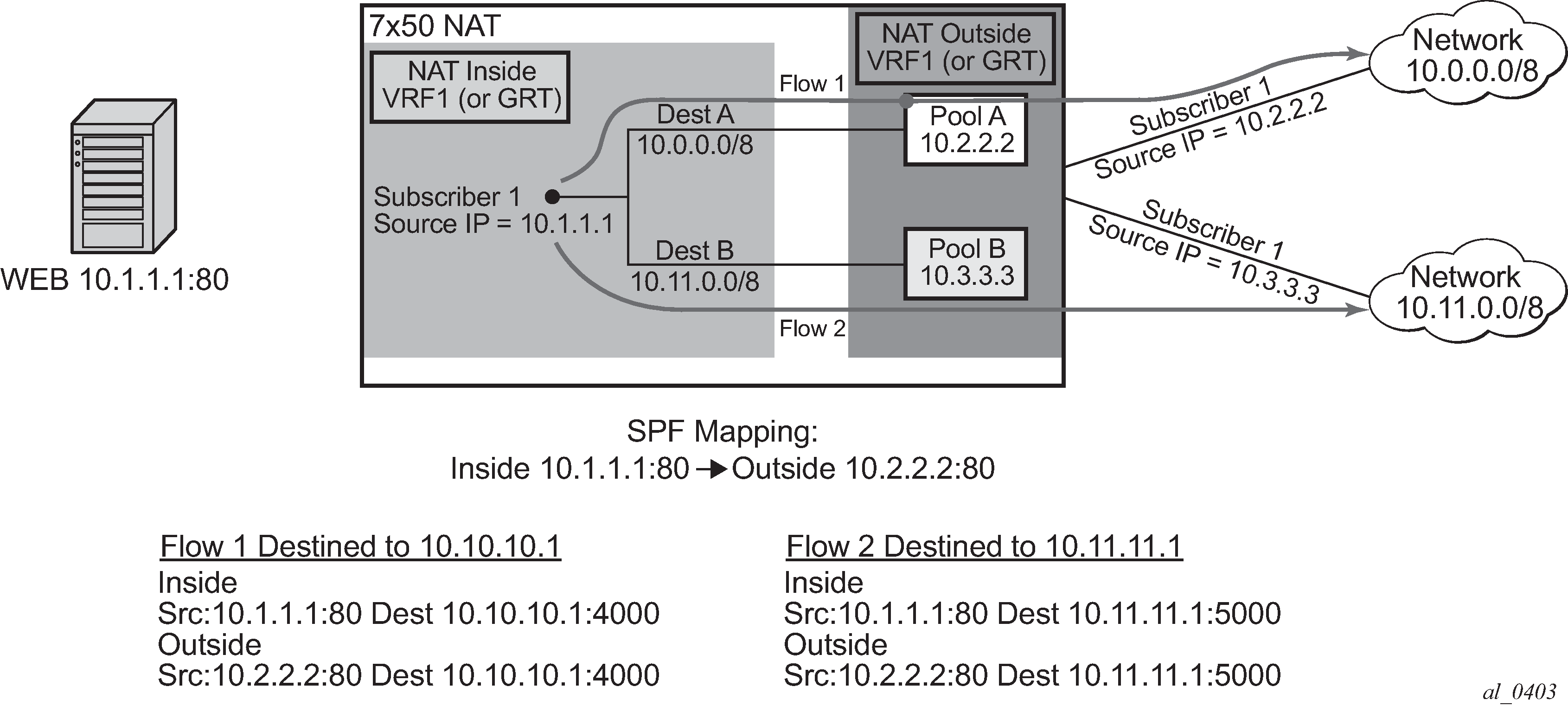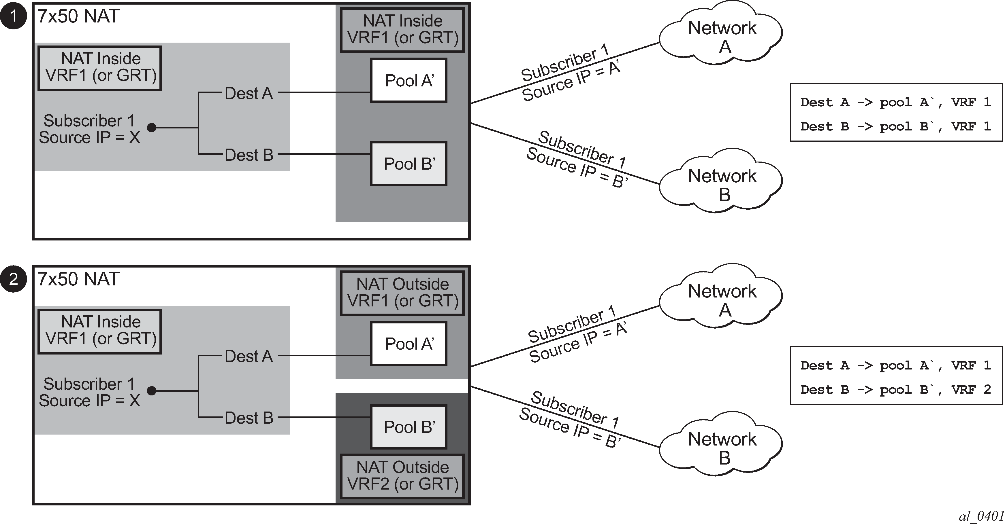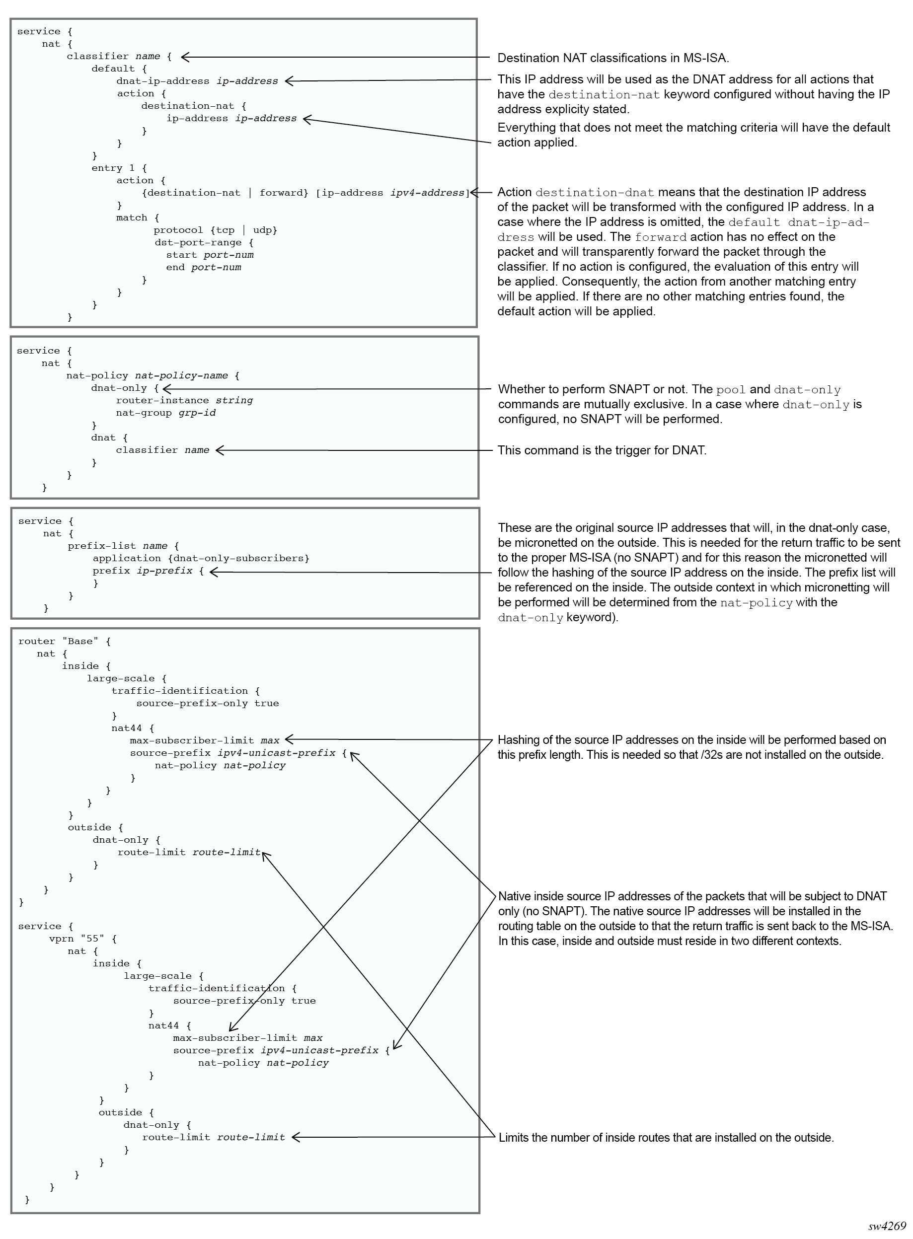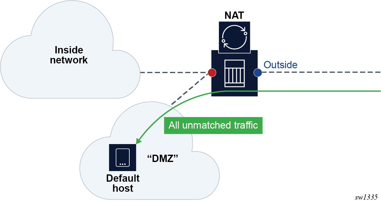 In NAT terminology, a NAT subscriber is an inside entity whose true identity is hidden from the outside. There are a few types of NAT implementation in 7750 SR and subscribers for each implementation are defined as follows: