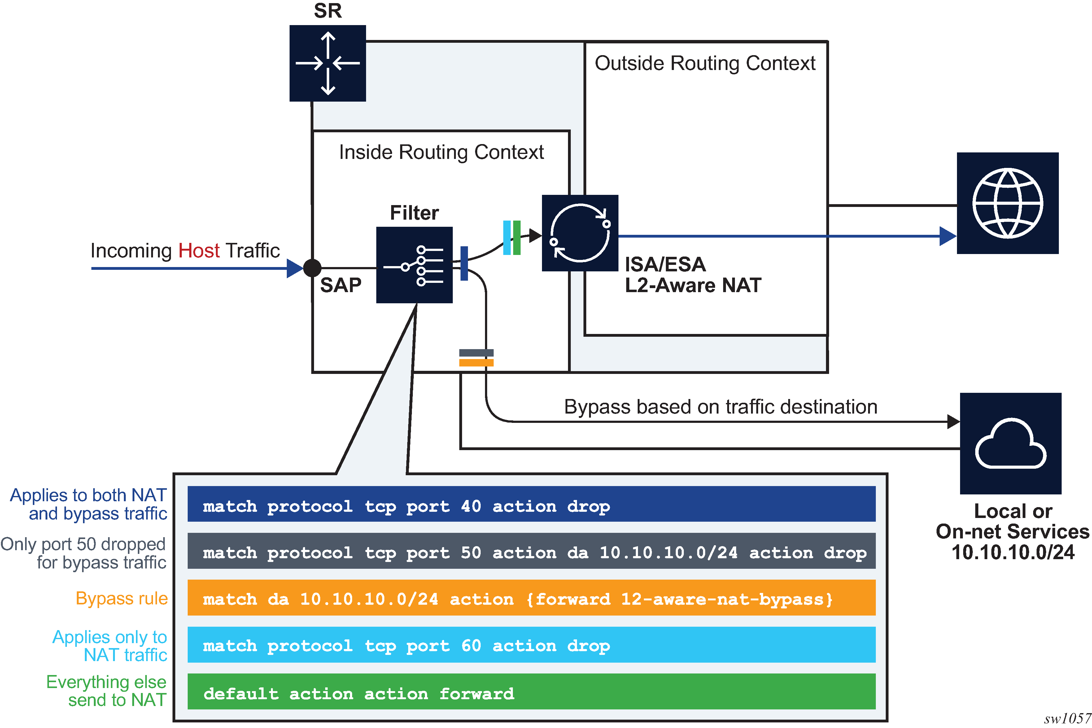 Traffic can be sent to the LSN function on the 7750 SR using IP filters (ACL) applied to SAPs or by installing static routes with a next-hop of the NAT application. These two methods allow for increased flexibility in deploying the LSN, especially those environments where IP MPLS VPN are being used in which case the NAT function can be deployed on a single PE and perform NAT for any number of other PE by simply exporting the default route.