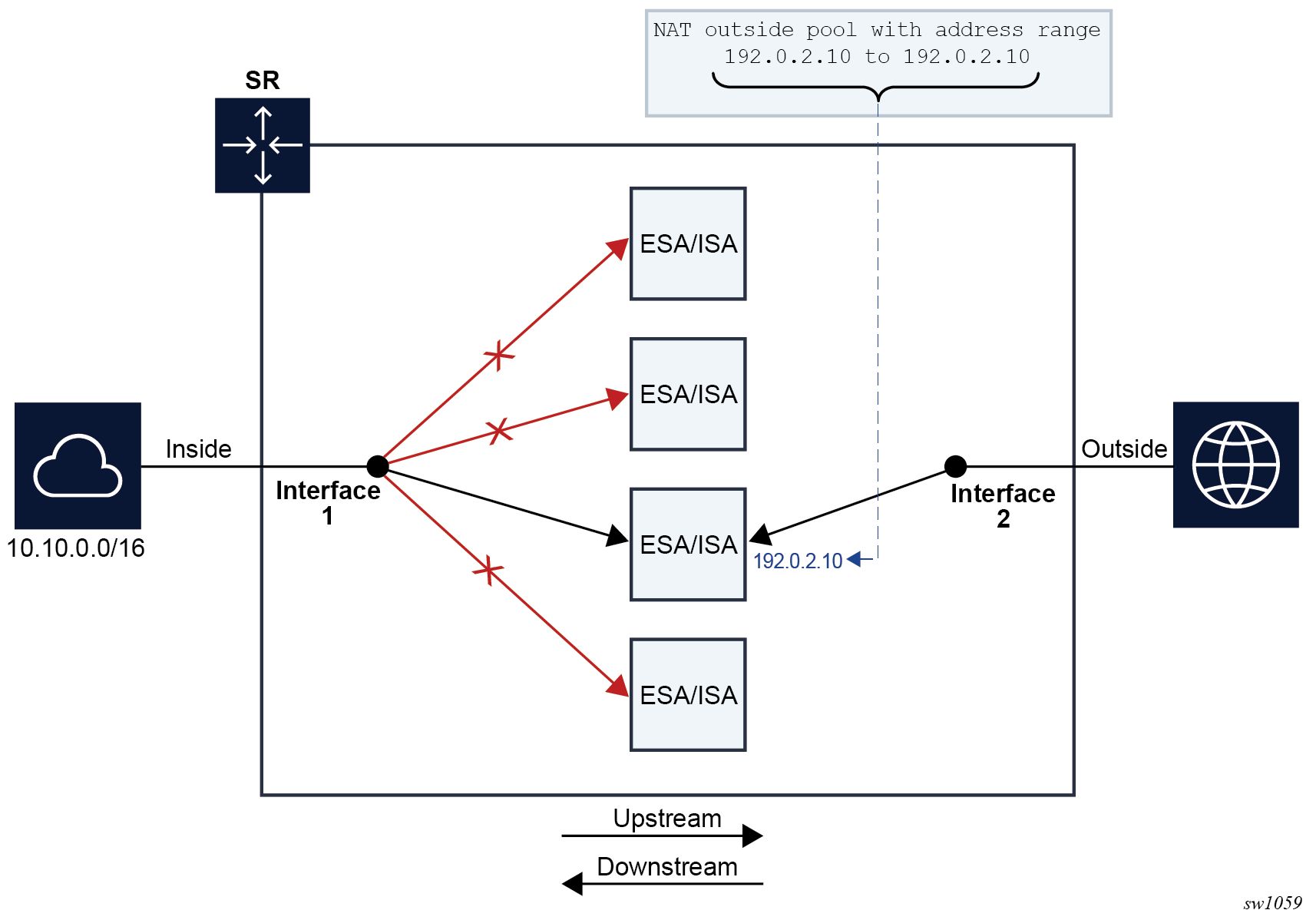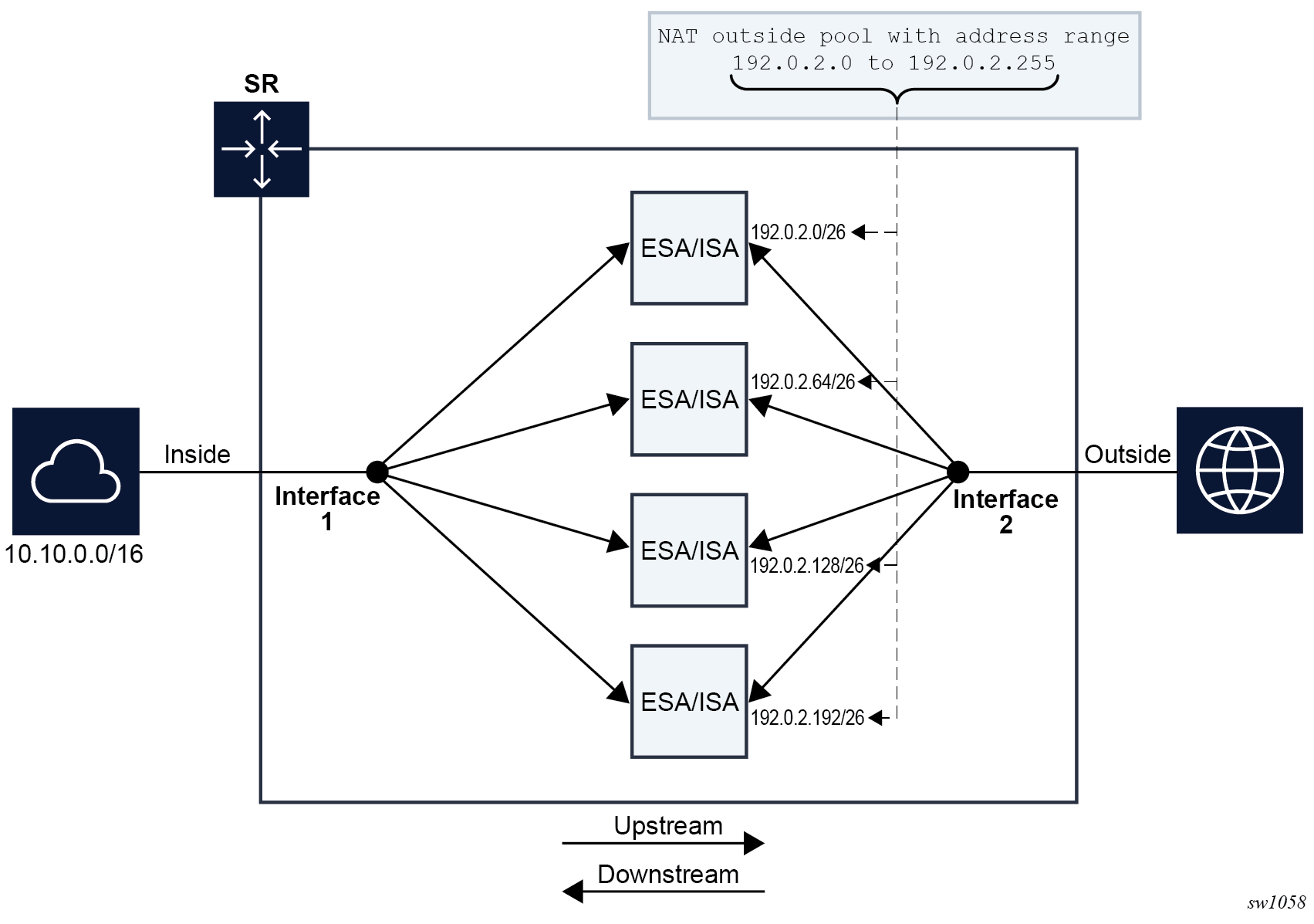 In the downstream direction, outside IP address ranges (NAT pool address ranges) are subnetted (are divided into smaller subnets), and these subnets are assigned to individual ISAs or ESAs in a balanced way. Downstream traffic is assigned to each ISA or ESA based on the subnets.