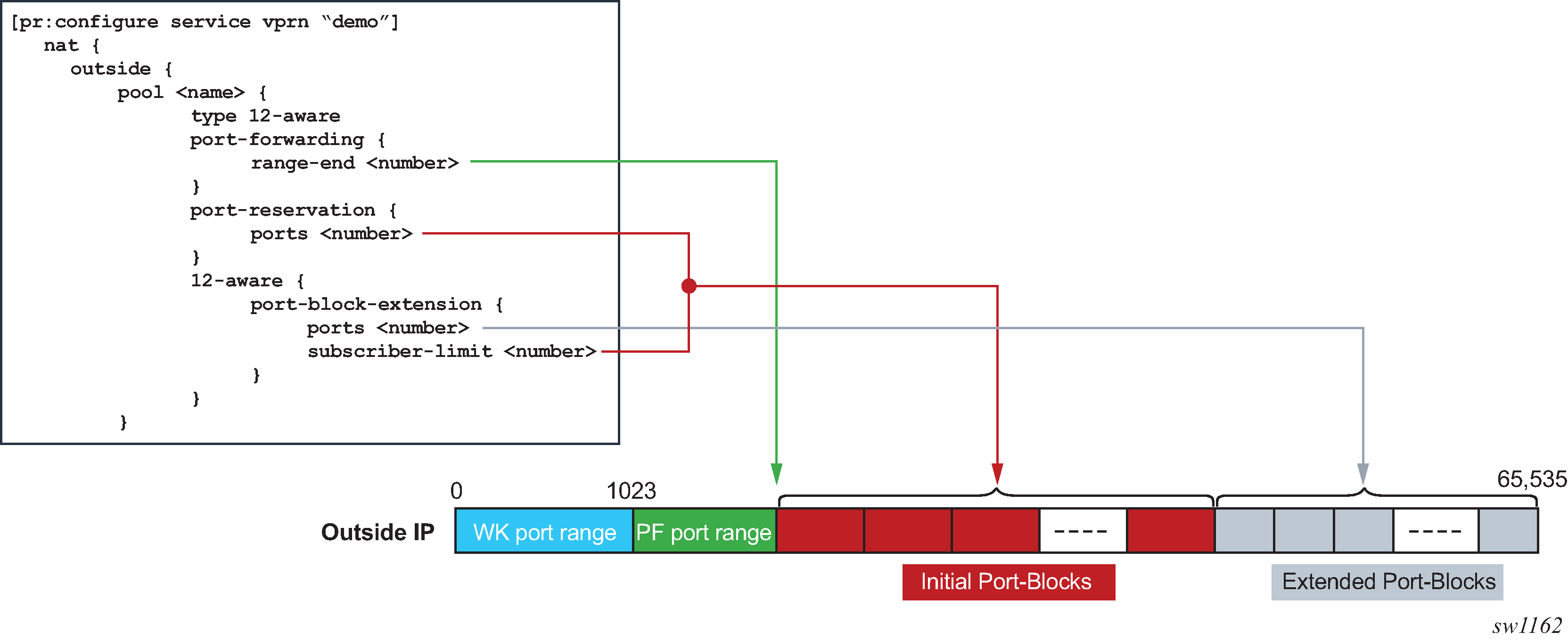 This is collection of ports that is assigned to a subscriber. A deterministic LSN subscriber can have only one deterministic port block that can be extended by multiple dynamic port blocks. Non-deterministic LSN subscriber can be assigned only dynamic port blocks. All port blocks for a LSN subscriber must be allocated from a single outside IP address.