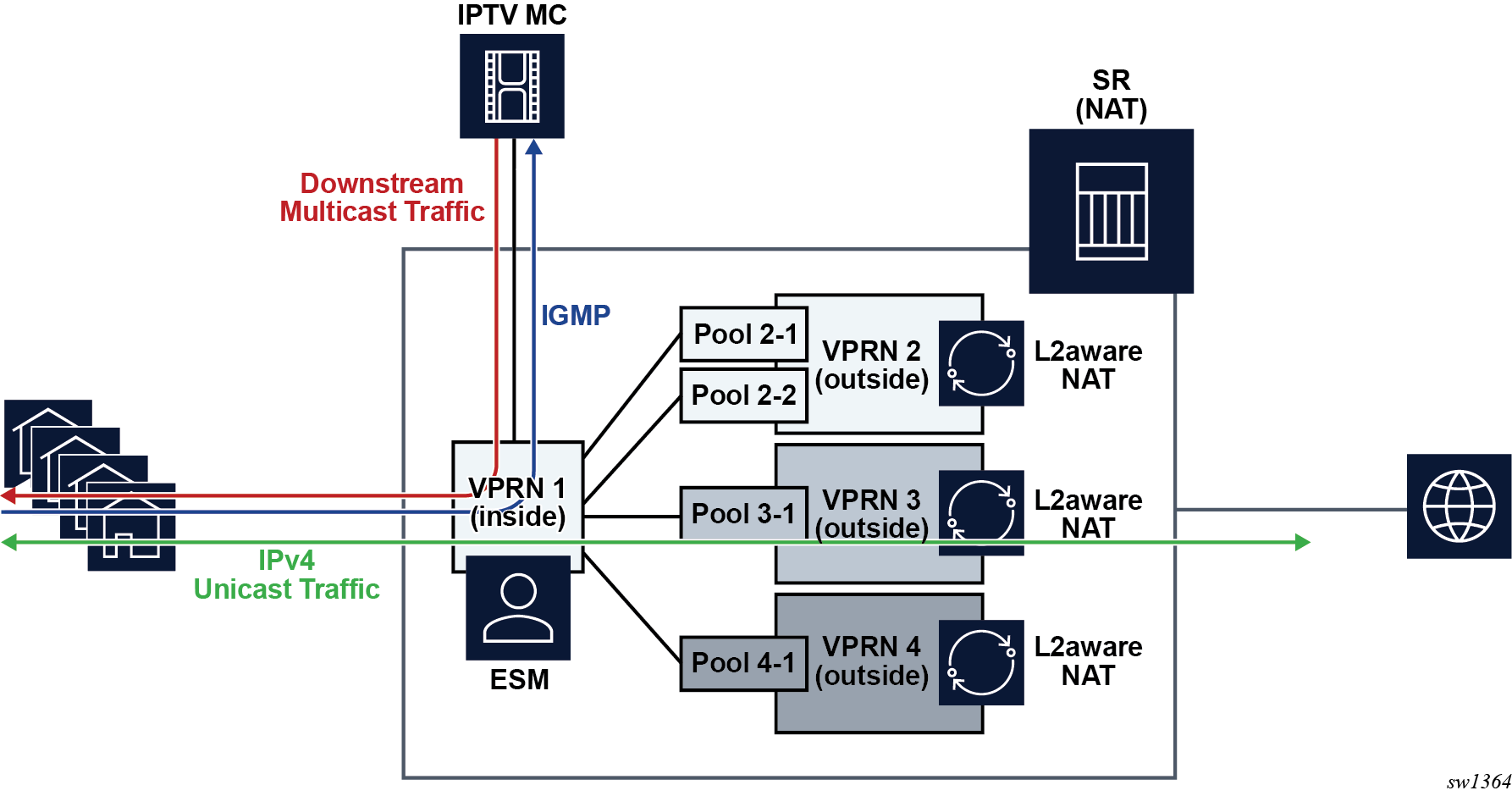 These two modes both perform source address and port translation as commonly deployed for shared Internet access. The 7750 SR with NAT is used to provide consumer broadband or business Internet customers access to IPv4 Internet resources with a shared pool of IPv4 addresses, such as may occur around the forecast IPv4 exhaustion. During this time it, is expected that native IPv6 services are still growing and a significant amount of Internet content remains IPv4.