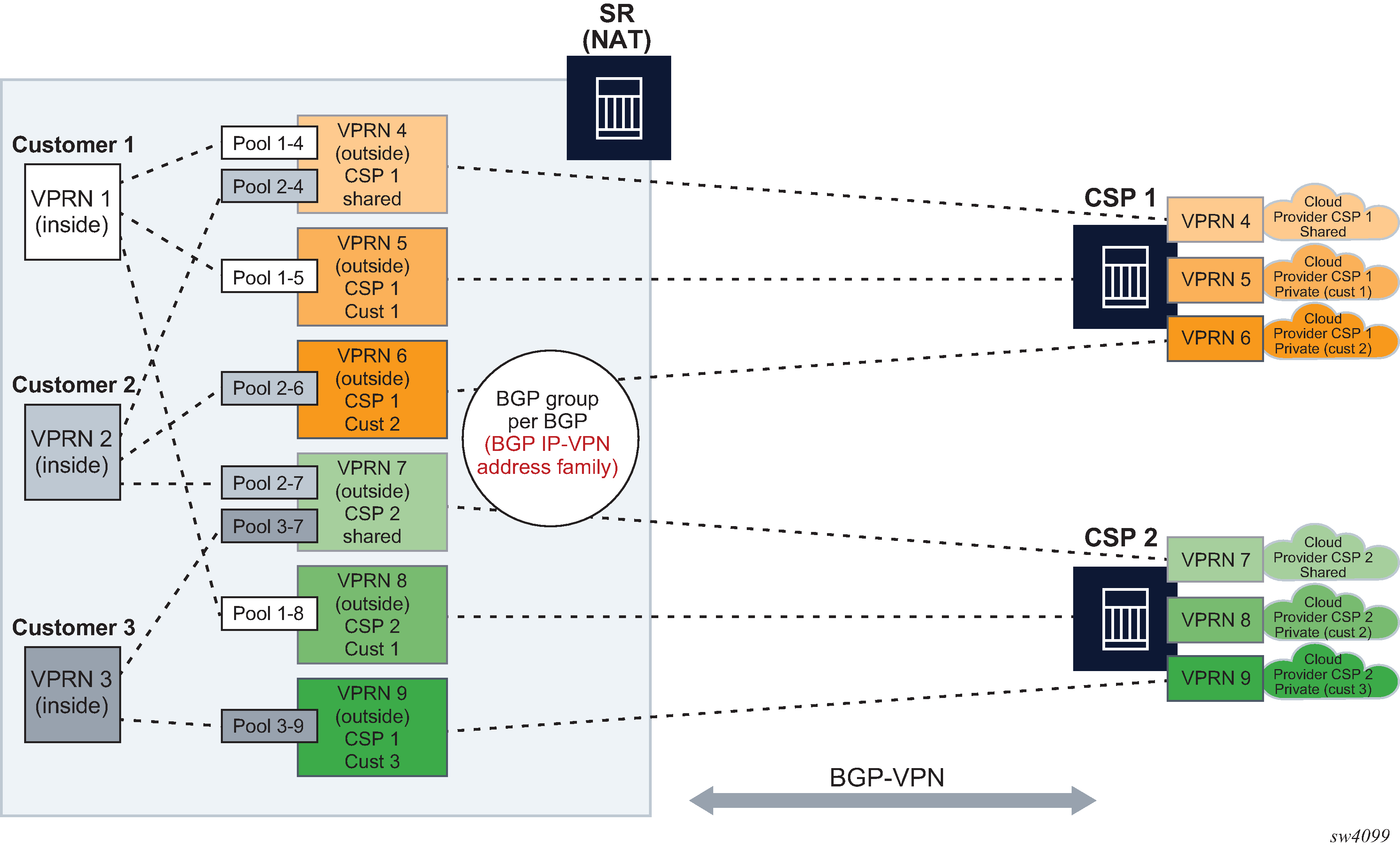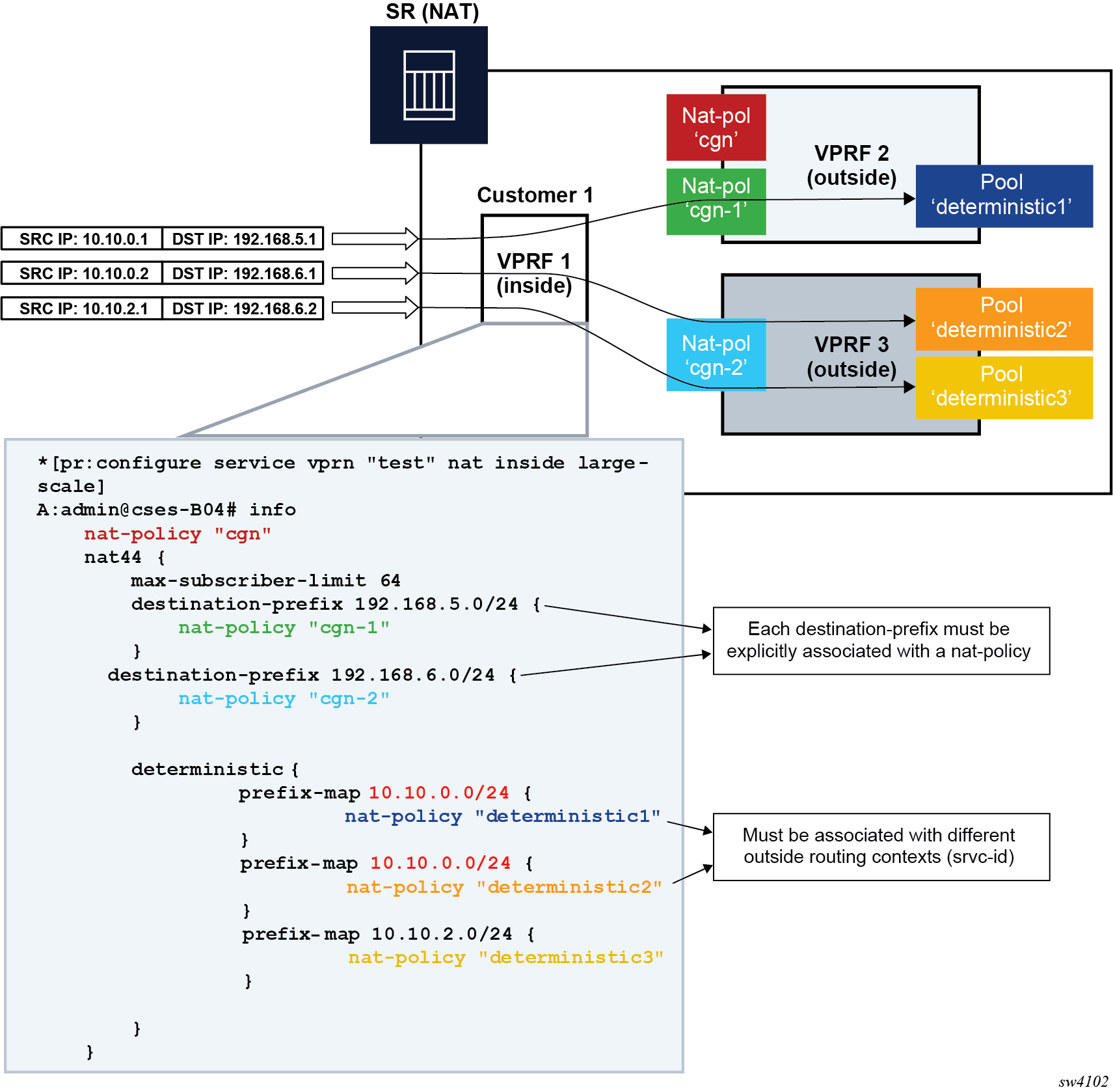 The 7750 SR NAT implementation supports NAT in the base routing instance and VPRN, and through NAT traffic may originate in one VPRN (the inside) and leave through another VPRN or the base routing instance (the outside). This technique can be employed to provide customers of IP MPLS VPN with Internet access by introducing a default static route in the customer VPRN, and NATing it into the Internet routing instance.
