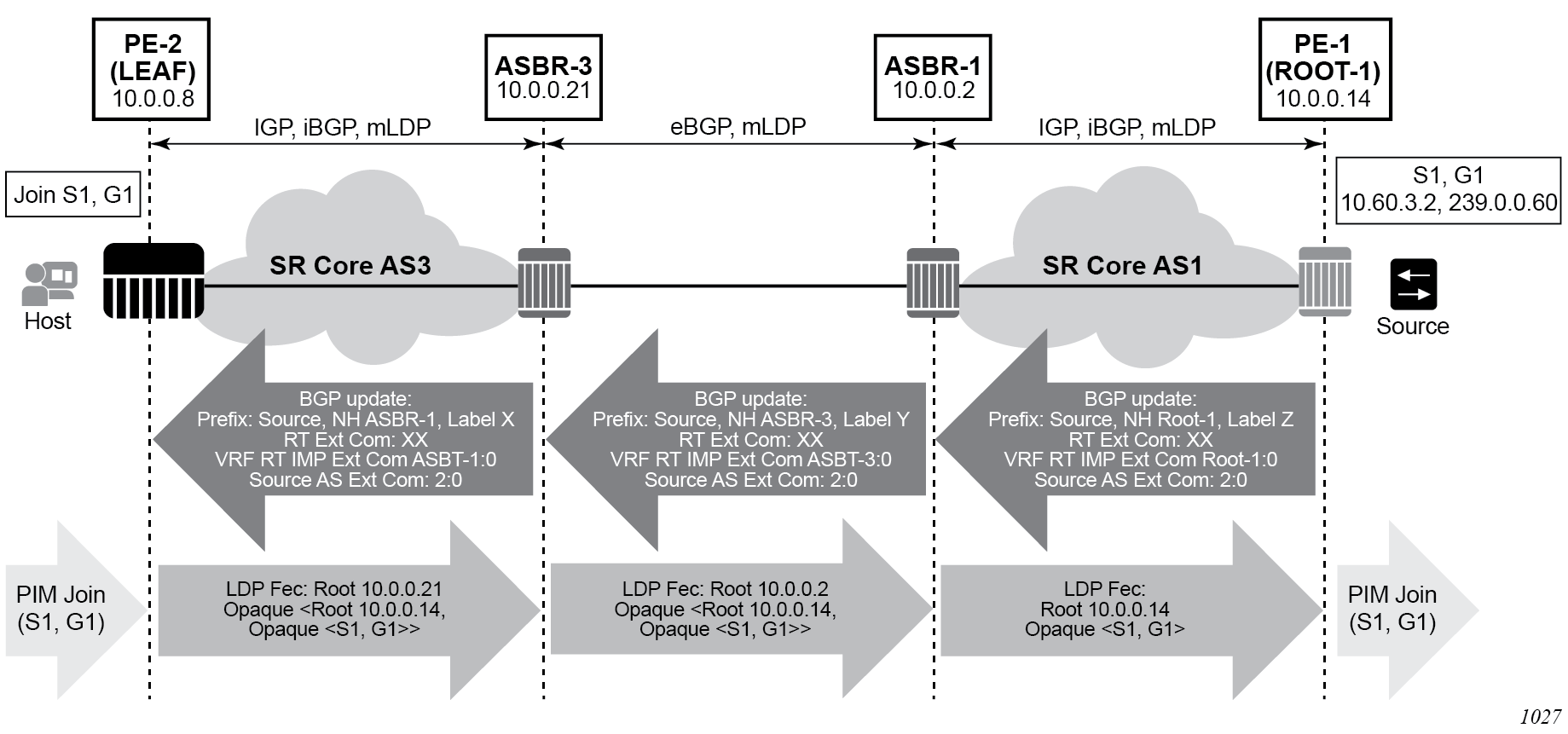 To traverse an inter-AS domain, recursive FECs are required (see the ‟Inter-AS Non-segmented MLDP” section in the 7450 ESS, 7750 SR, 7950 XRS, and VSR MPLS Guide for more information).