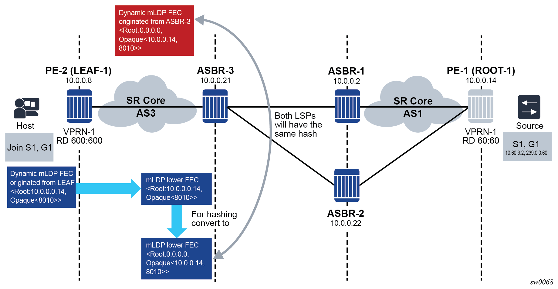 At each leaf or ASBR, there are two FECs: a lower FEC and an upper FEC. The lower FEC is used for hashing to multiple ASBRs and the upper FEC is used to choose the next-hop that connects the leaf node to the ASBR. Hashing is performed based on the opaque value of the FEC. See the ‟Supported Recursive Opaque Values” section in the 7450 ESS, 7750 SR, 7950 XRS, and VSR MPLS Guide for more information.