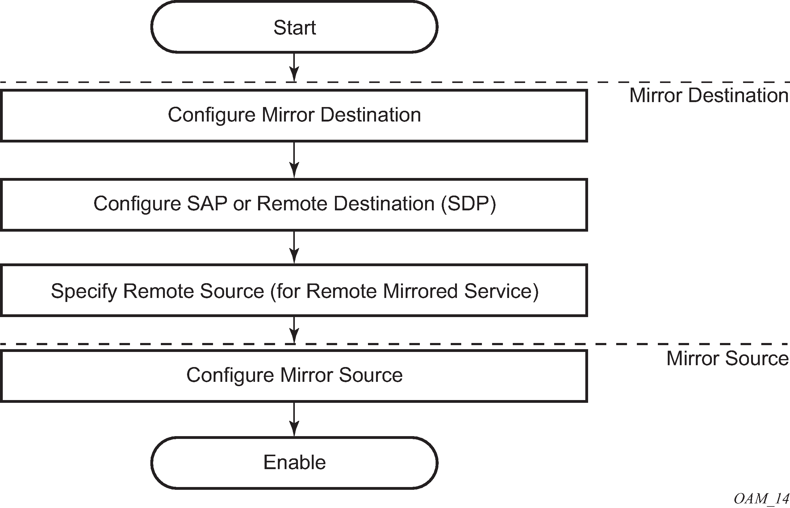 The SDP configuration from the mirrored device to a far-end router requires a return path SDP from the far-end router back to the mirrored router. Each device must have an SDP defined for every remote router to which it wants to provide mirroring services.