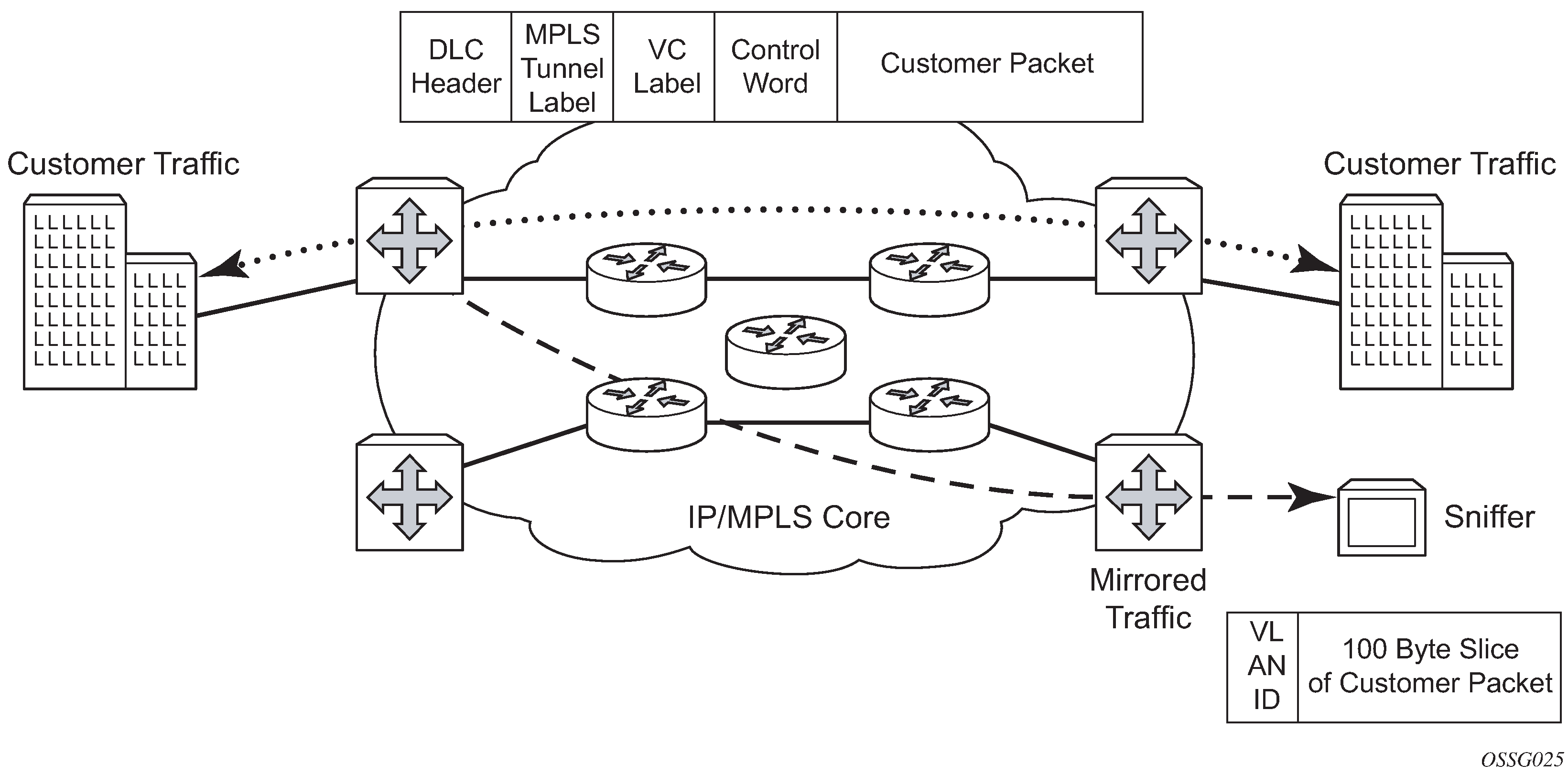 The mirrored frame size that is to be transmitted to the mirror destination can be explicitly configured by using slicing features. This enables mirroring only the parts needed for analysis. For example, only the headers can be copied for analysis, protecting the integrity and security of customer data, or conversely, copying the full packet, including customer data.