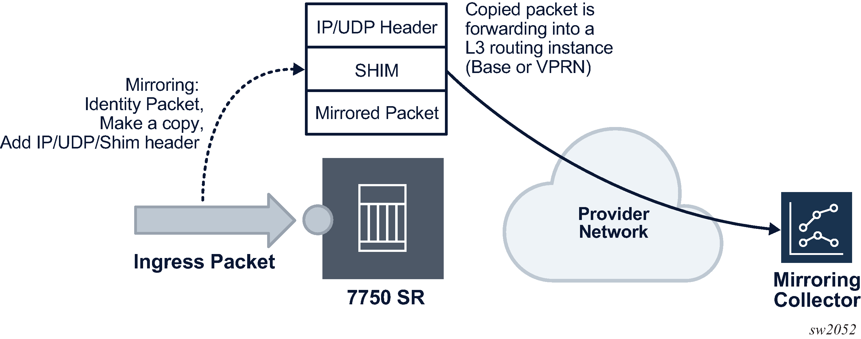 Mirroring can be implemented on SAPs or ingress network interfaces. The Flexible Fast Path processing complexes preserve the original packet throughout the forwarding and mirroring process, making any necessary packet changes, such as adding encapsulation, on a separate copy.