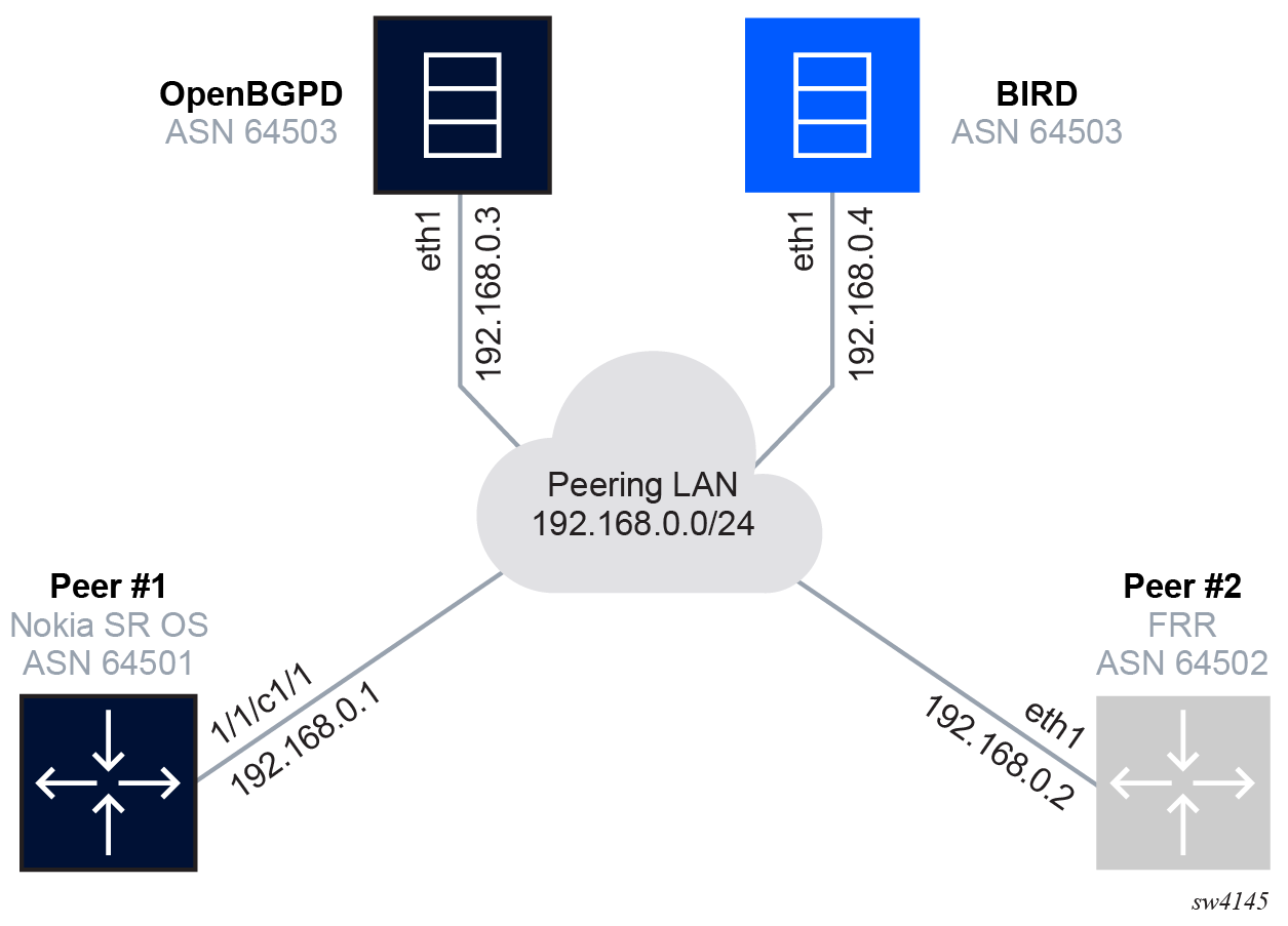 The configuration examples in this guide display the connection of the Peer #1 Nokia SR OS ASN 64501 router (shown in the following figure) as a peering router to the rest of the network.