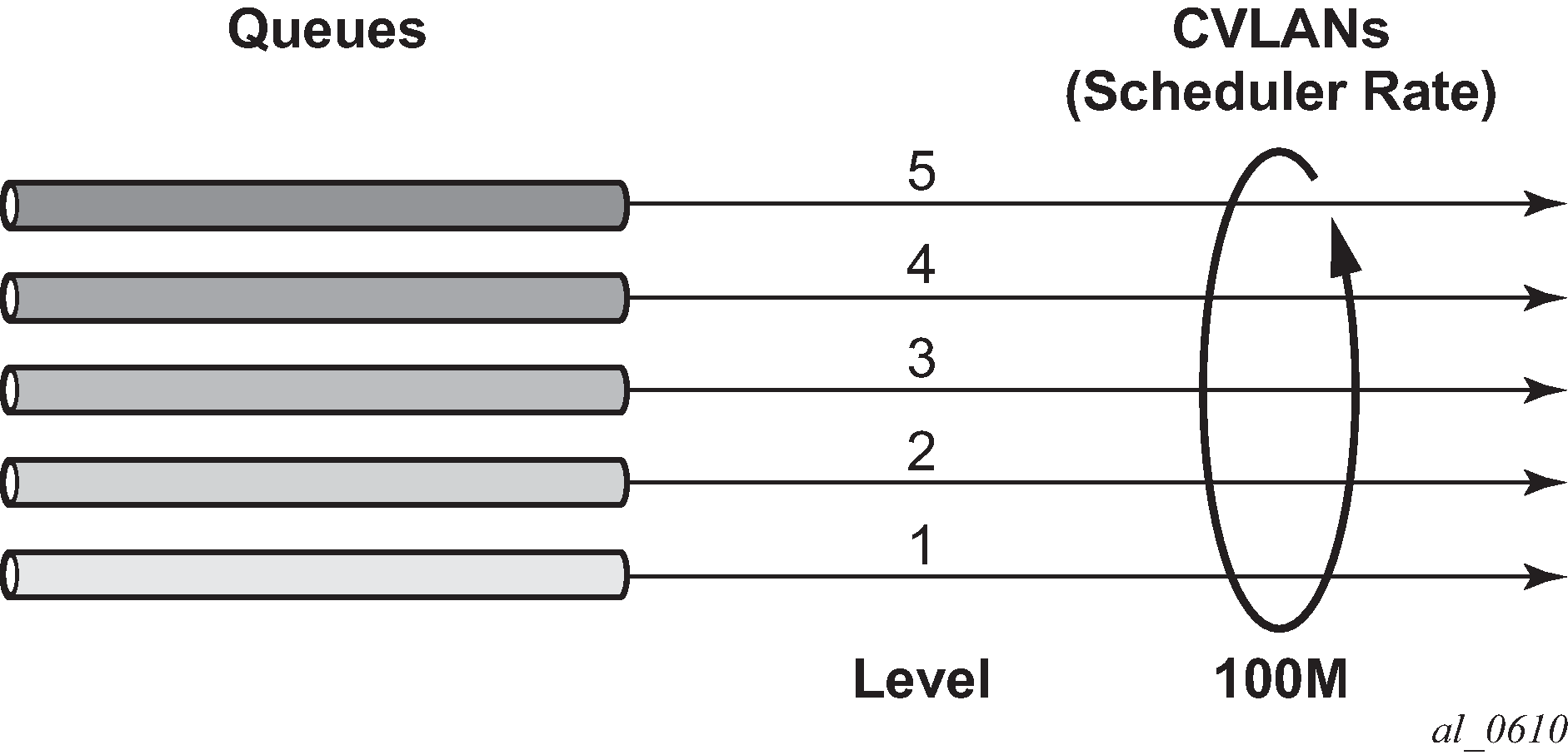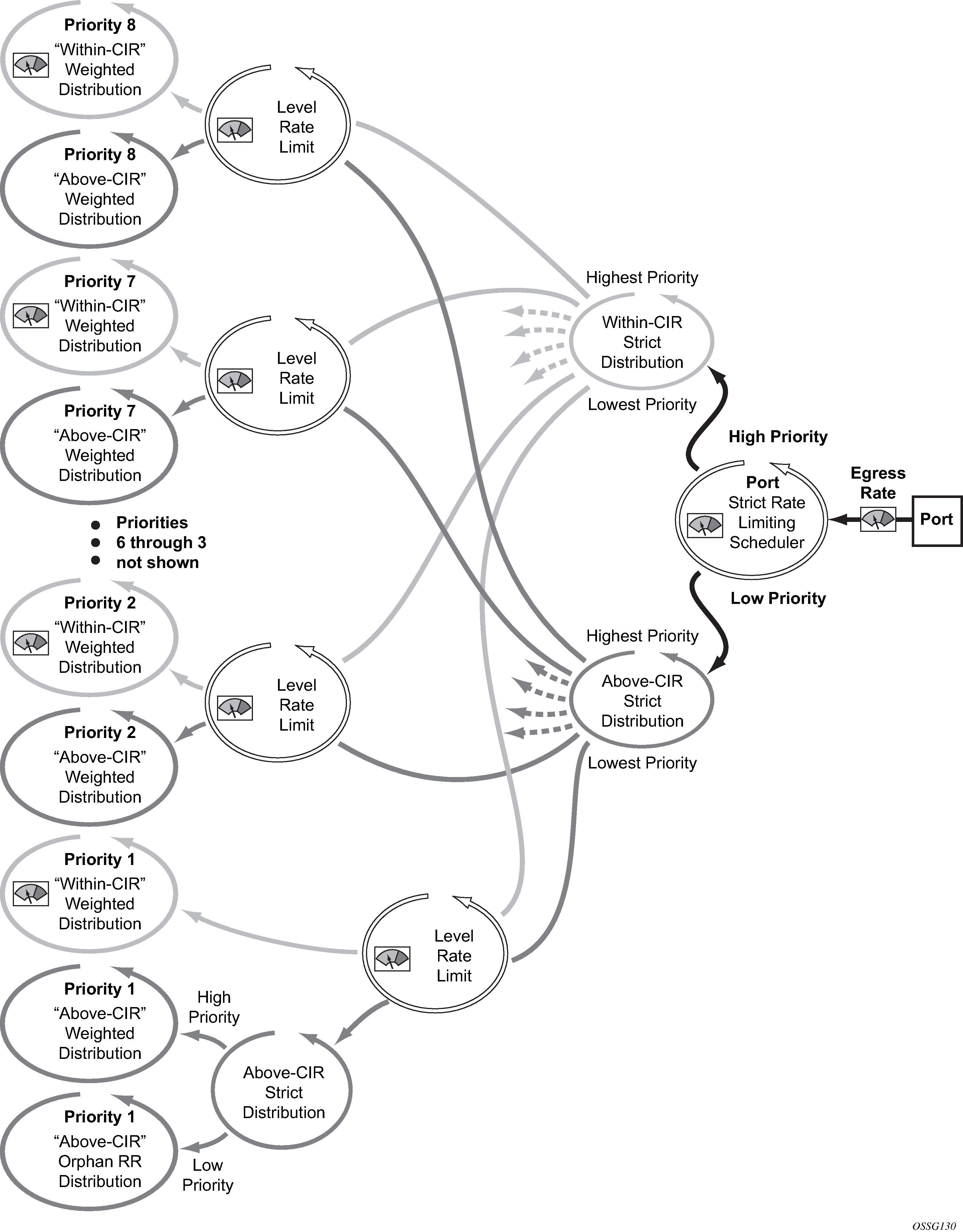 The second tier receives bandwidth from the first tier in two priorities: a within-CIR loop and an above-CIR loop. The second-tier within-CIR loop provides bandwidth to the third-tier within-CIR loops, one for each of the eight priority levels. The second tier above-CIR loop provides bandwidth to the third-tier above-CIR loops for each of the eight priority levels.