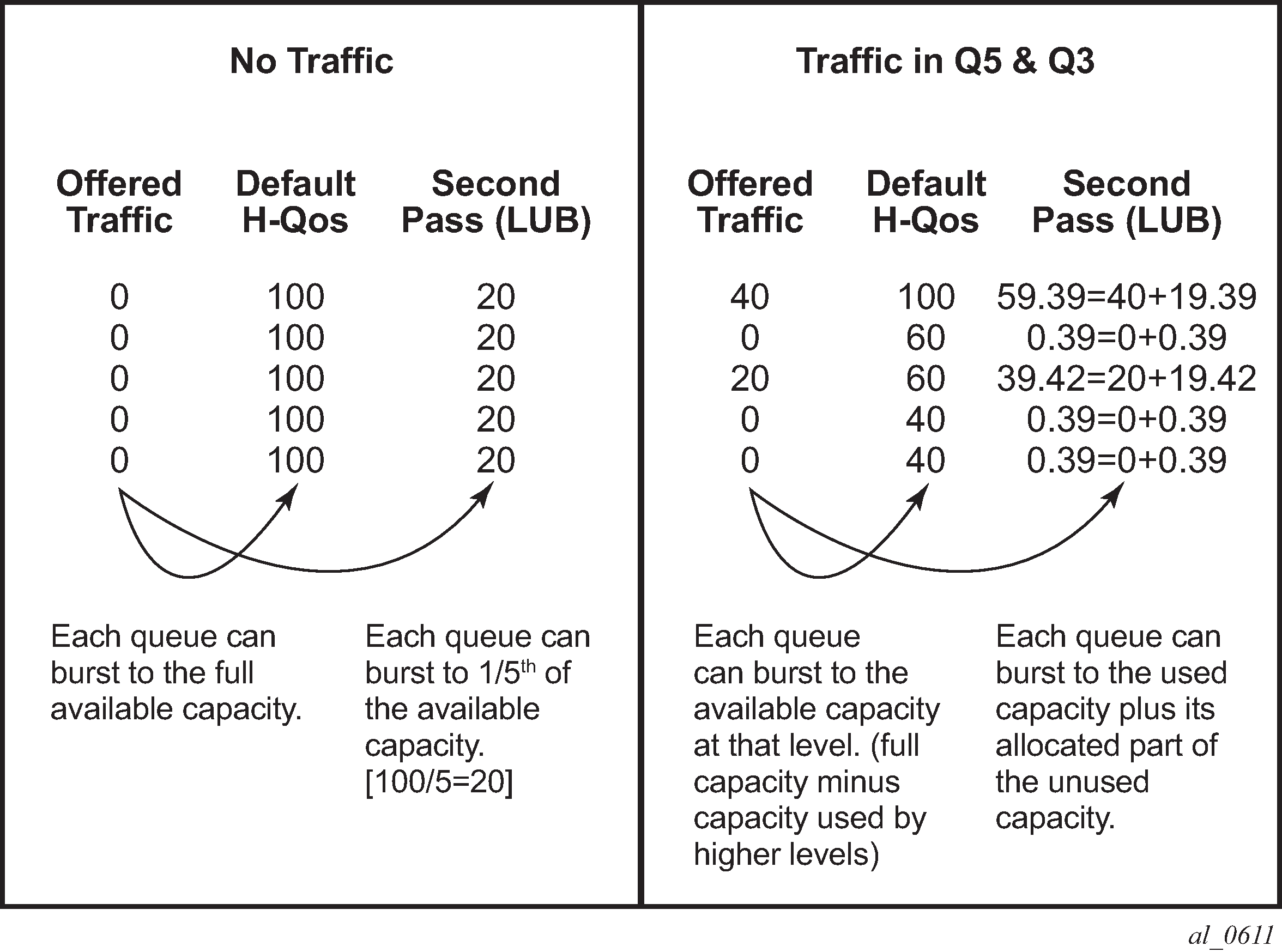 The default port scheduler H-QoS algorithm distributes bandwidth to its members by performing two allocation passes, one within CIR and one above CIR. Within each pass, it loops through the bandwidth distribution logic for its members by allocating bandwidth that is either consumed or unconsumed by each member (based on the member offered rate).