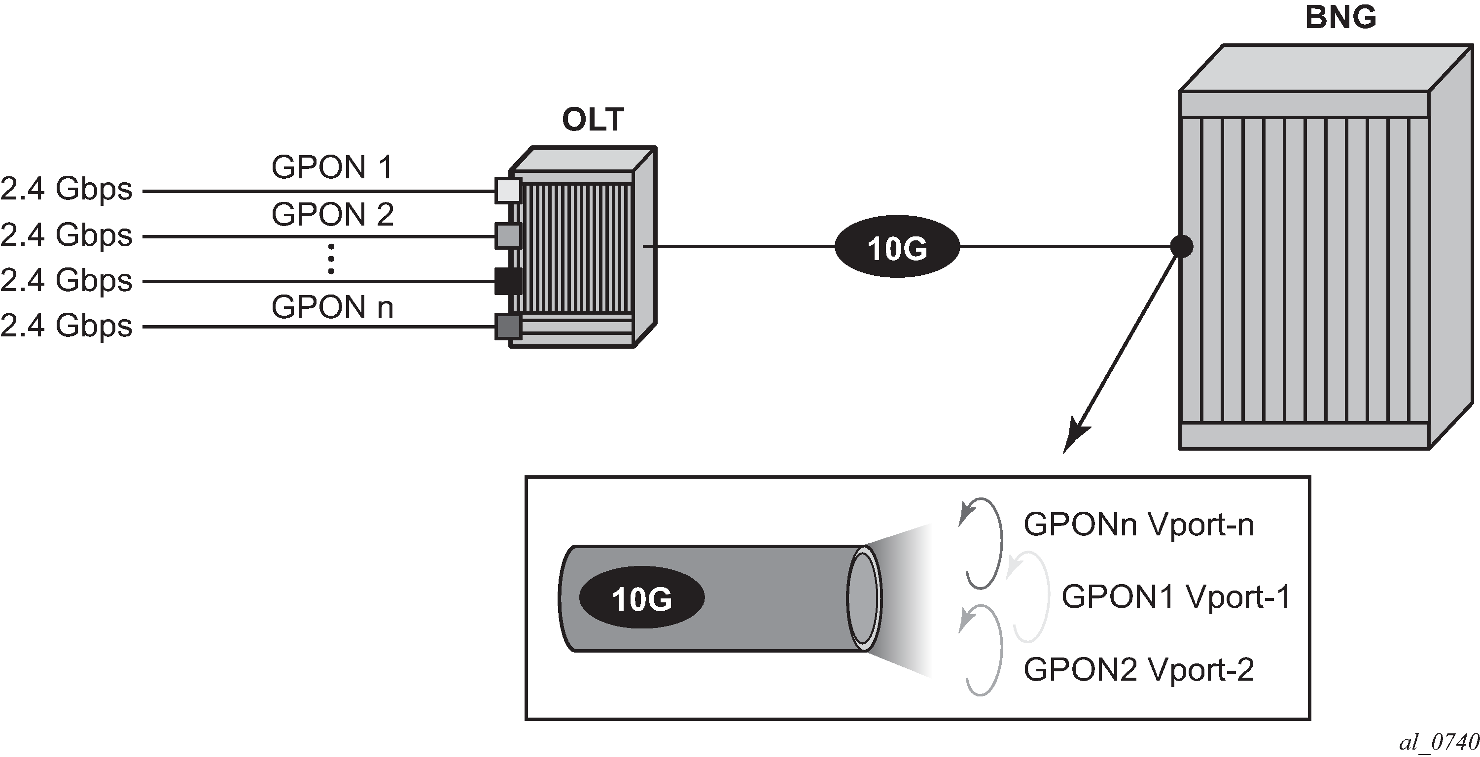 The example in GPON bandwidth control through Vport shows Vports representing GPON ports on an OLT. For capacity planning purposes, it is necessary to know if the GPON ports (Vports) are congested. Frequent and prolonged congestion on the Vport prompts the user to increase the offered bandwidth to its subscribers by allocating additional GPON ports and subsequently moving the subscribers to the newly allocated GPON ports.