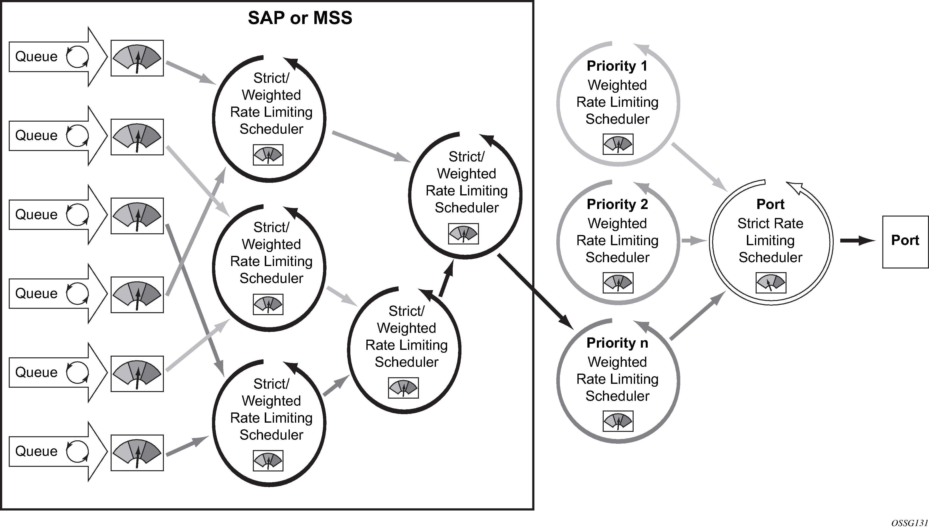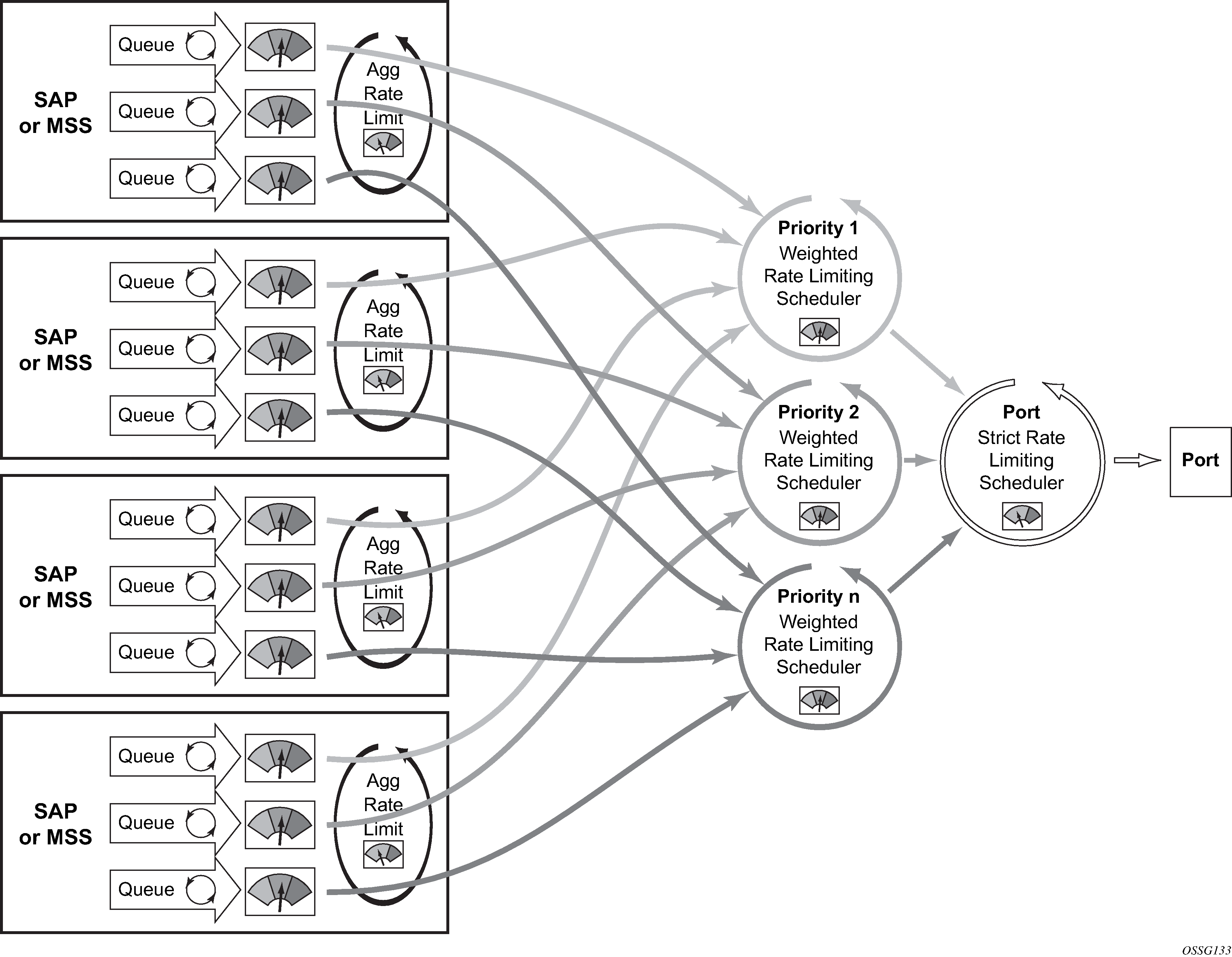 Direct service or subscriber or multiservice site association to port scheduler model also shows the optional aggregate rate limiter at the SAP, multiservice site or subscriber or multiservice site level. The aggregate rate limiter is used to define a maximum aggregate bandwidth at which the child queues and policers, if used, can operate. While the port-level scheduler is allocating bandwidth to each child queue, the current sum of the bandwidth for the service or subscriber or multiservice site is monitored. When the aggregate rate limit is reached, no more bandwidth is allocated to the children associated with the SAP, multiservice site, or subscriber or multiservice site. Aggregate rate limiting is restricted to the single scheduler policy model and is mutually exclusive to defining SAP, multiservice site, or subscriber or multiservice site scheduling policies.