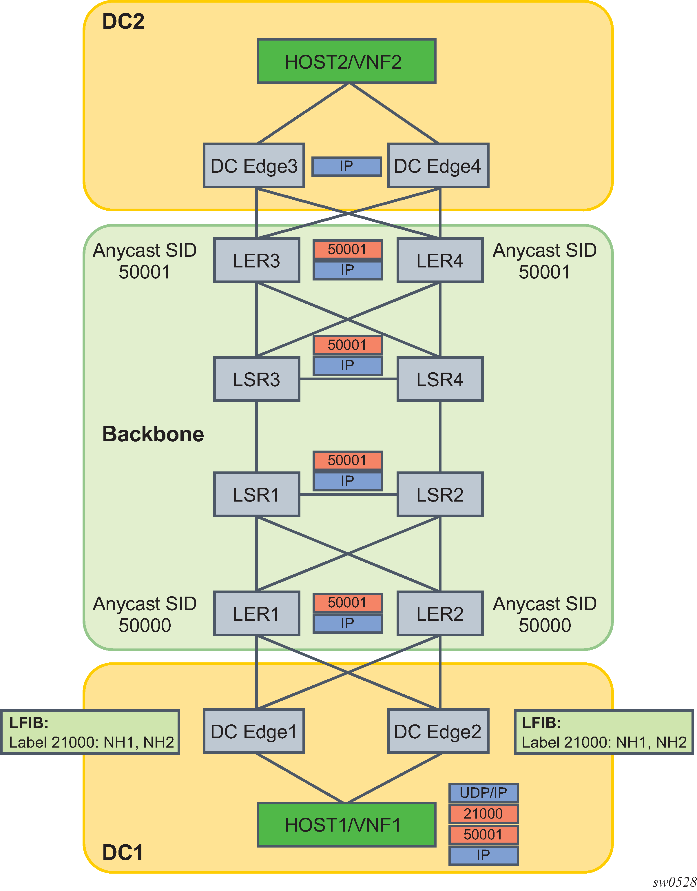 LER3/4 removes the anycast SID label and forwards the inner IP packet to DC Edge3/4 which then forwards to Host2 in DC2.