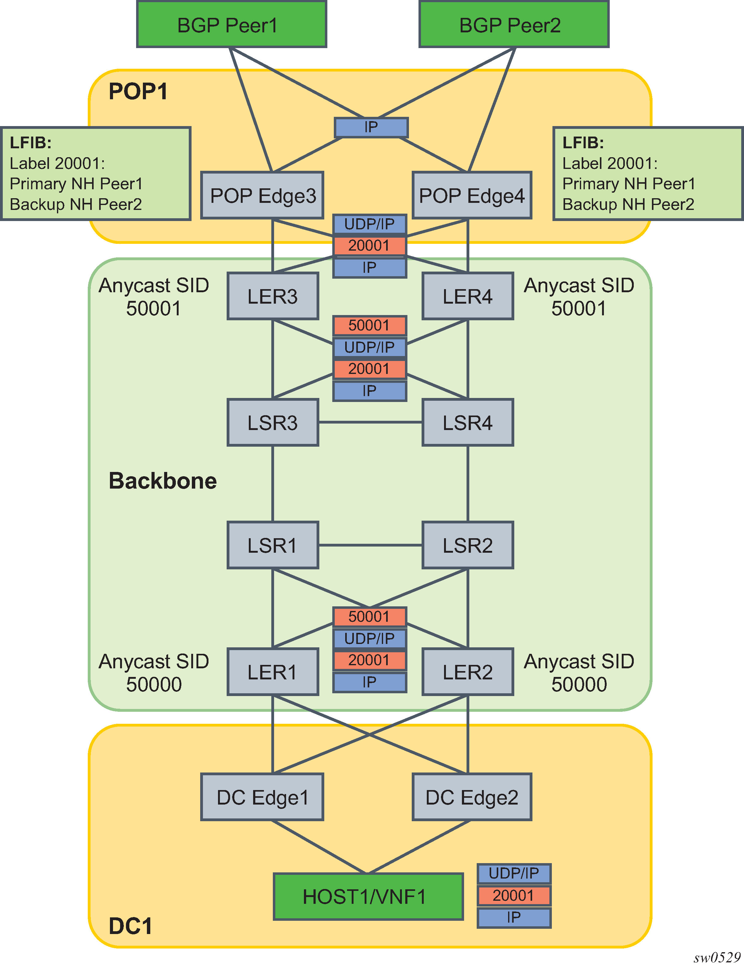 DC Edge1/2 receives a MPLS-over-UDP (or a MPLS-over-GRE) encapsulated packet from the host in the DC with the outer IP destination address set to the remote POP Edge3/4 routers in peering POP1 (anycast address). The host also pushes the static label 20001 for the remote external BGP Peer1 it wants to send to.