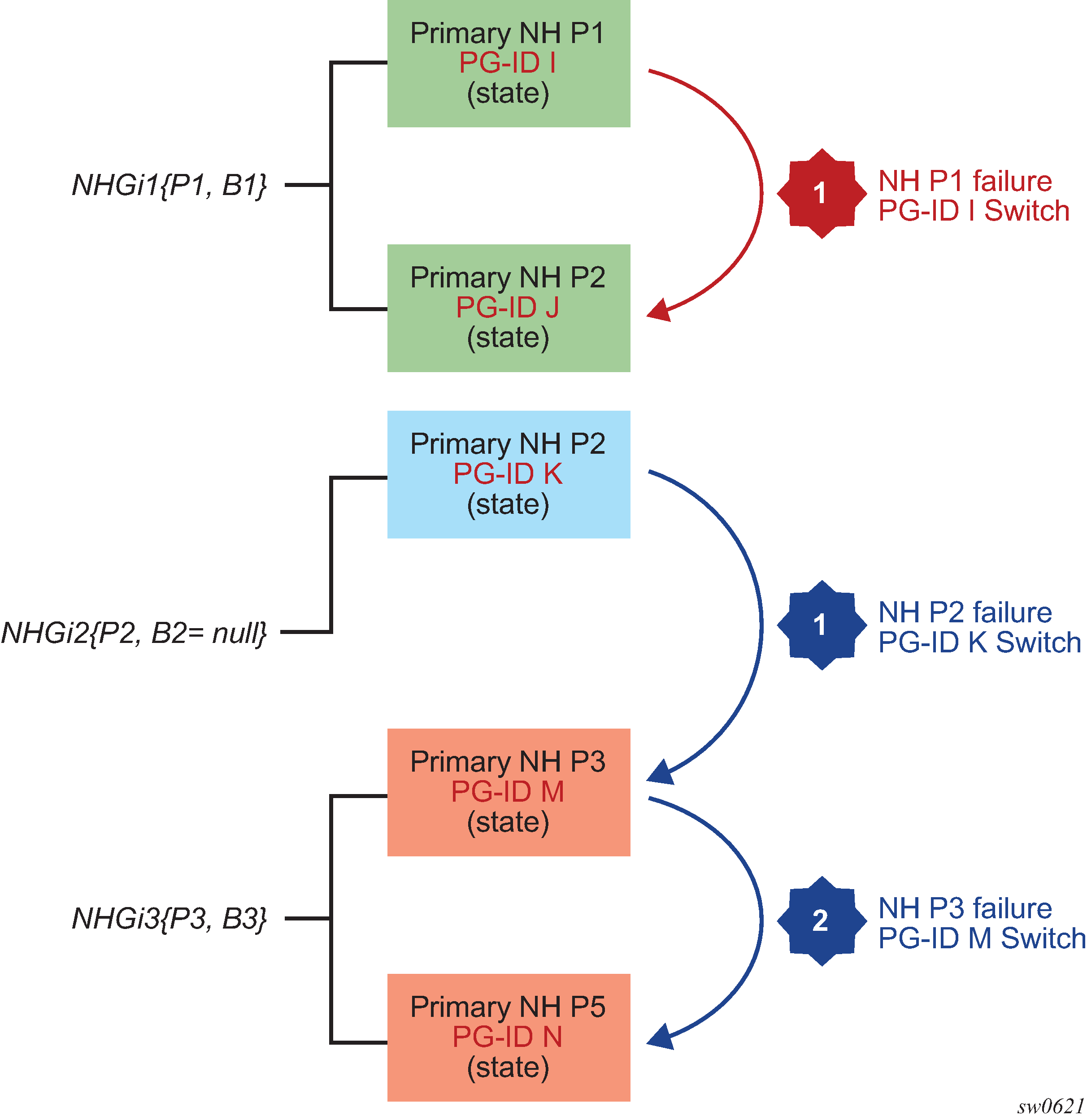 If the primary next hop is operationally ‟down”, the NHG uses the backup next hop if it is UP. If both are operationally DOWN, the NHG is DOWN. See Datapath support for details of the active path determination and the failover behavior.