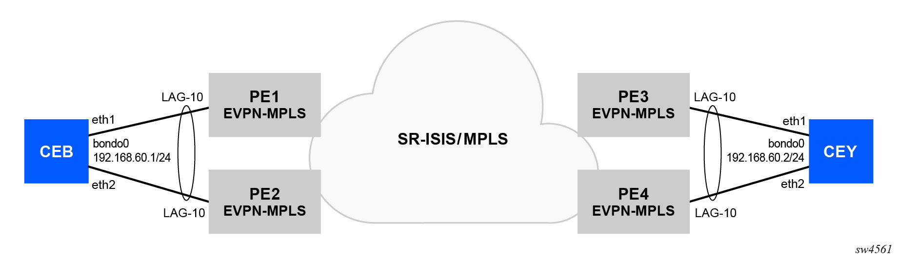 The client on either side is multihomed to two PE devices. An EVPN-MPLS service will be created to establish communication between the clients. SR-ISIS will be used as the transport protocol. See Segment routing for information about the relevant SR-ISIS configuration.