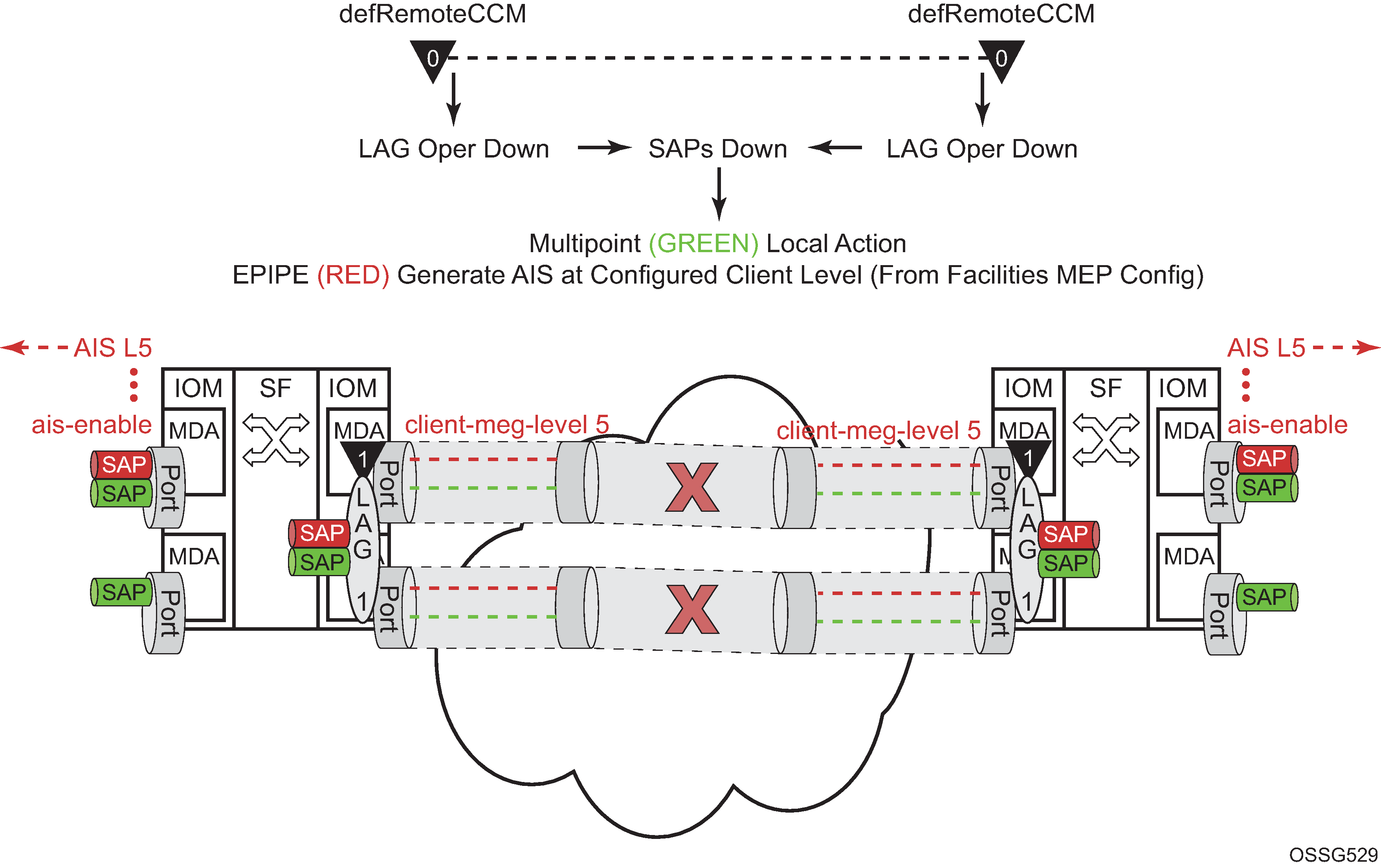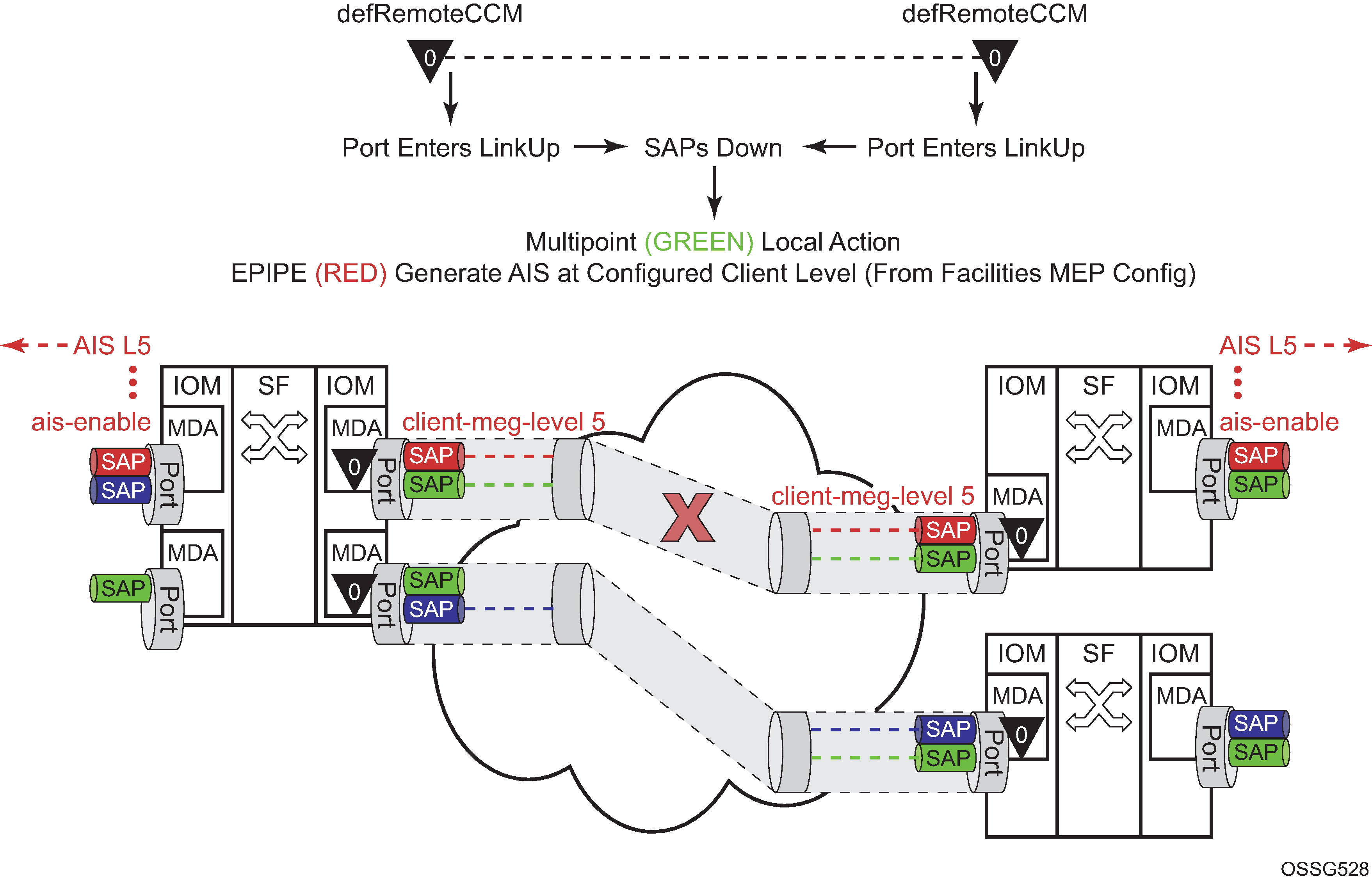 A facility MEP allows for the scaling improvements using fate sharing and leveraging OAM mapping. The OAM mapping functions are part of the fault propagation functions and allow ETH-CFM to move from alarms only to network actions. Service-based MEPs are not required to generate AIS in reaction to a facility MEP fault. OAM mapping and generation of fault via fault-propagation means or the AIS function are only available for Epipe services. There is no equivalent AIS generation as part of the facility fault for VPLS, IES, and VPRN. Service MEPs do not require the SAP transition in the VPLS, IES, and VPRN service context. Normal SAP transition functions do not occur when these services are configured to accept the tunnel fault, or in reaction to a facility fault, where the underlying port or LAG transitions the SAP.