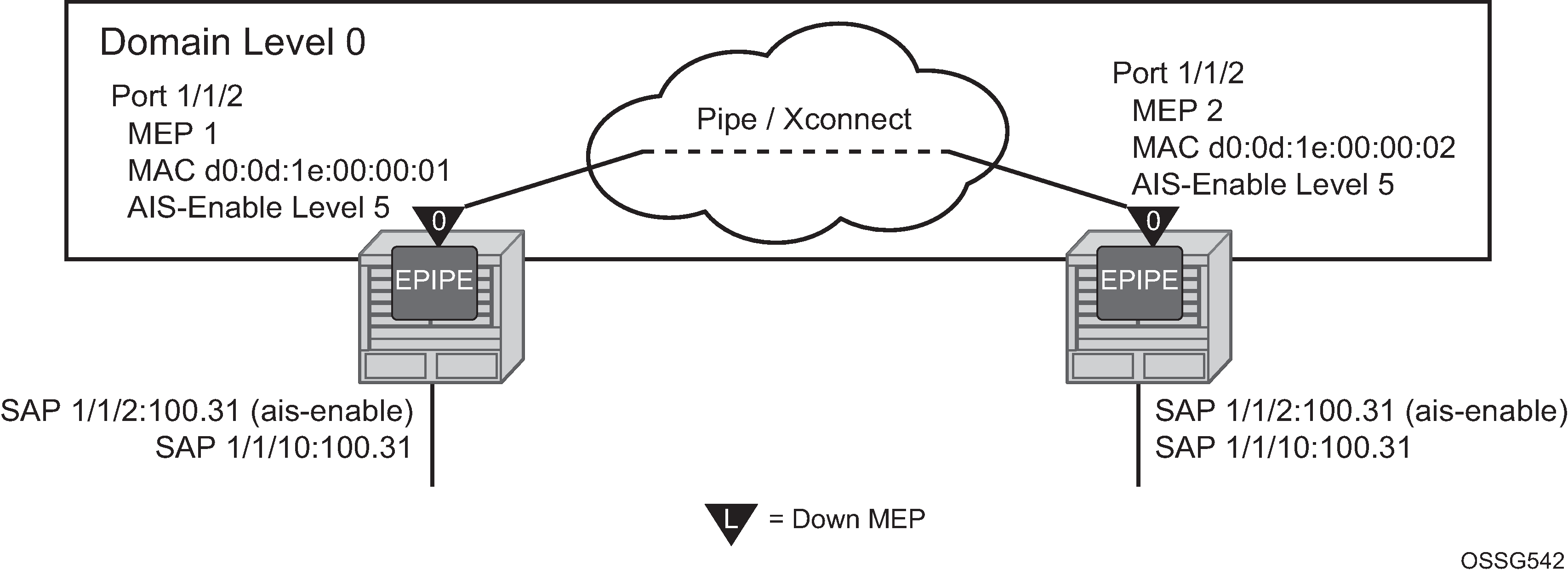 If the user requires an MP on the SAP or SDP binding, an up MEP may be created at the same level as the vMEP on the appropriate SAP or SDP binding to perform the same function as the filter but at the specific level of the MEP.