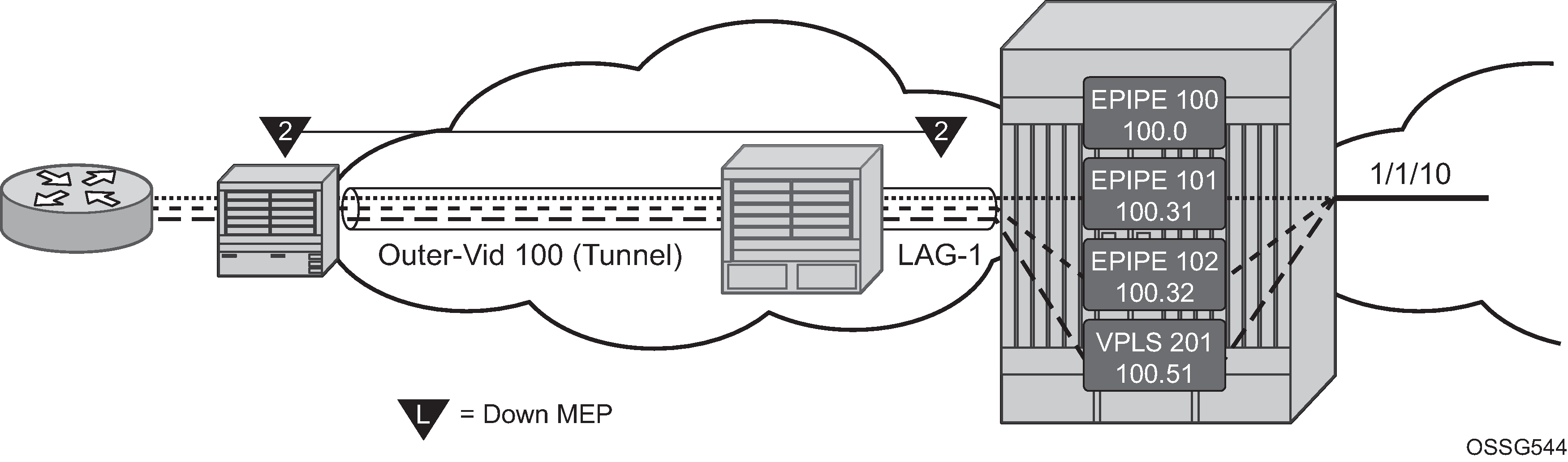 - tunnel (logical) – enables fate sharing of a MEP configured on a QinQ encapsulated access LAG and outer VLAN-ID