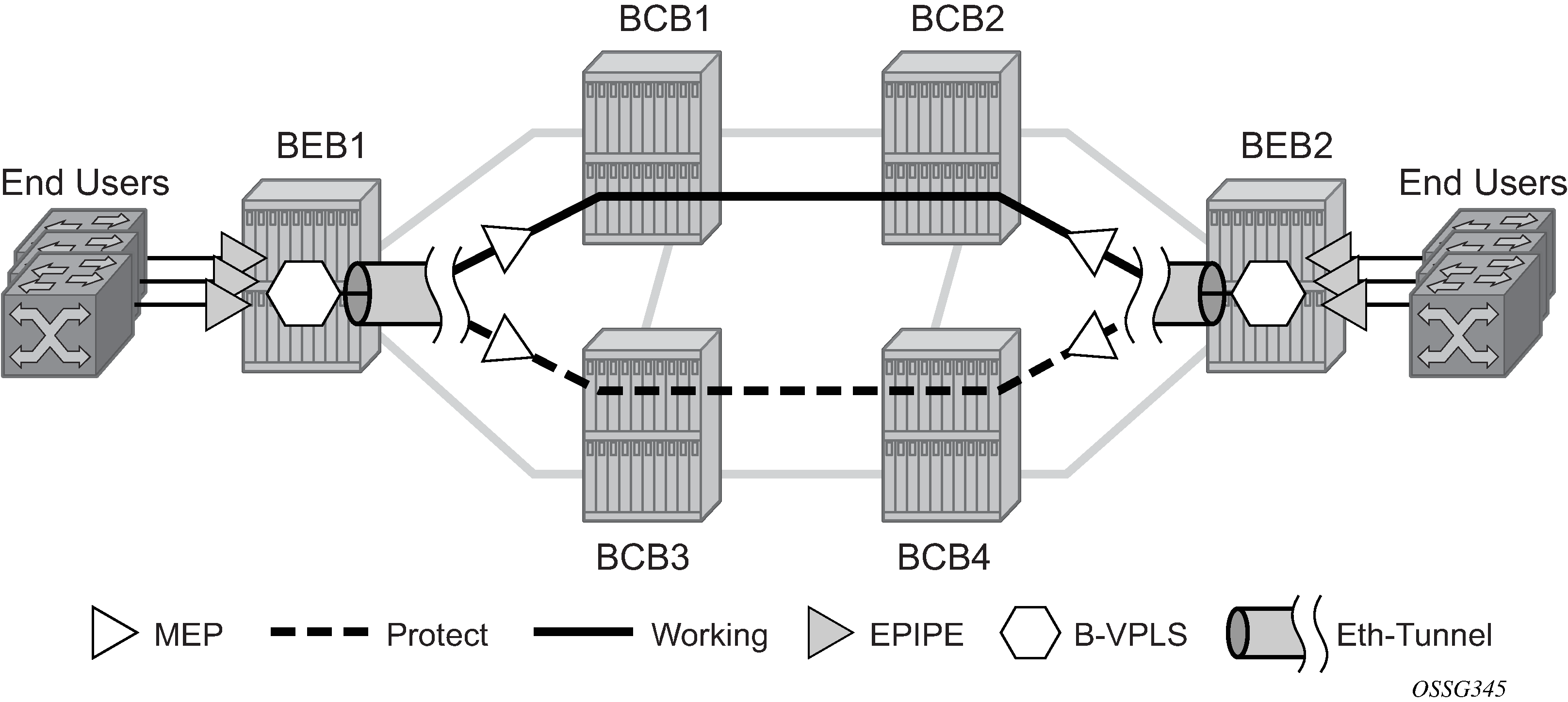 Within each path, Y.1731 Maintenance Entity Group (MEG) Endpoints (MEPs) are used to exchange APS-specific information (specifically to co-ordinate switchovers) as well as optionally fast Continuity Check Messages (CCM) providing an inherent fault detection mechanism as part of the protocol. Failure detection of a working path by one of the mechanisms triggers to move from working to protecting circuits. Upon failure, re-convergence times are a dependent on the failure detection mechanisms. In the case of Y.1731, the CCM transmit interval determines the response time. The OS supports message timers as low as 10 milliseconds. Alternatively, 802.3ah (Ethernet in the First Mile) or simple Loss of Signal can act as a trigger for a protection switch where appropriate.