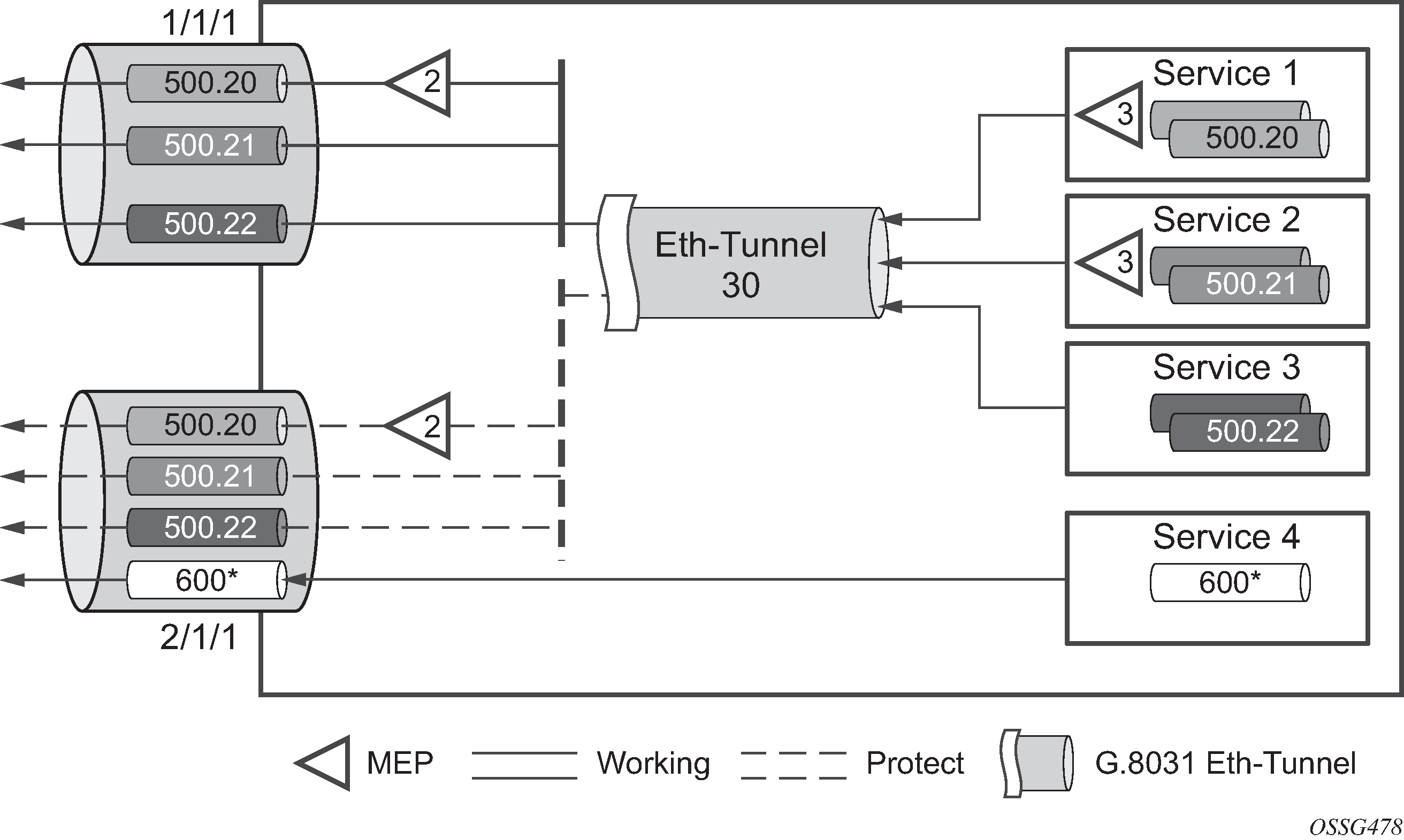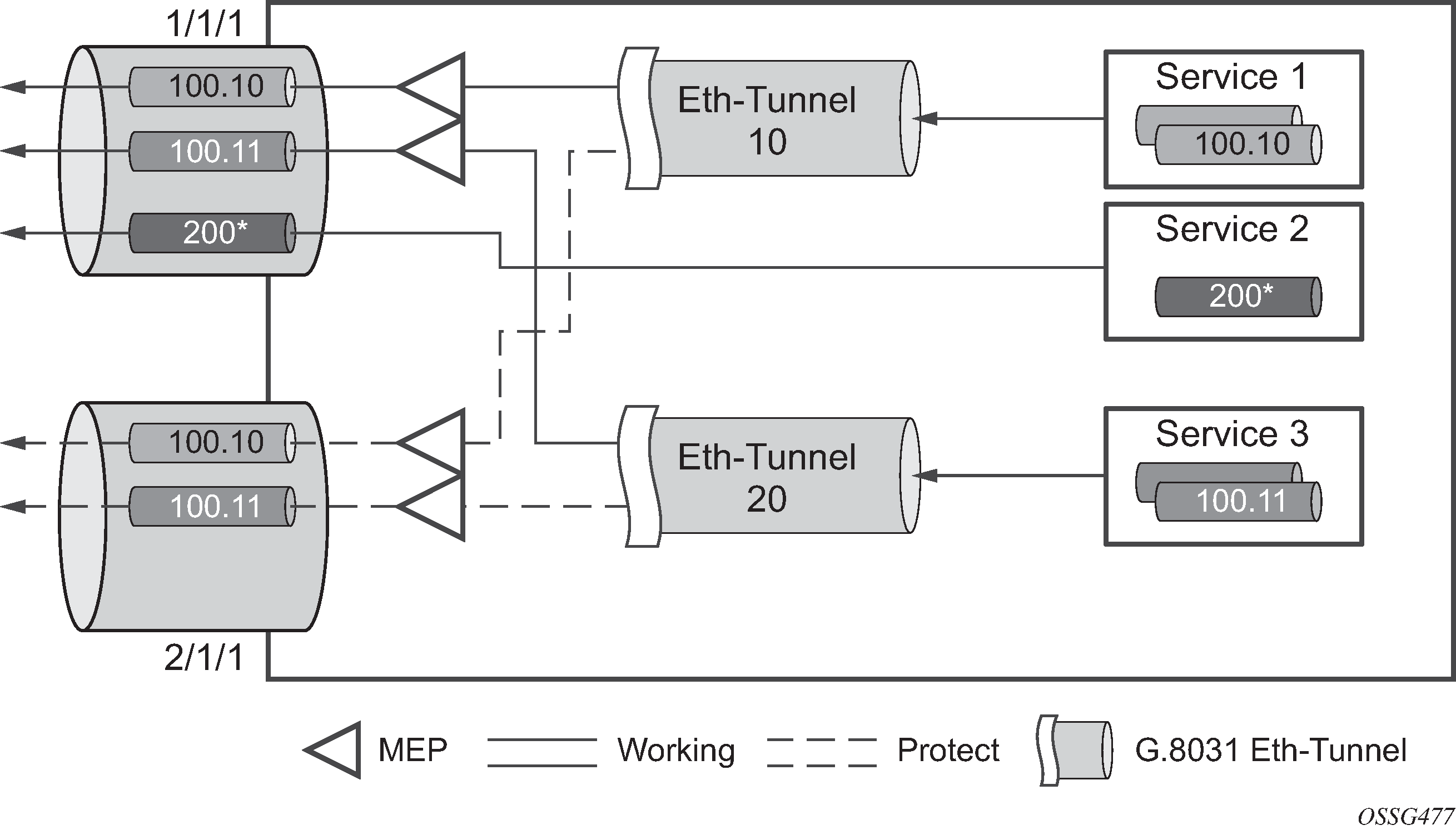 In the implementation, the Ethernet tunnel is a logical interface for a SAP defined Layer 2 service similar to a LAG. The implementation offers ITU G.8031 1:1 compliance as well as some added capabilities such as fate sharing and emulated LAG support. Other added capabilities include: