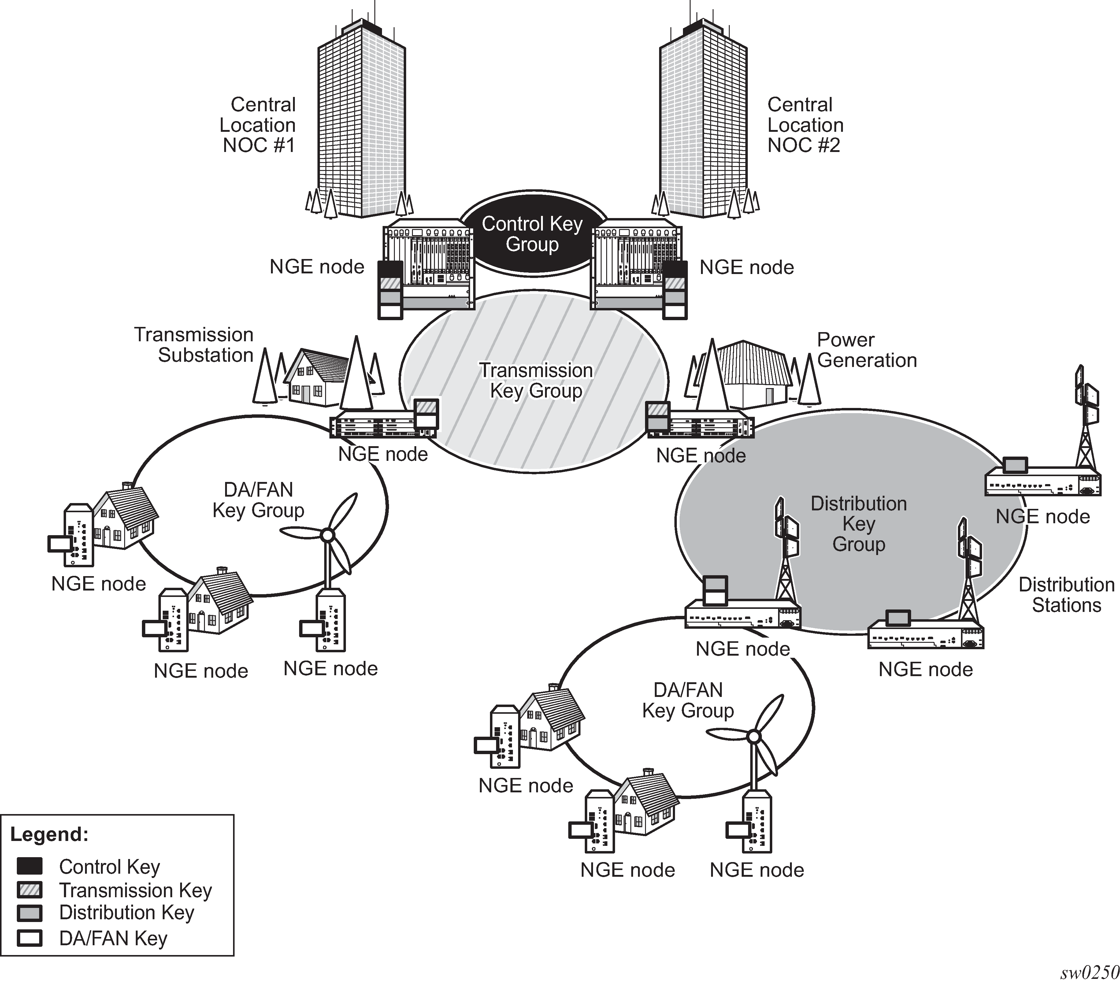 Key group partitioning shows a typical application of NGE key group partitioning in which there are several critical levels (tiers) of security that need to be considered. In this example, the protection of Distribution Automation and Field Area Network (DA/FAN) equipment are less critical than the Transmission or Distribution Substation network equipment. Ensure that nodes more at risk of a security breach do not contain more critical information than is necessary. Therefore, encryption keys for the sensitive portions of the network (such as control center traffic) should not be available on nodes that are at risk. The NGE feature enables users to partition and distribute encryption keys among different services, NGE domains, or nodal groups in a network. NGE partitions are enabled by configuring different key groups per security partition and applying those key groups as needed.