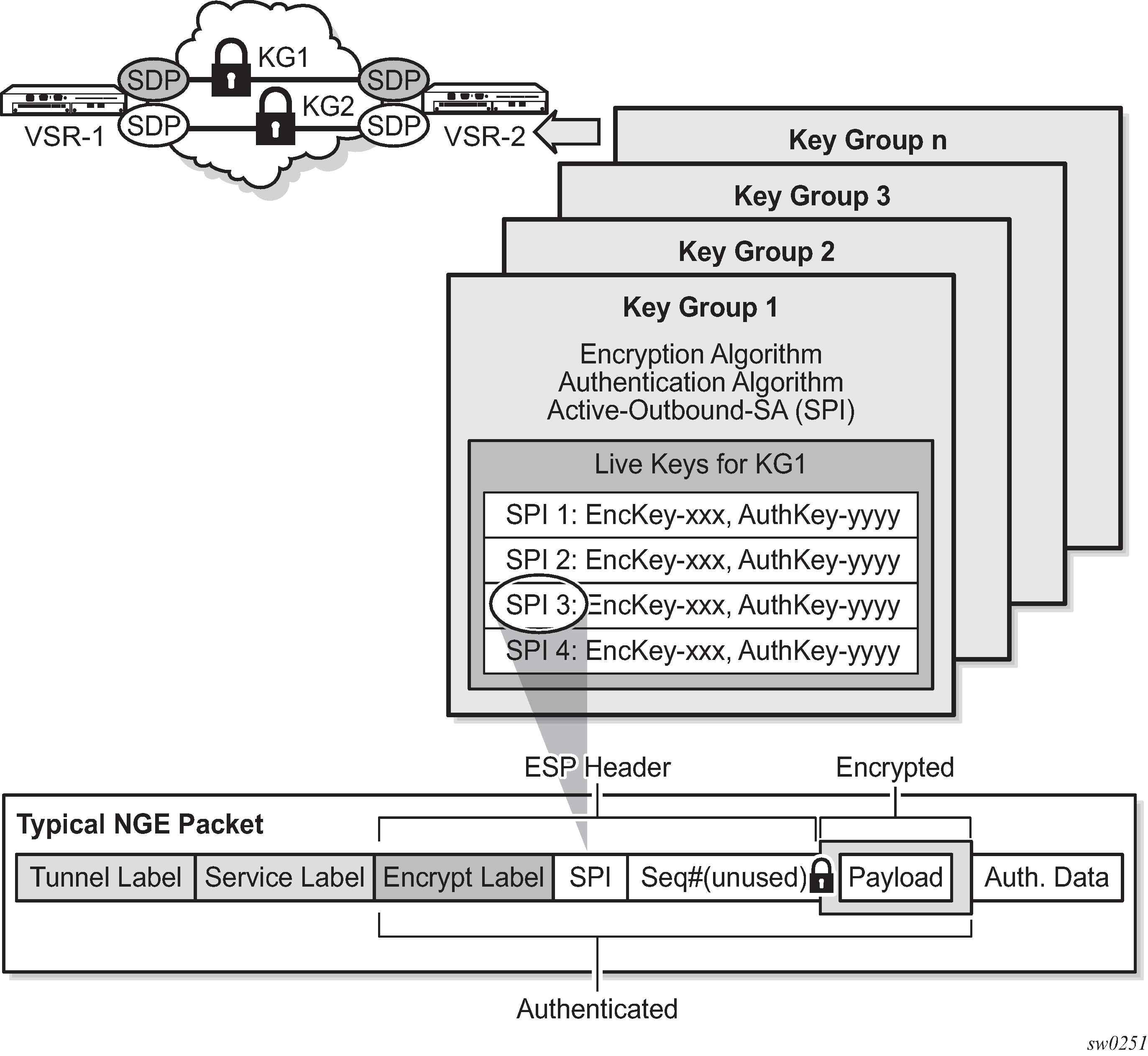 As shown in Key groups and a typical NGE packet, each SA is referenced by an SPI value, which is included in packets during encryption and authentication. SPI values must be numerically unique throughout all SAs in all key groups. If an SPI value is configured in one key group and an attempt is made to configure the same SPI value in another key group, the configuration is blocked.