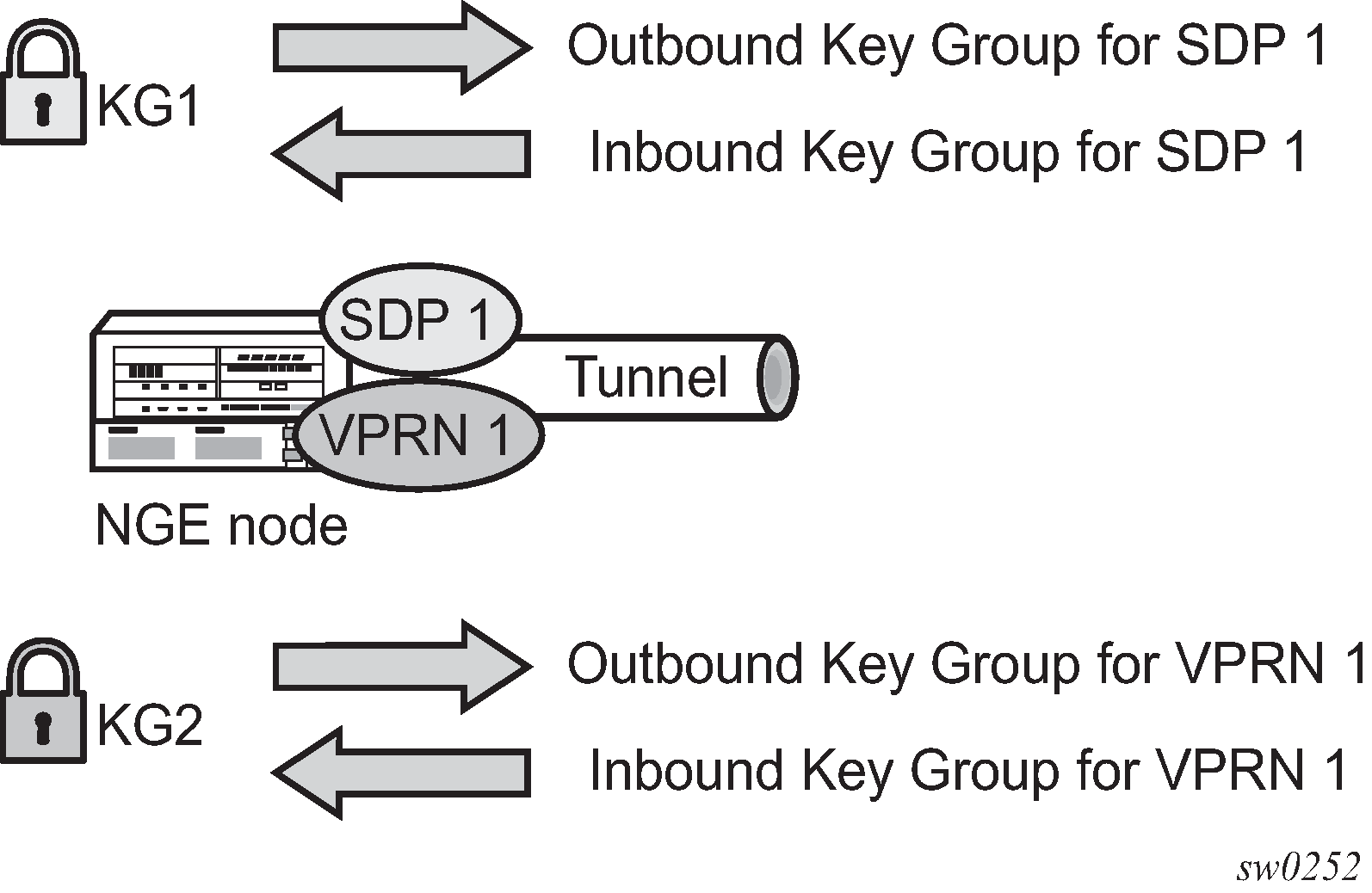 The NSP NFM-P acts as the key manager for NGE-enabled nodes and allocates the keys in key groups that are used to perform encryption and authentication. The NSP NFM-P ensures that all nodes in a key group are kept in synchronization and that only the key groups that are relevant to the associated nodes are downloaded with key information.