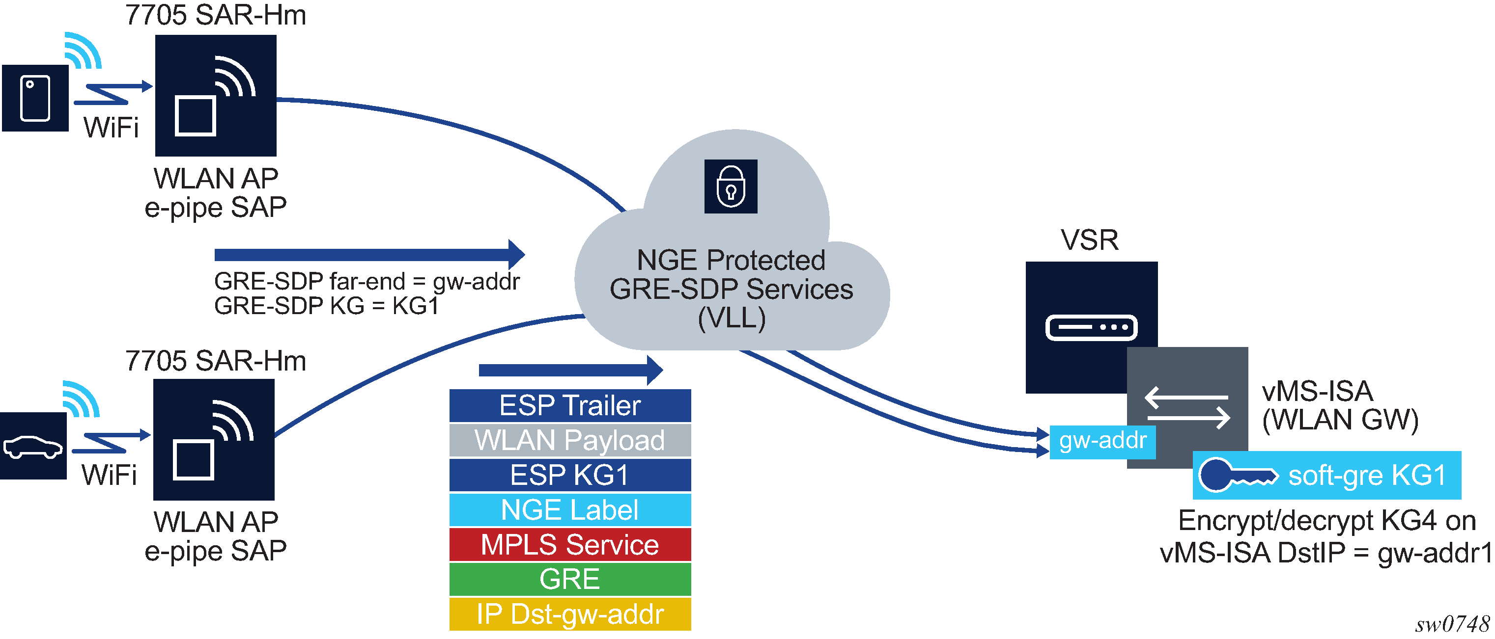 NGE is supported on the WLAN-GW to provide encryption of traffic to and from WLAN APs that support NGE, such as the 7705 SAR-Hm. As shown in Terminating NGE-protected WLAN AP traffic destined for the WLAN-GW, the application uses Epipe pseudowire services, as described in Pseudowire switching for NGE traffic and Pseudowire control word for NGE traffic, with L2oMPLSoGRE transport and NGE applied to the GRE-SDP.