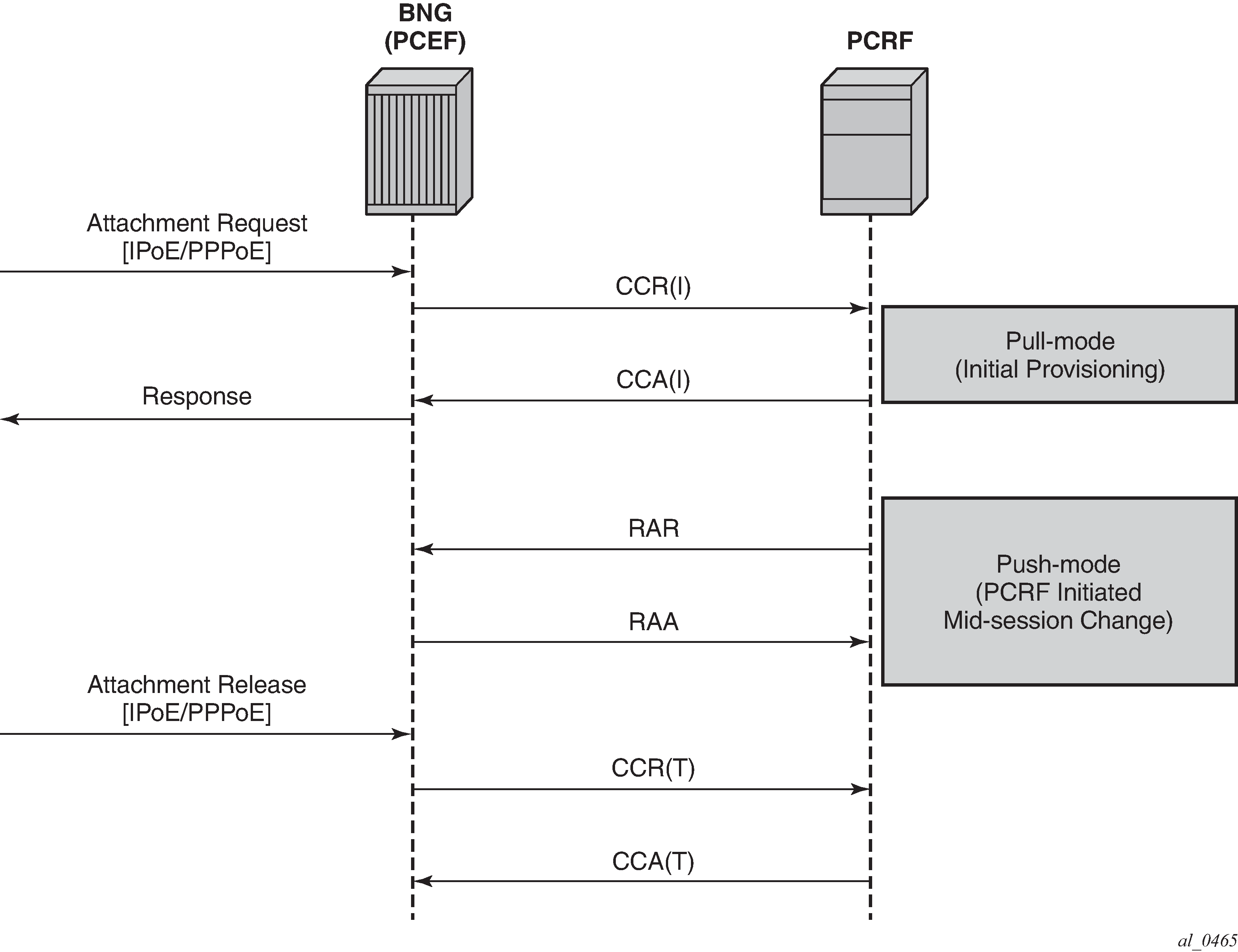 The direction of synchronization depends on the activity of a Gx sessions in ESM because UM is an integral part of Gx. Gx sessions in a dual-homed ESM environment follow the active or standby models, where the activity of Gx sessions can be distributed between the nodes, according to SRRP activity. SRRP as a basis of dual-homing in subscriber management is used to determine which node owns a Gx session. A Gx session maps to a IPoE/PPPoE session in a 1:1 manner. If multiple IPoE/PPPoE sessions share the same SLA profile instance (SPI), and with this the CCI, then the corresponding Gx sessions all share the same CCI. A Gx session under the SRRP instance in a master state is used to communicate with the PCRF servers, while the mirrored Gx session on the peering node with SRRP instance in the standby mode remains silent. In this context, Gx session can be considered as active or standby.