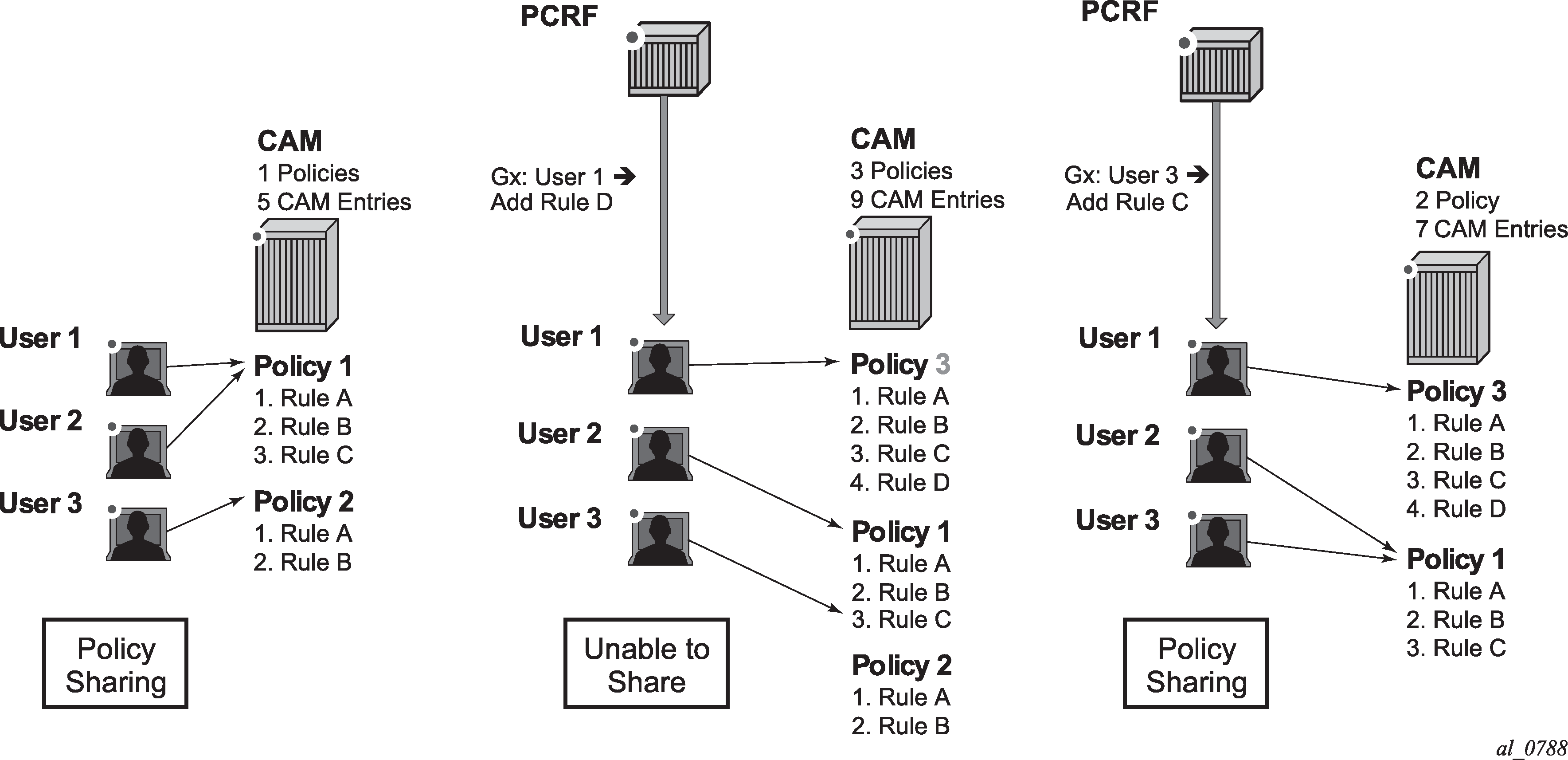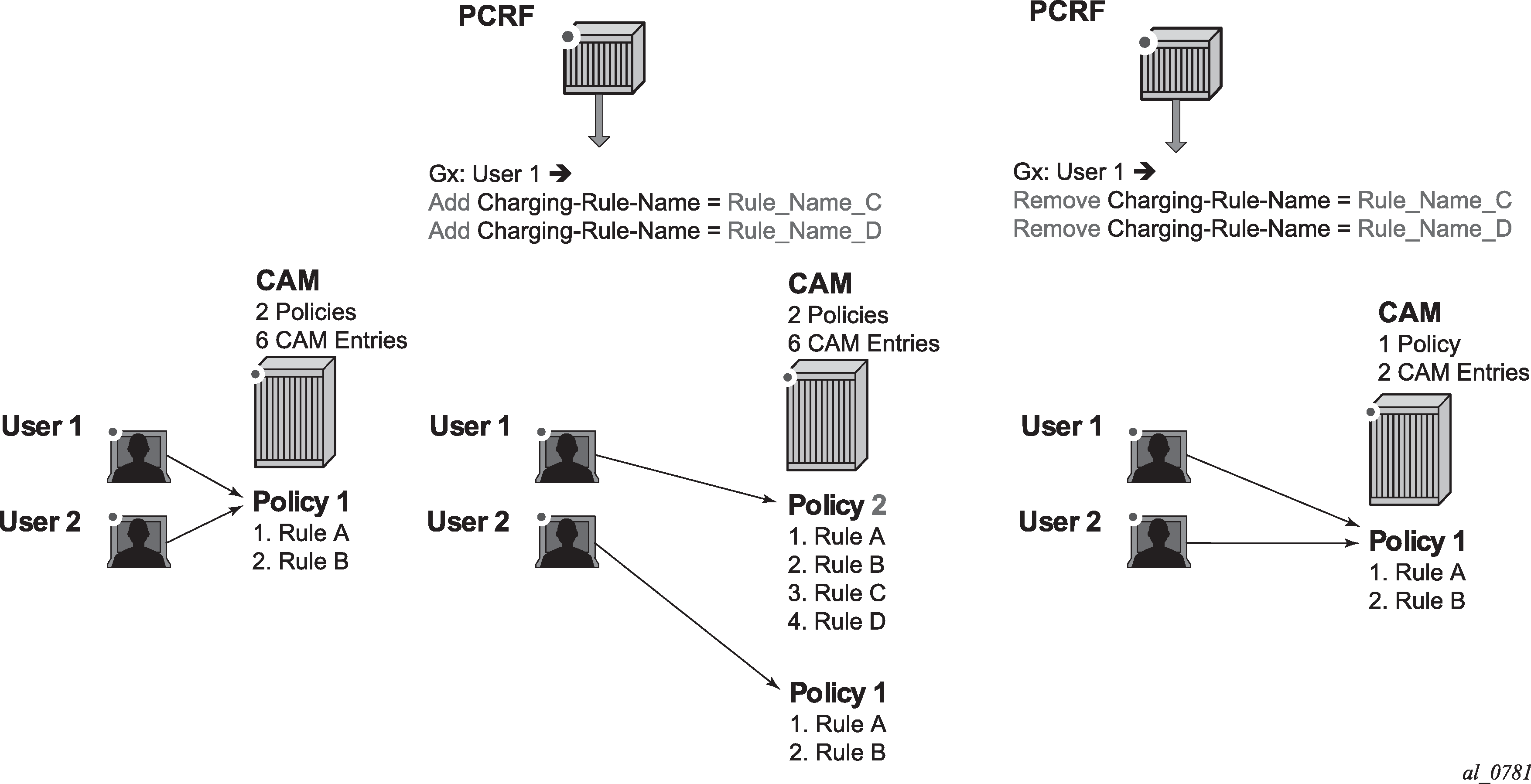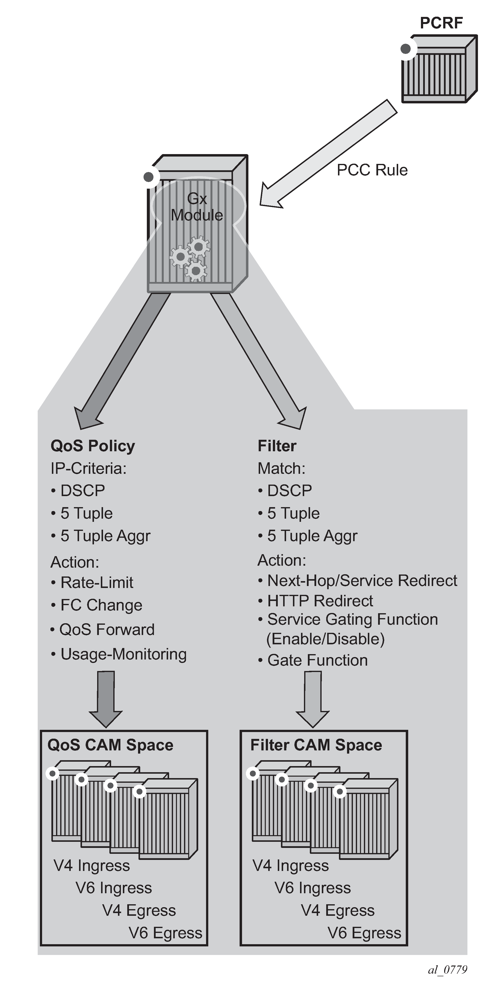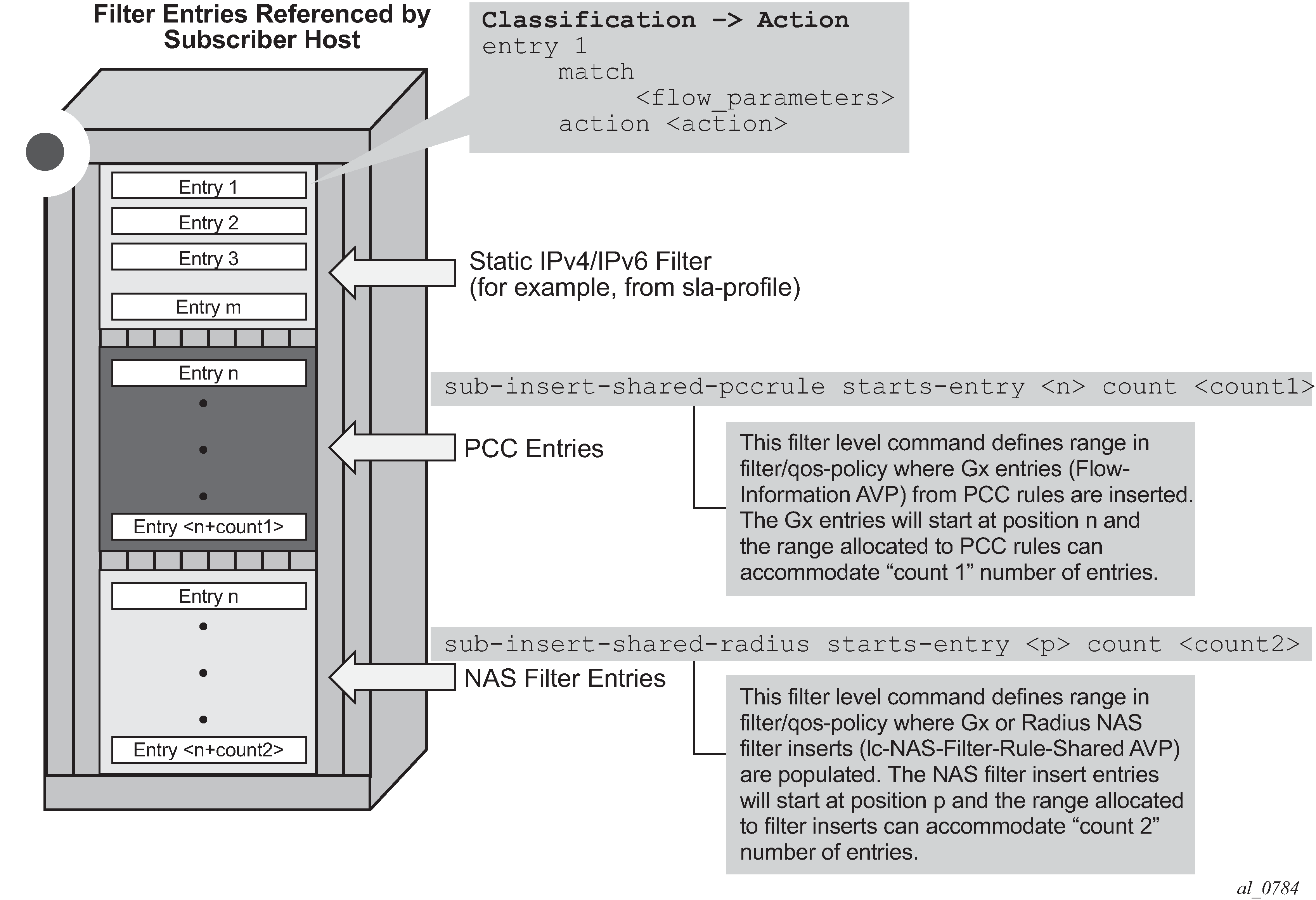 Gx flows are similar to dynamically created filter or ip-criteria (QoS) entries and are inserted within the entry range configured for the base filter/qos-policy.