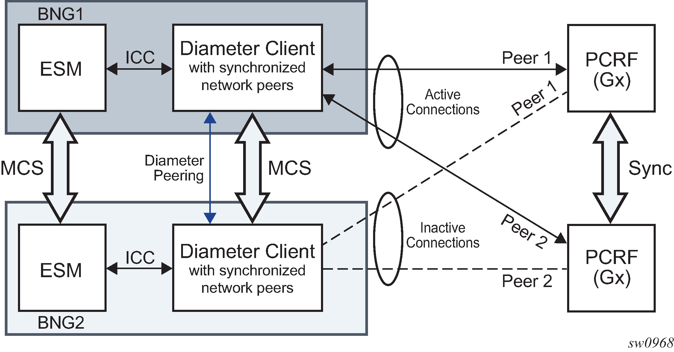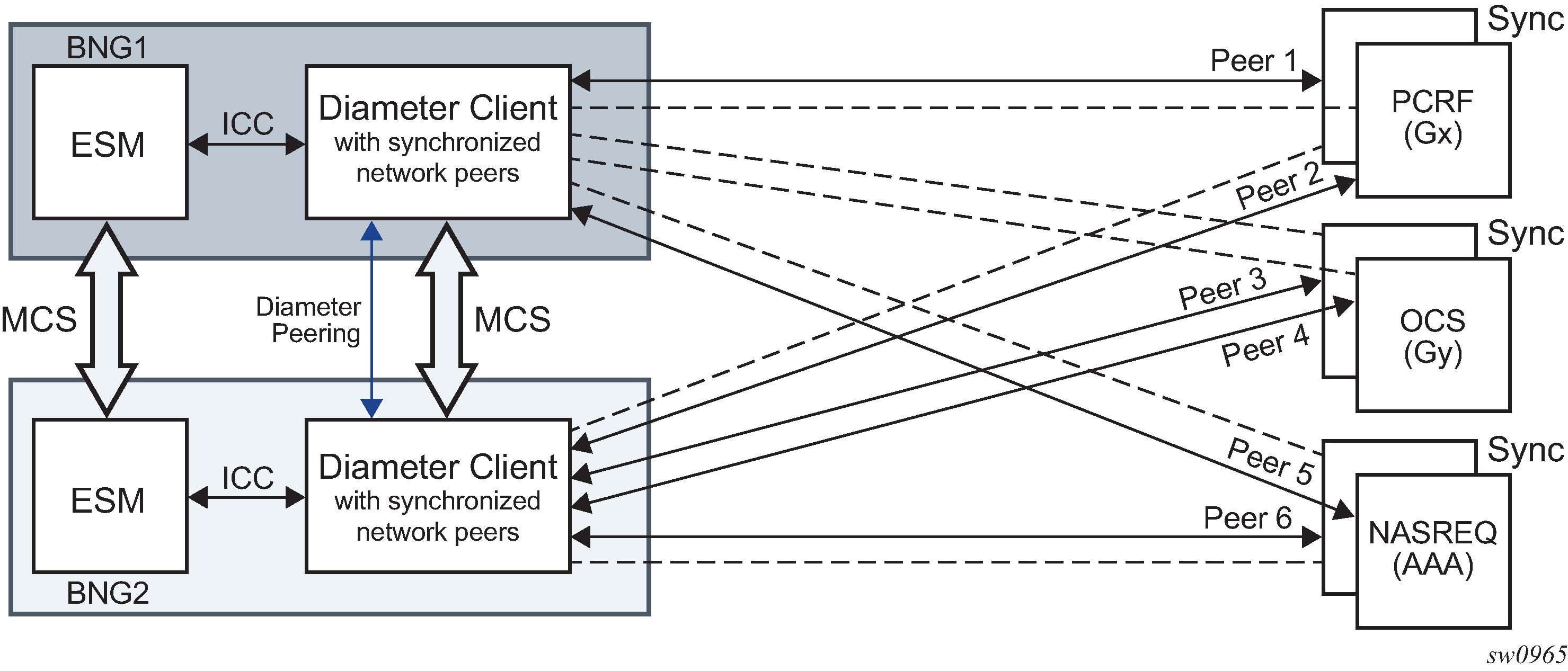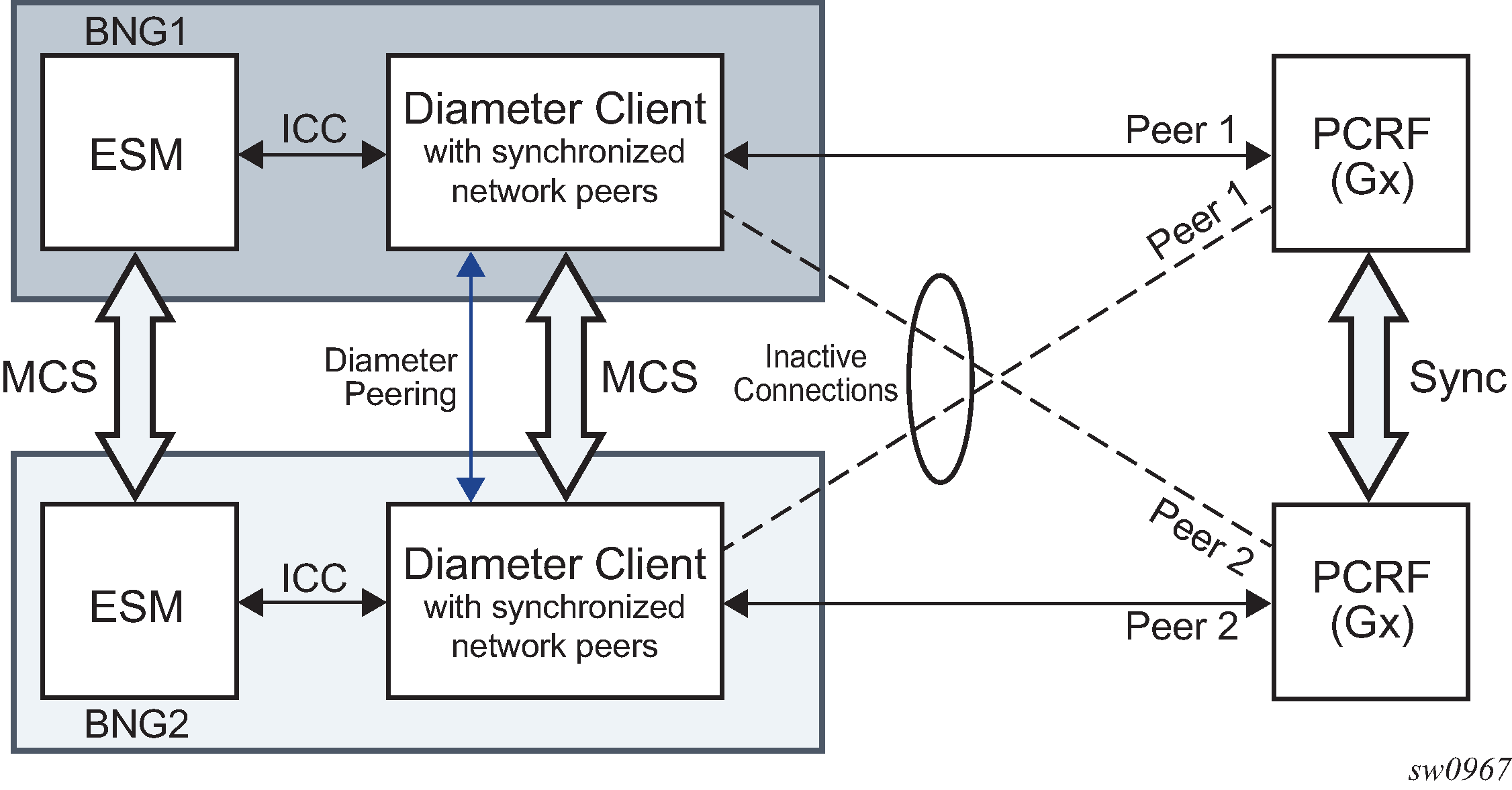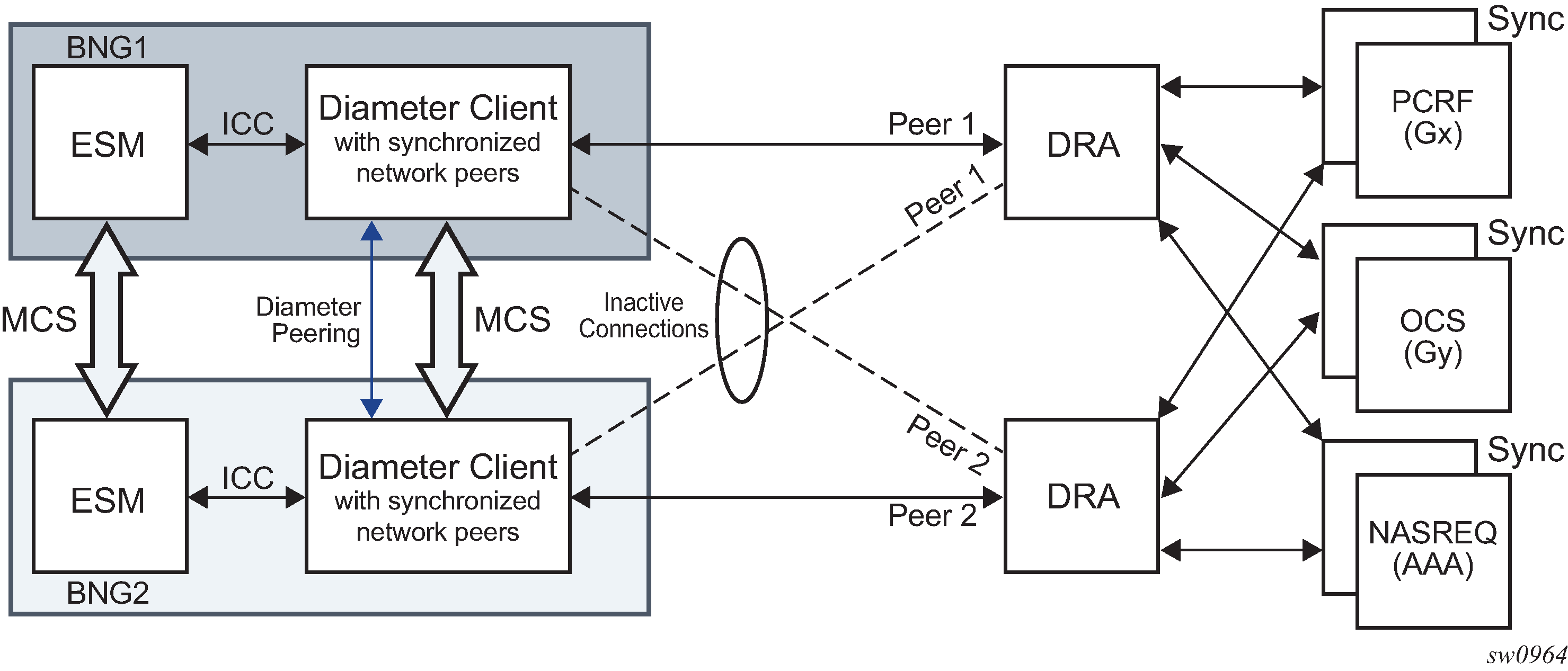 Two redundant Diameter SR nodes appear as a single Diameter entity, while maintaining a single peering connection with each network peer (in other words, only one BNG in the pair forms a peering connection with a Diameter peer on the network side). With this configuration, each network node (agents and servers) maintains a single, unambiguous path toward the pair of redundant SR nodes. The SR node selected to maintain this peering connection is chosen through the Multi-Chassis Synchronization (MCS) protocol that runs between the two nodes. The decision about which node opens the peering connection is made on a per-peer basis, which means that the networks peering connections can be distributed over the pair of redundant SR nodes.