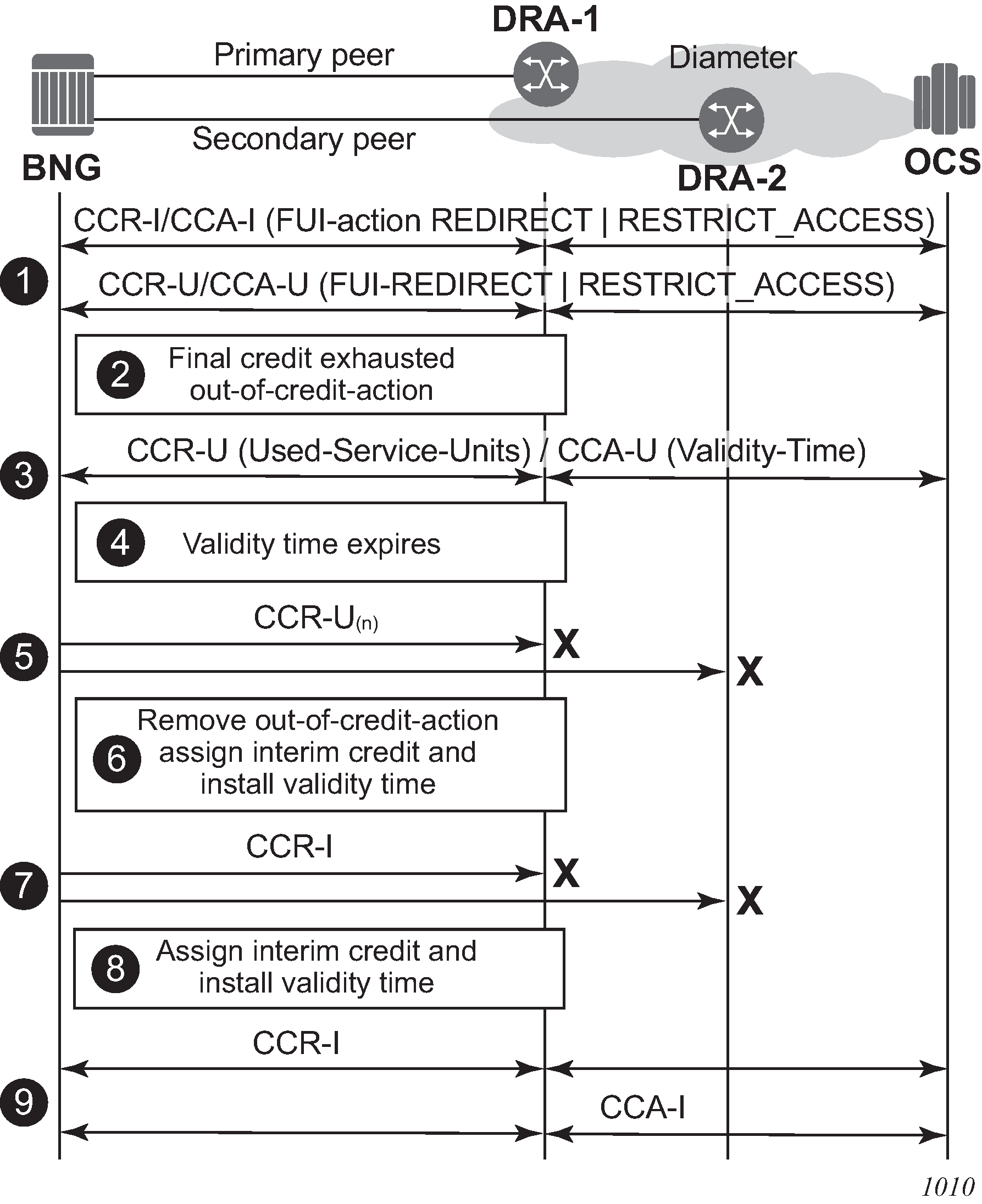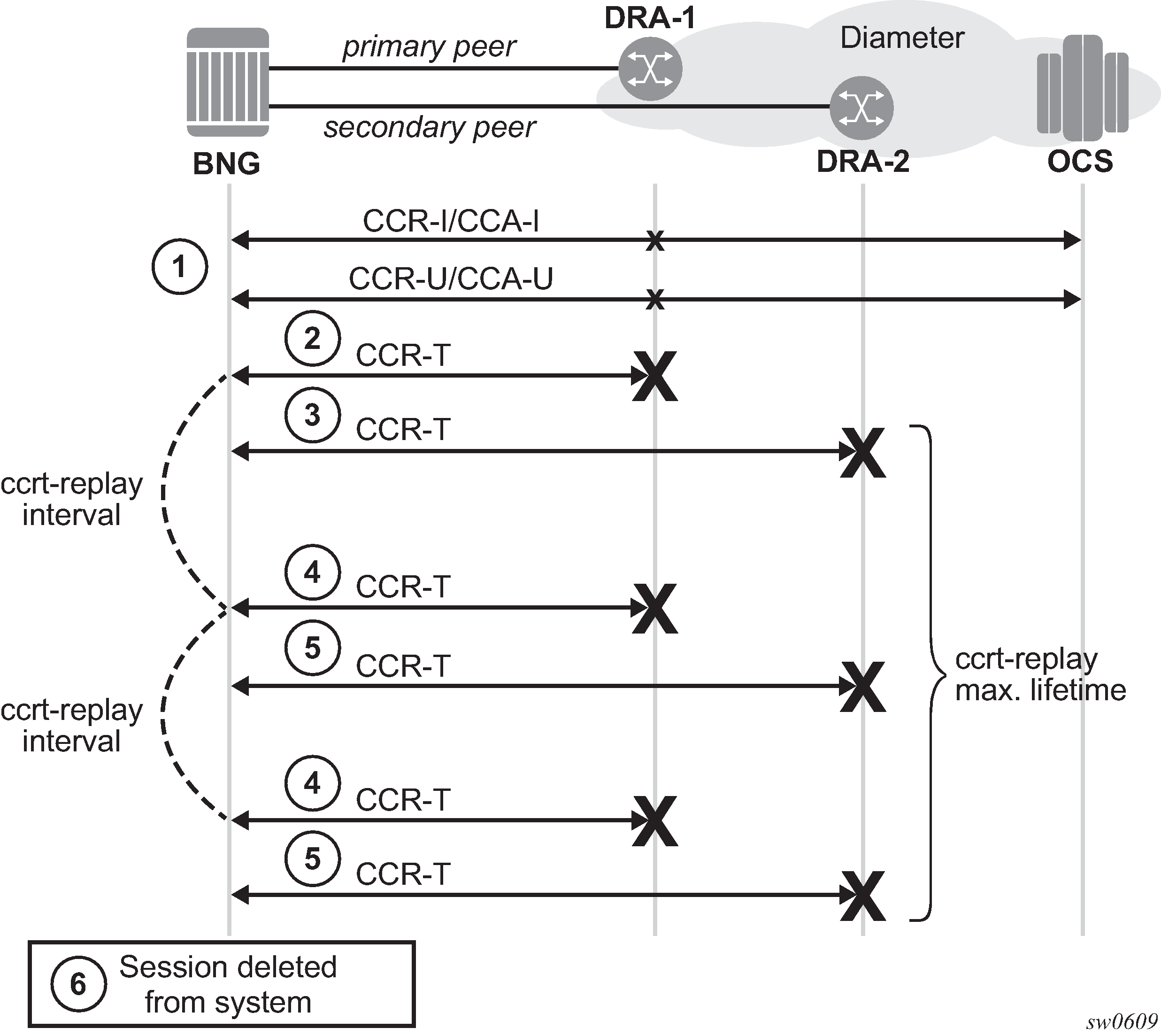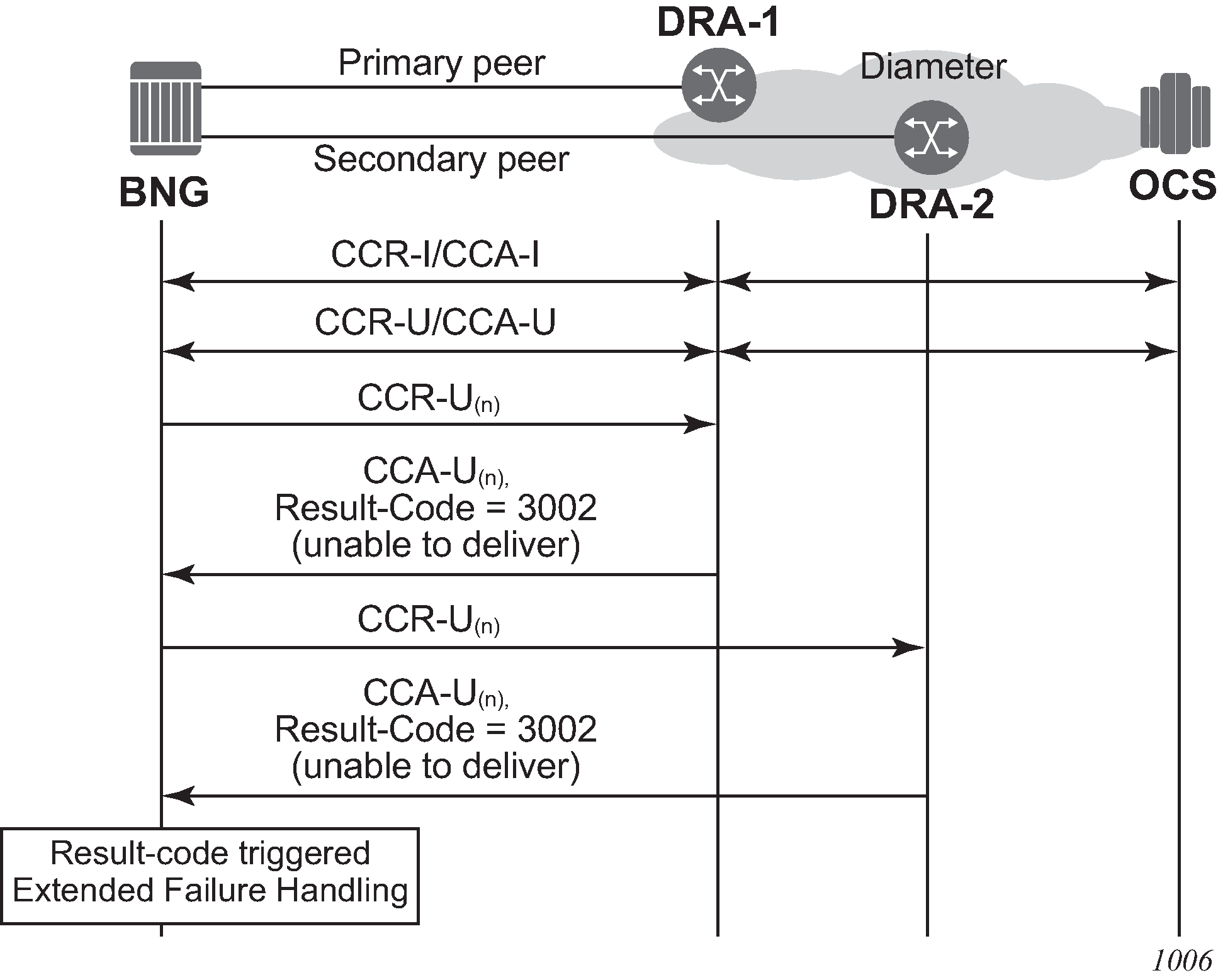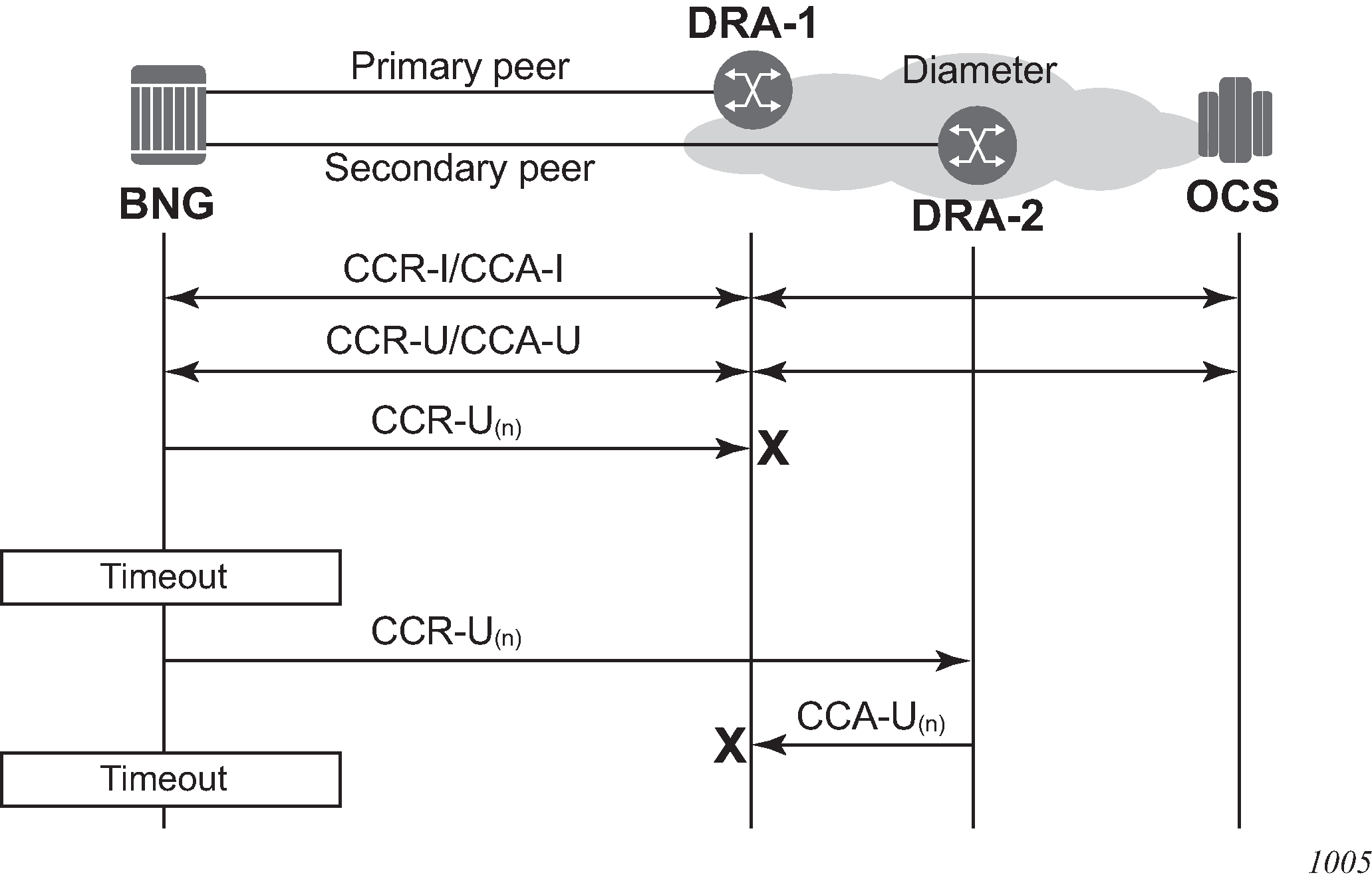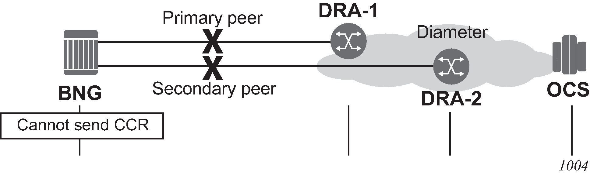 Two redundant Diameter SR nodes appear as a single Diameter entity, while maintaining a single peering connection with each network peer (in other words, only one BNG in the pair forms a peering connection with a Diameter peer on the network side). With this configuration, each network node (agents and servers) maintains a single, unambiguous path toward the pair of redundant SR nodes. The SR node selected to maintain this peering connection is chosen through the Multi-Chassis Synchronization (MCS) protocol that runs between the two nodes. The decision about which node opens the peering connection is made on a per-peer basis, which means that the networks peering connections can be distributed over the pair of redundant SR nodes.