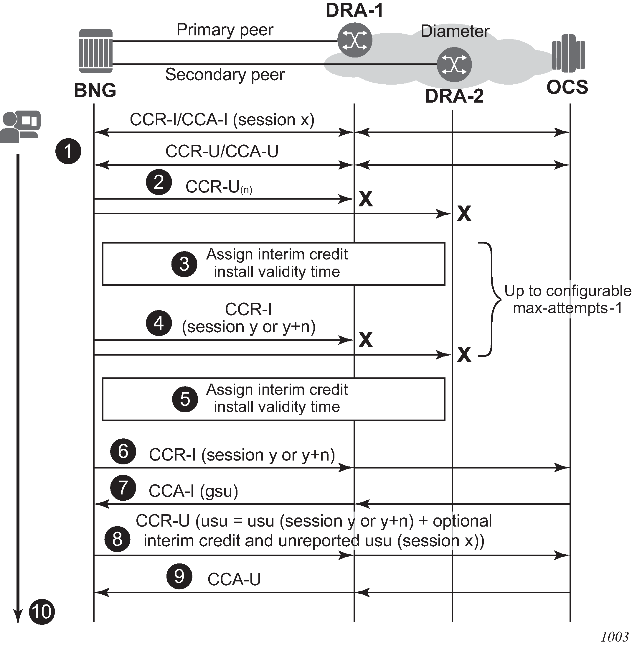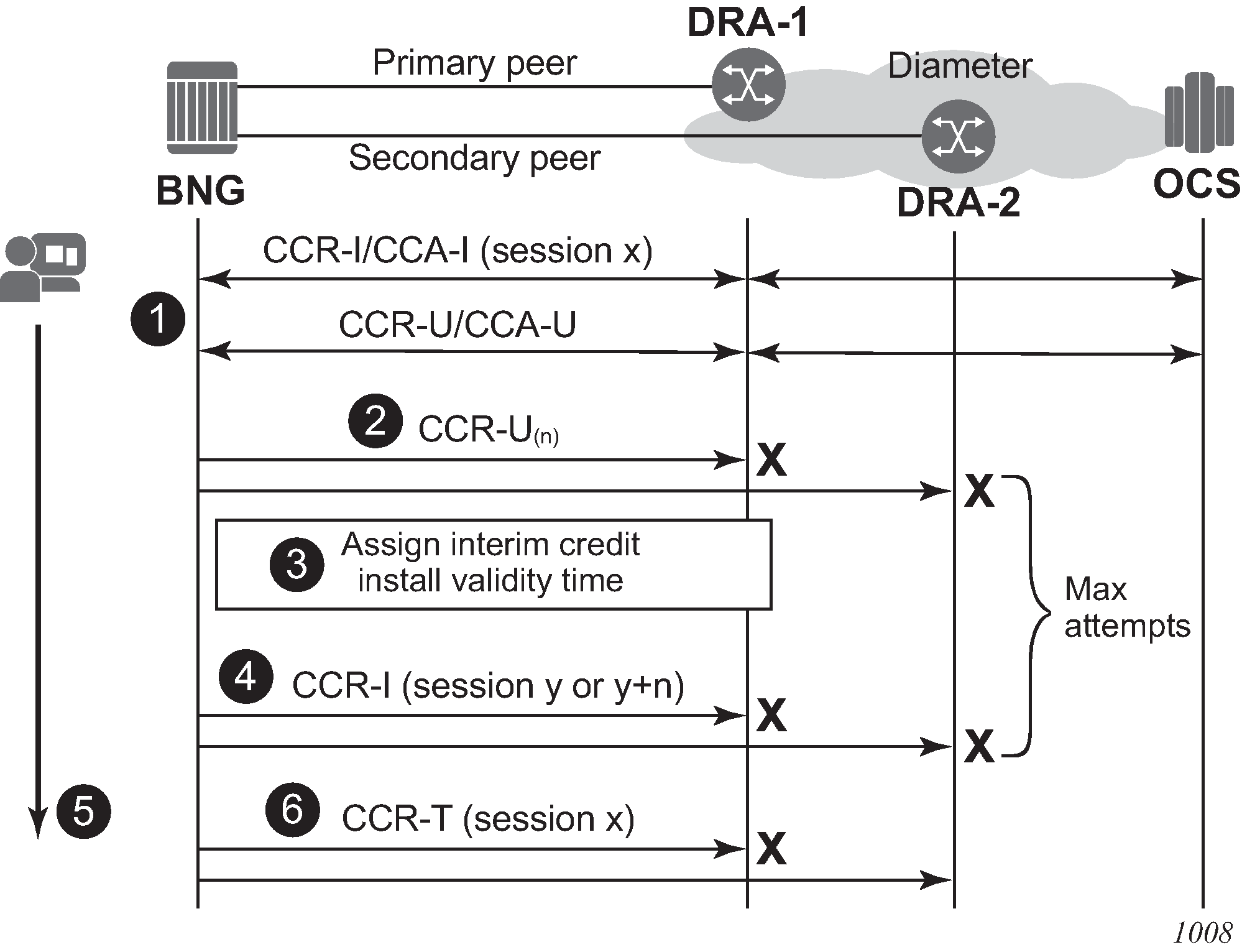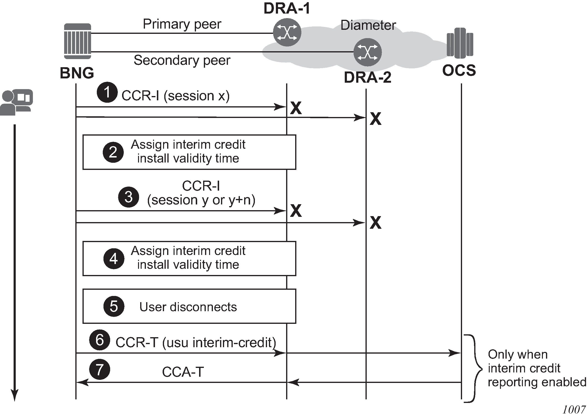 In a multichassis (or a dual-homed ) environment, an ESM subscriber is instantiated in both SR nodes. However, traffic for the subscriber is steered (in upstream and downstream direction) through the SR node with the SRRP in the Active state. Because the Diameter Base in the SR OS is not aware of the ESM subscribers and their (SRRP) states, an inter-peering Diameter connection is mandatory between the two redundant SR nodes. This peering connection is required to relay Diameter messages between the two redundant SR nodes if the SRRP is active on one node while the Diameter peering connection is open on the other node.
