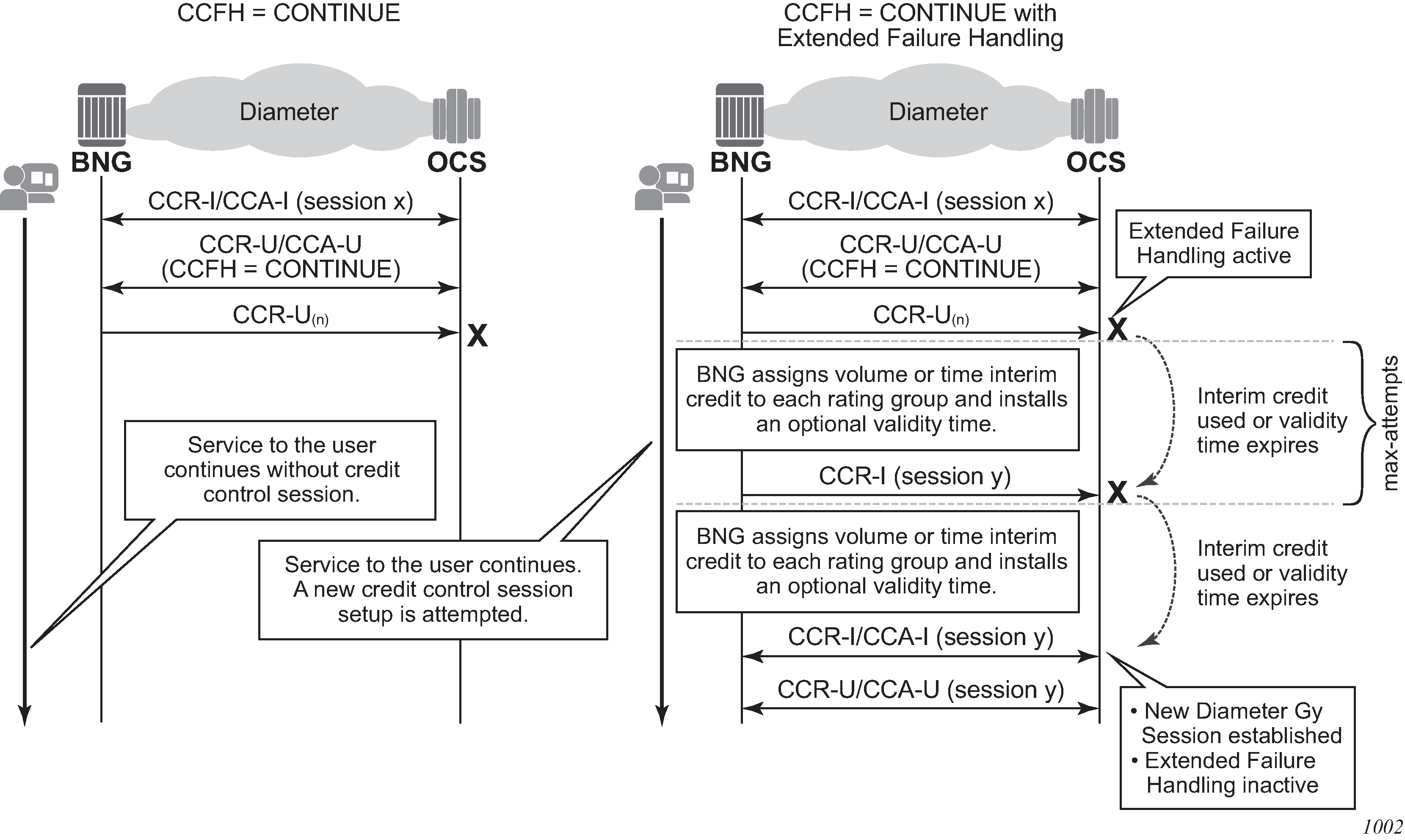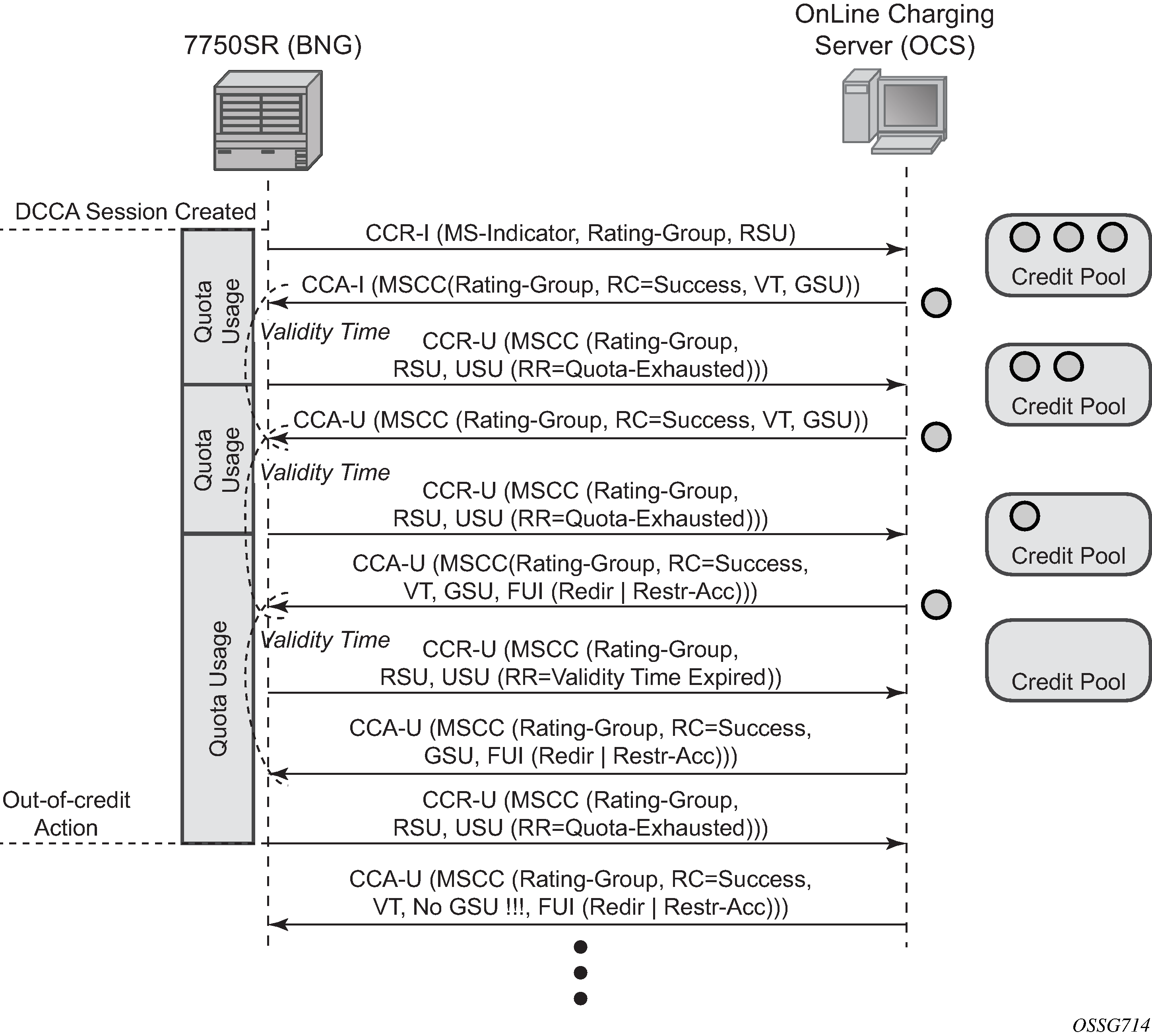 In this case, BNG continues counting. When the new quota is submitted, all consumed bytes up to this point are counted toward the new quota. For example, if 200 units are consumed since the last report, and then a new quota of 1000 units is issued, the 200 already consumed units are counted toward the new quota. For this reason, users must avoid enabling UM without the quota. This can be achieved by: