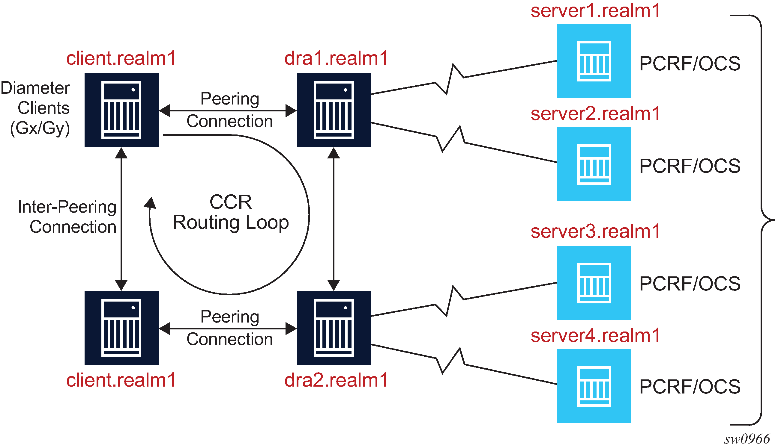 Inter-peering Diameter connection between the two redundant SR OS nodes is required to transport Diameter messages directly between them if the SR OS node with an active SRRP instance does not have a direct Diameter path to the agent or server. Instead, the messages must be sent over the inter-peering connection to the other SR OS node which is directly connected to the Diameter agent or server.