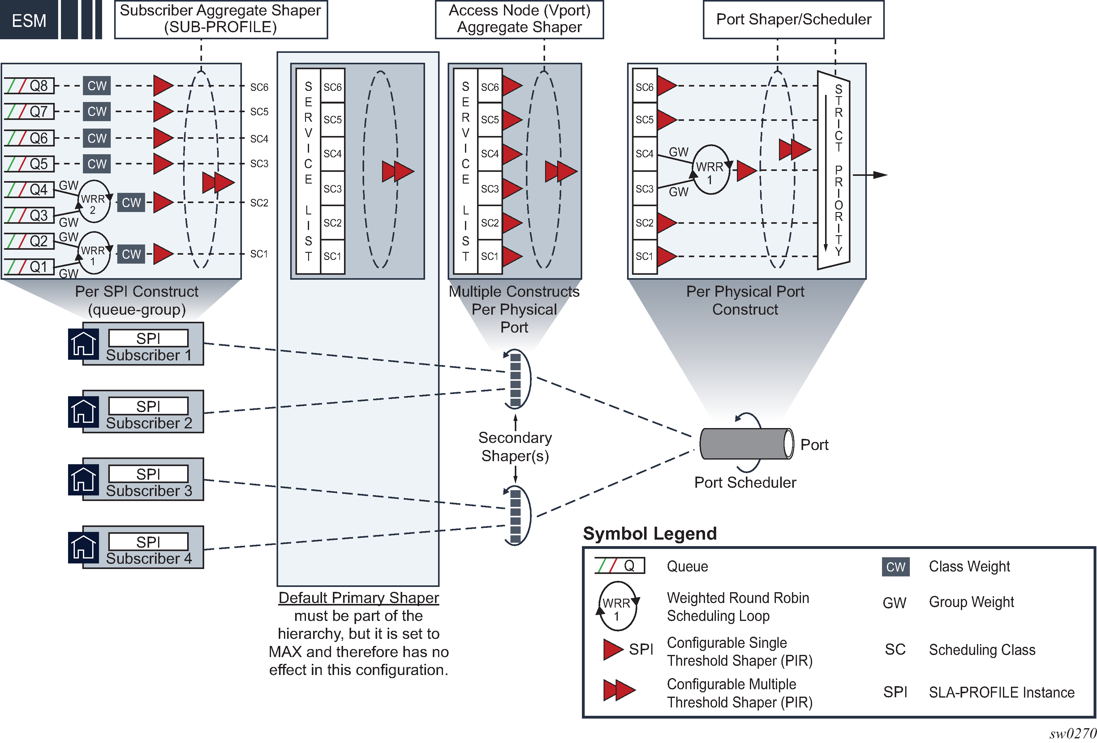 This section describes High Scale QoS (HSQ) IOM as it applies to ESM. HSQ IOM features a high scale egress traffic manager with an expansive set of QoS capabilities that are particularly suitable for ESM applications. Refer to the 7450 ESS, 7750 SR, 7950 XRS, and VSR Quality of Service Guide for detailed information about HSQ.