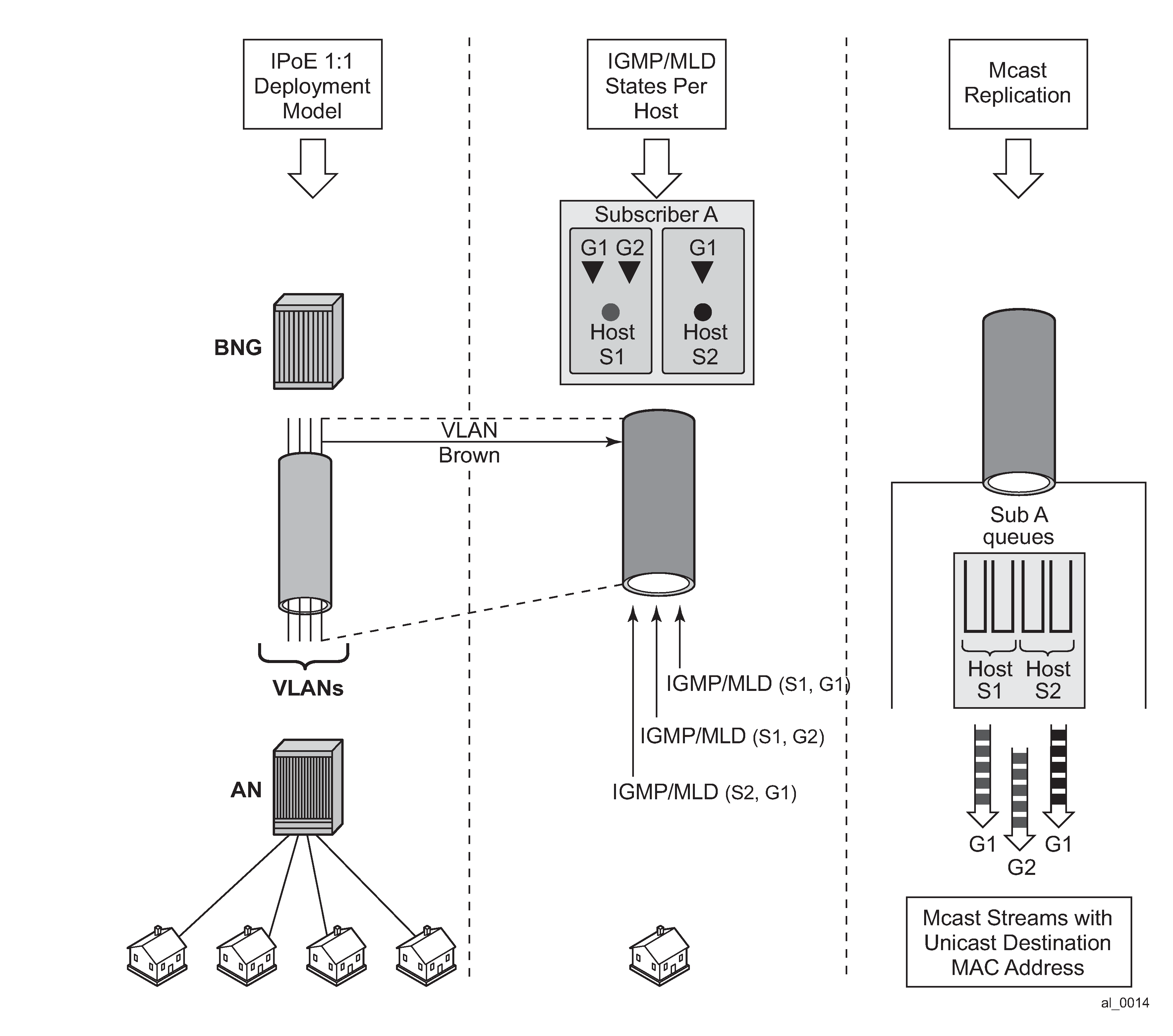 MLD message processing differs from IGMP. An IPv6 host can have two WAN IPv6 addresses and an IPv6 prefix. MLD messages source address are link local addresses. This makes it difficult to know if the originating host is a WAN host or a PD host. By default, all requested IPv6 (s,g) are first associated with a WAN host. If this WAN host disconnects or ends its IPv6 session, the (s,g) is then associated with the remaining WAN host. If there are no more WAN hosts, the (s,g) is then associated with the remaining PD host. The (s,g) is always transferred to the remaining IPv6 host until there are no more report replies to corresponding to the queries. Scenarios A — F do not differ for IPv6 hosts.