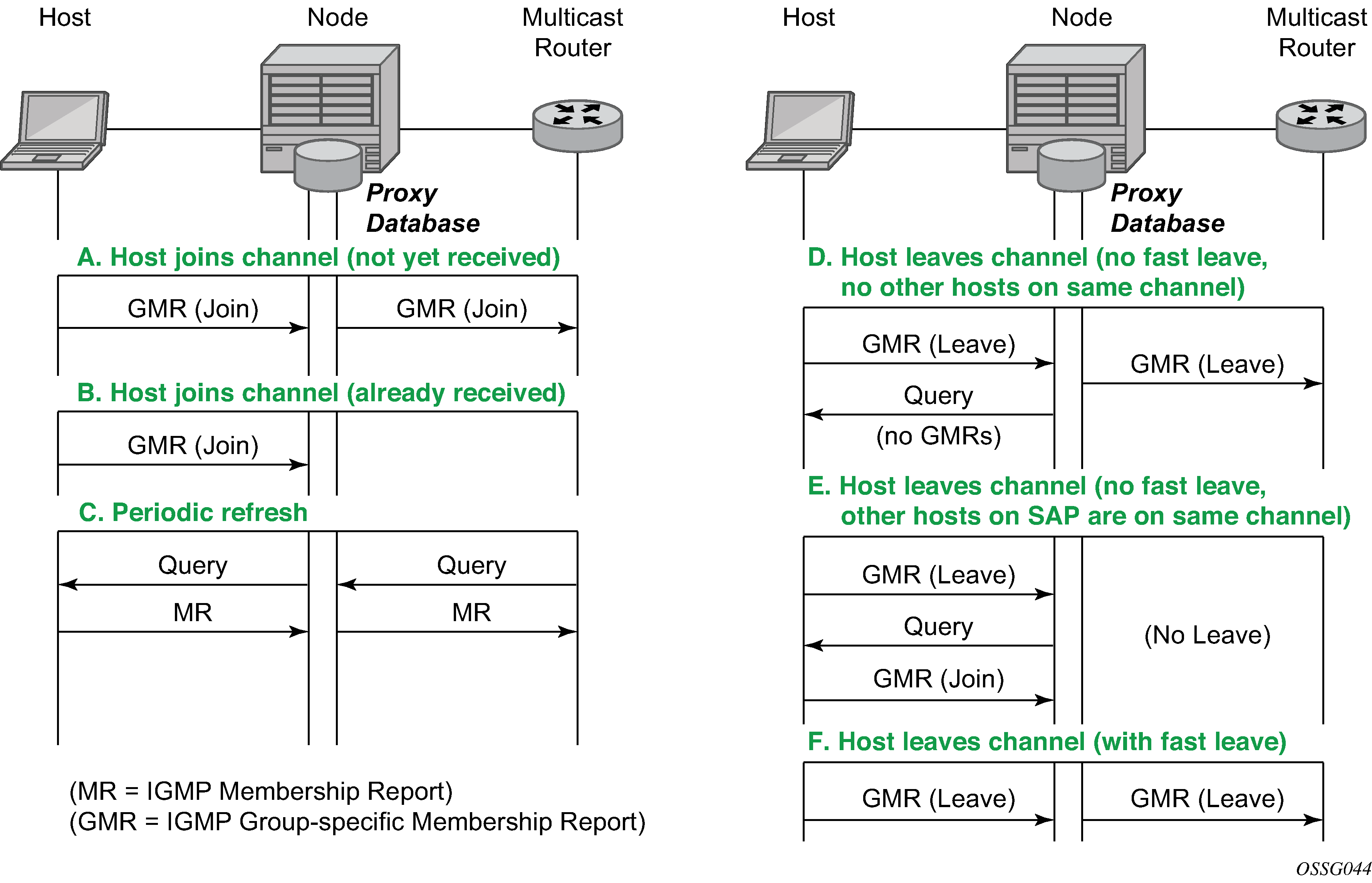 Scenario F: A host leaves a channel by sending an IGMP leave report. Fast-leave is enabled, so the router does not check whether there are other hosts on the same SAP or spoke SDP but immediately removes the group from the SAP. In addition, if there are no other SAPs or spoke SDPs with hosts subscribing to the same group, the group is removed from the proxy database and an IGMP leave report is sent to the upstream multicast router.